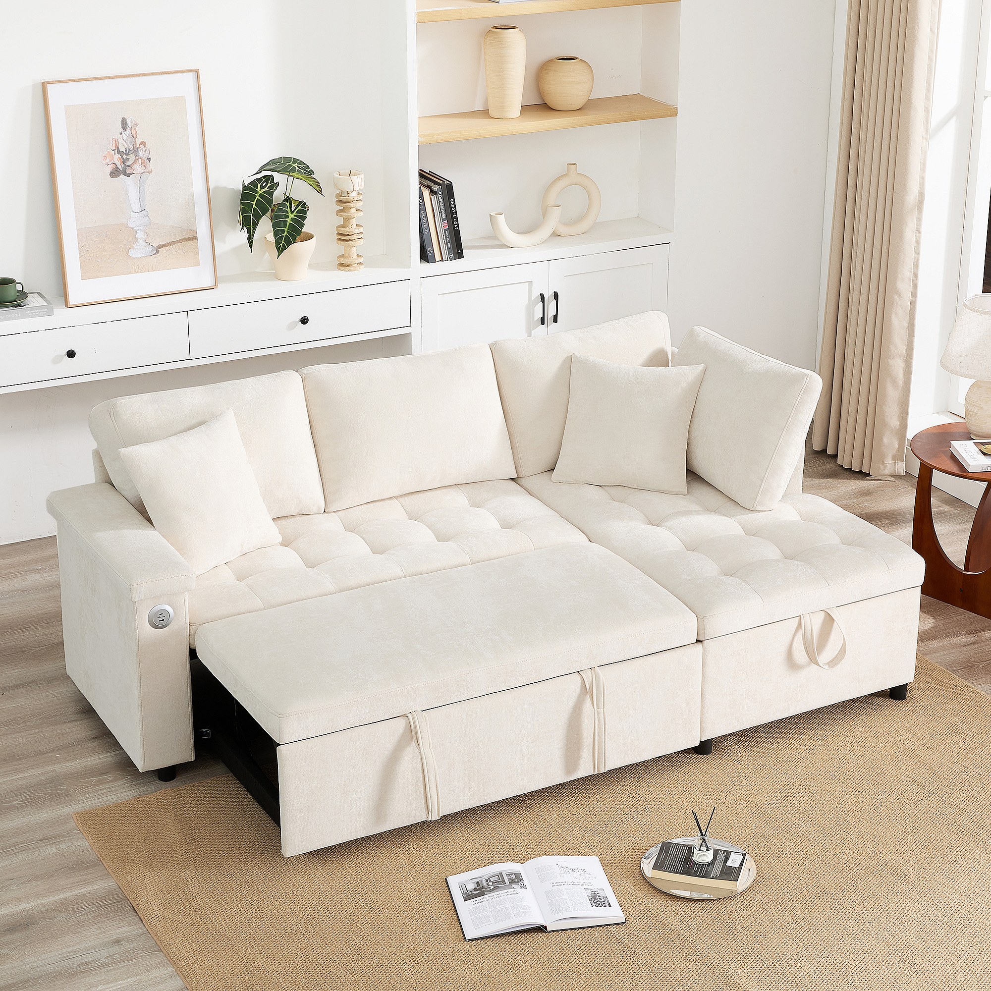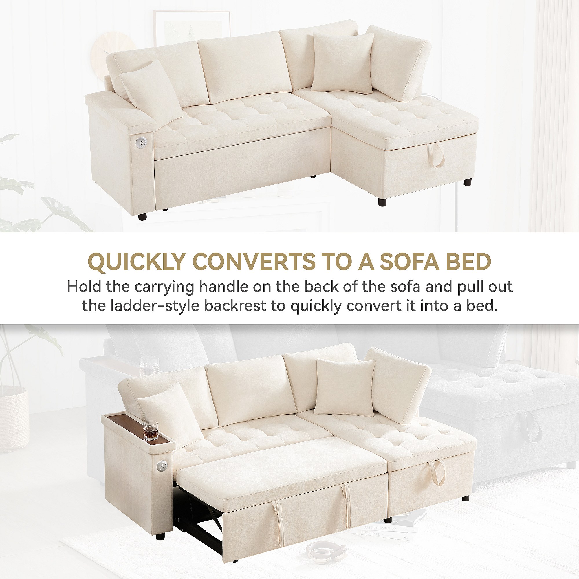 Canapé 3 places convertible gigogne avec rangement - 209 x 130 x 84 cm - avec USB + 2 oreillers - velours - beige