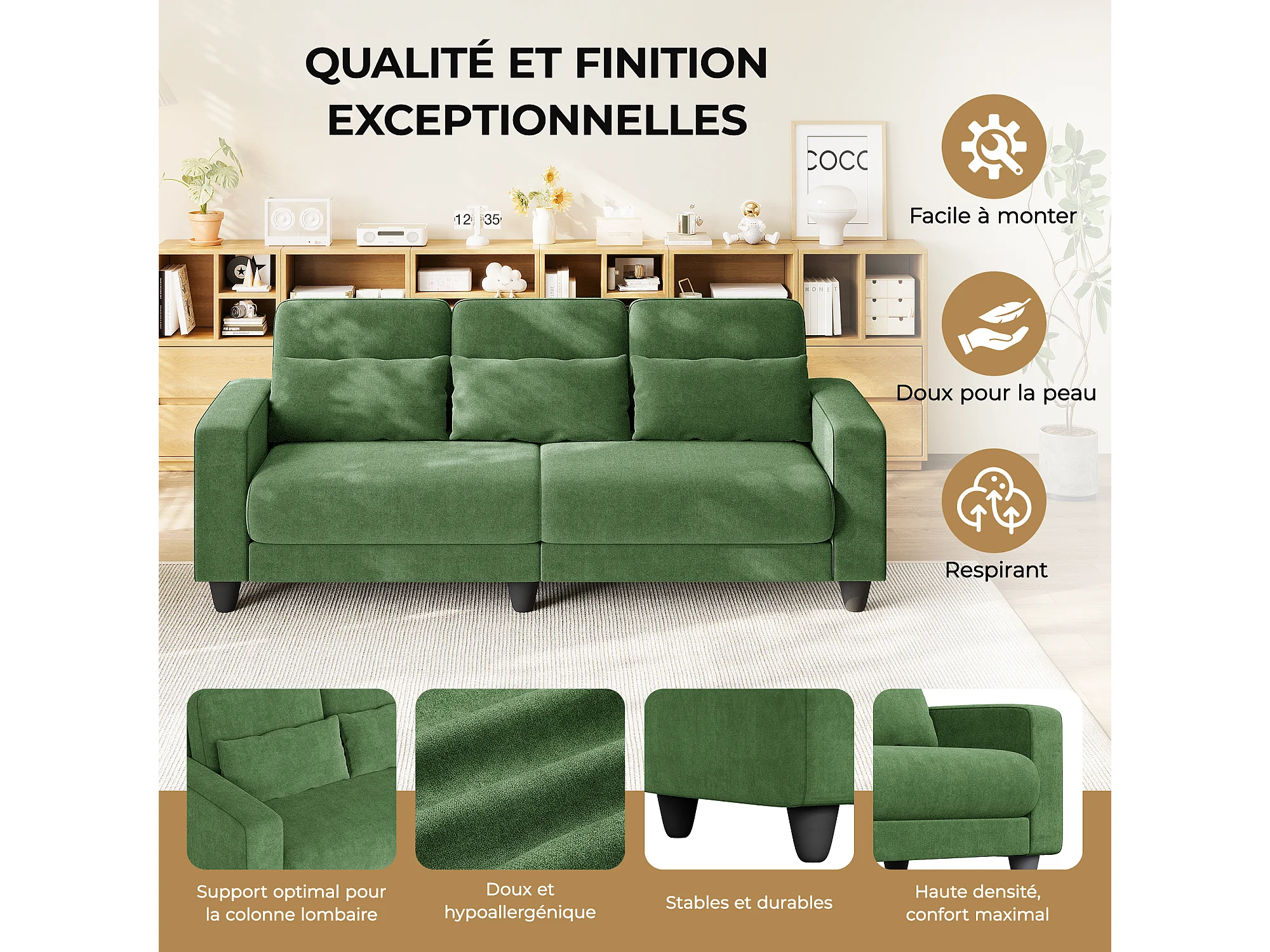 Canapé 3 places en tissu chenille vert - avec 3 oreillers - housse de coussin amovible lavable - 220x81x88cm