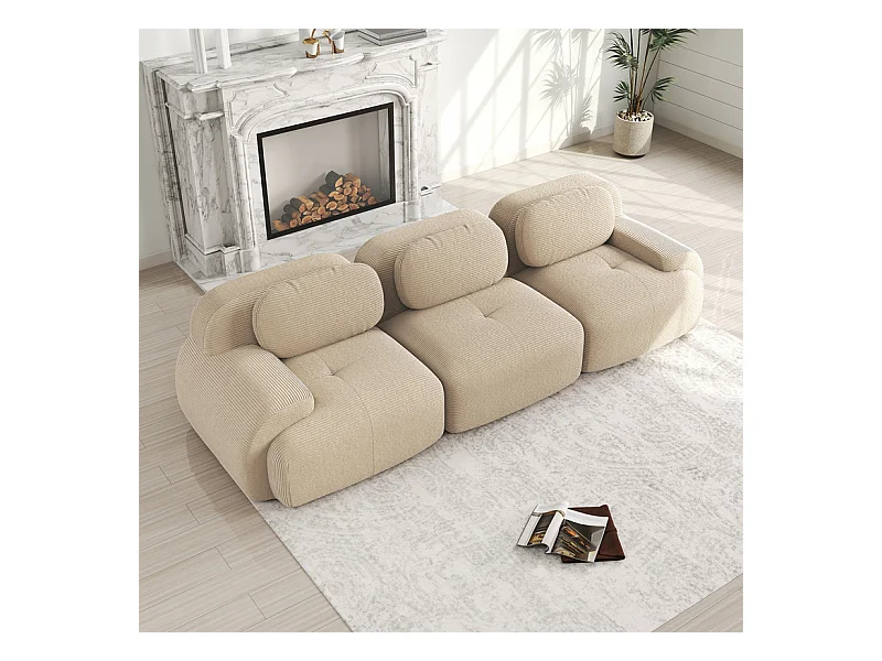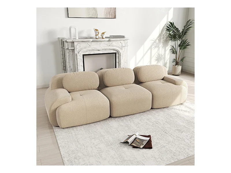 Canapé 3 places modulable en Velours côtelé - avec 3 oreillers - 298x103x75cm - Beige