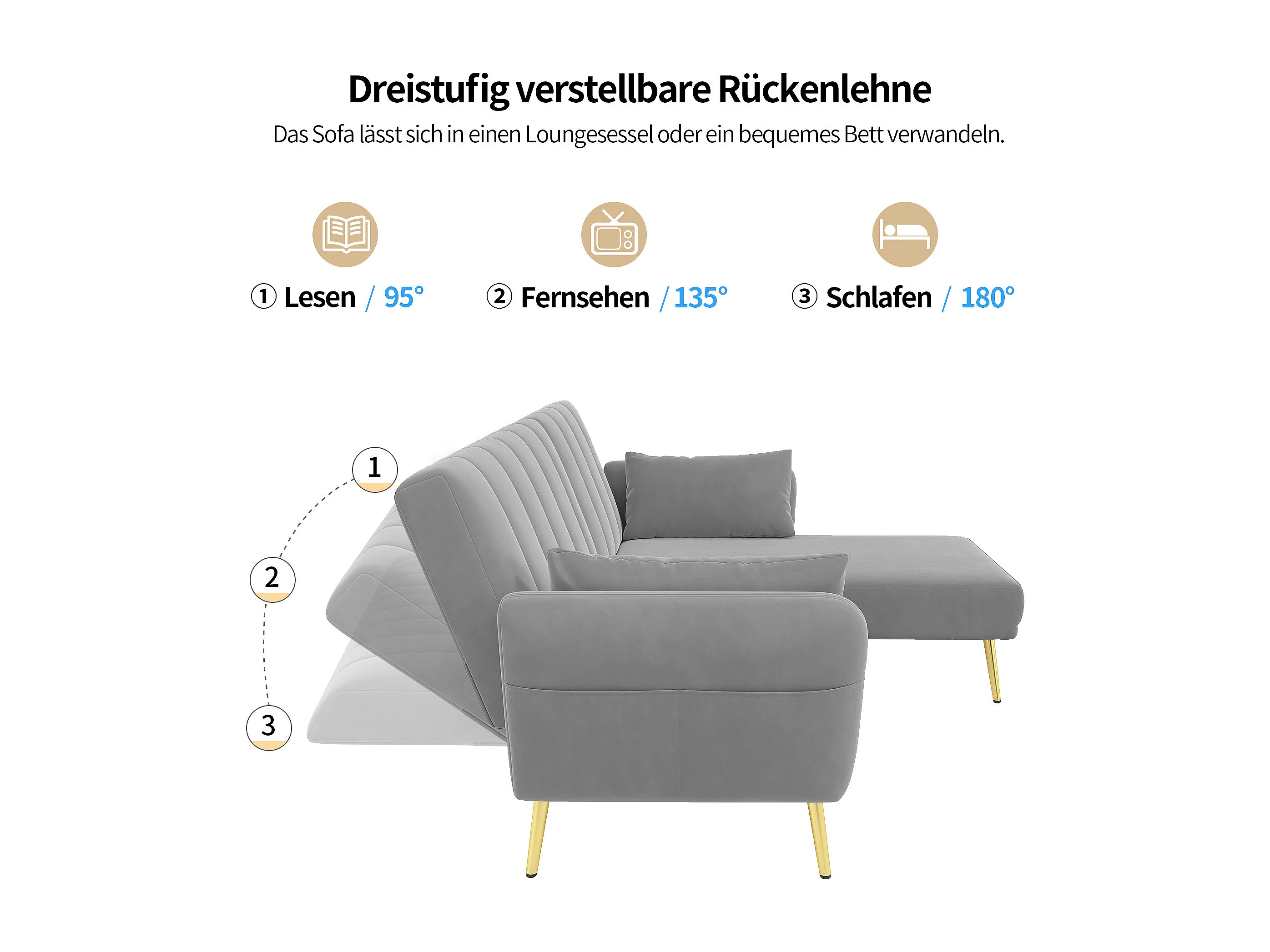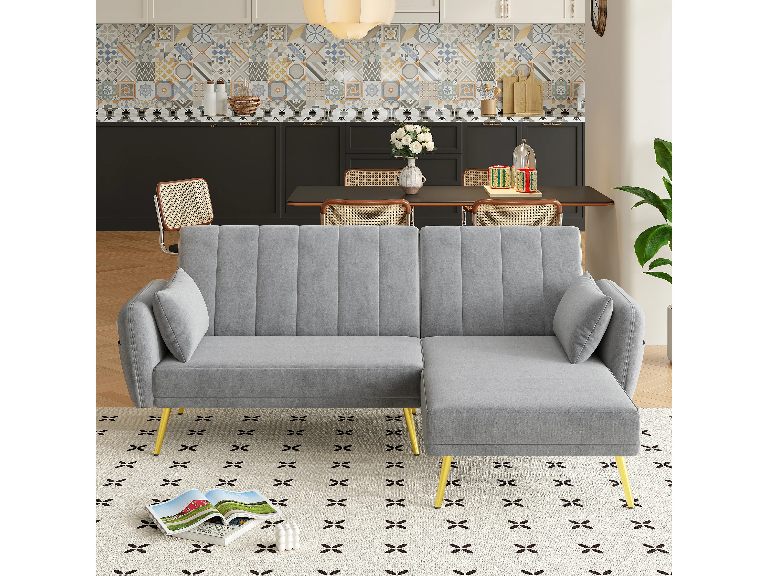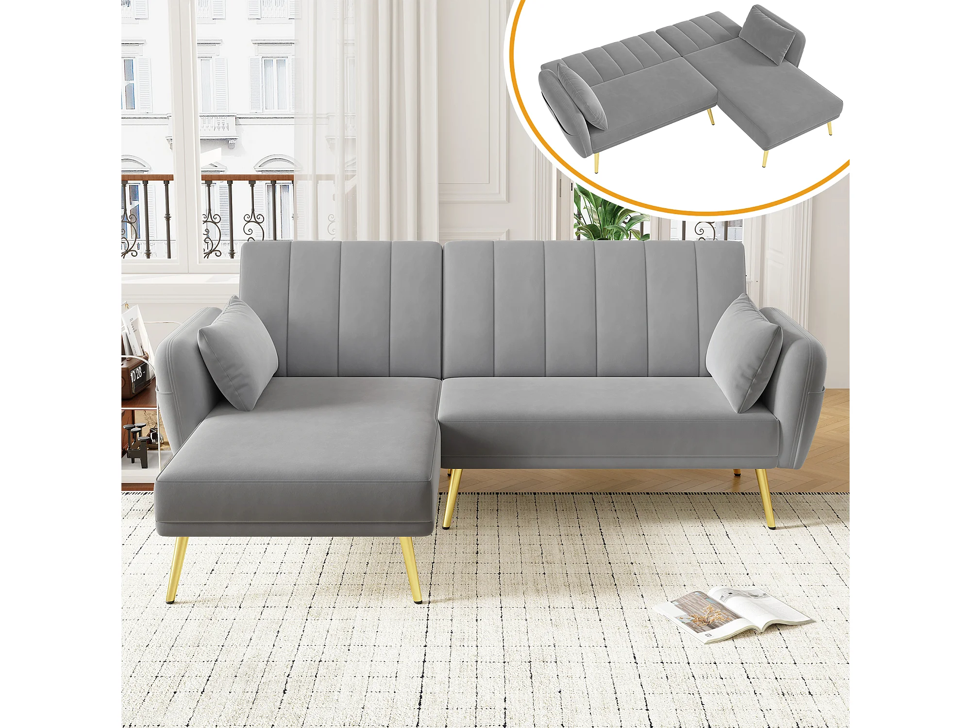 Canapé 3 places pliant - 191.5 x 130 x 80 cm - canapé d'angle avec fonction couchage - velours - gris