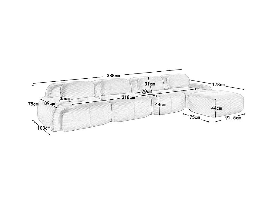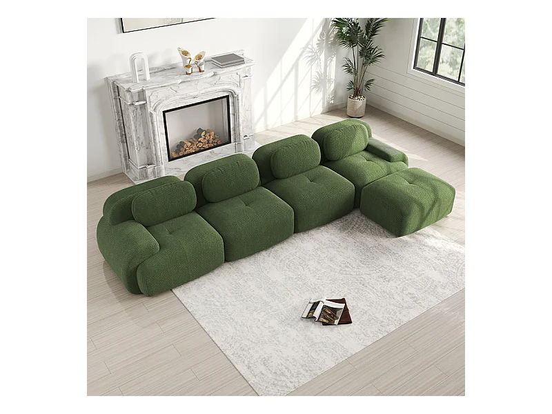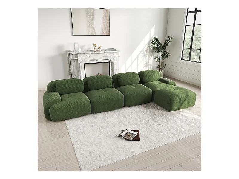 Canapé 4 places d'angle modulable - en Velours côtelé - avec 4 oreillers et pouf - 388x178x75cm - Vert