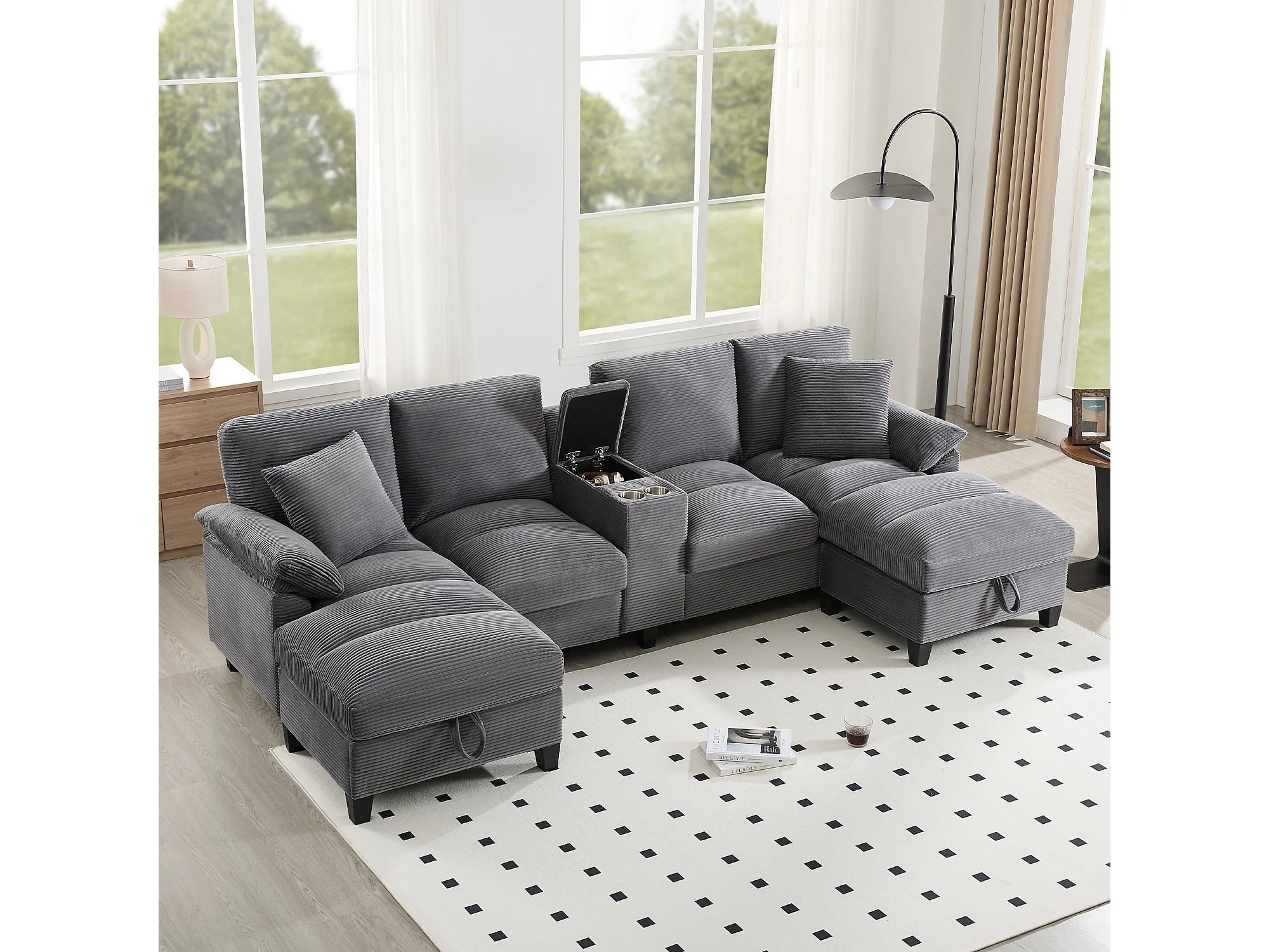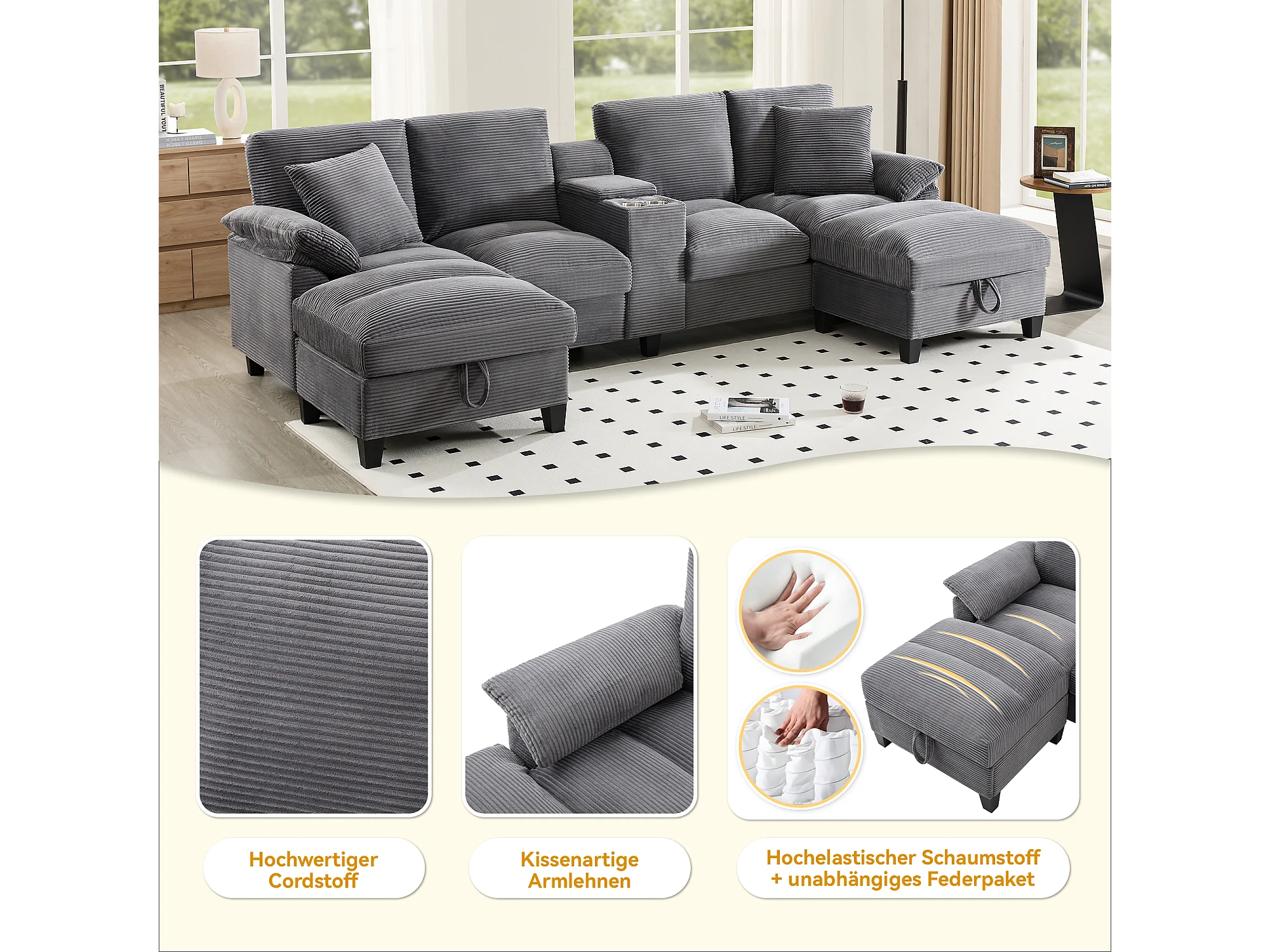 Canapé 4 places en forme de U avec rangement + porte-gobelets + ports USB - 293 x 142 x 93 cm - Velours - gris