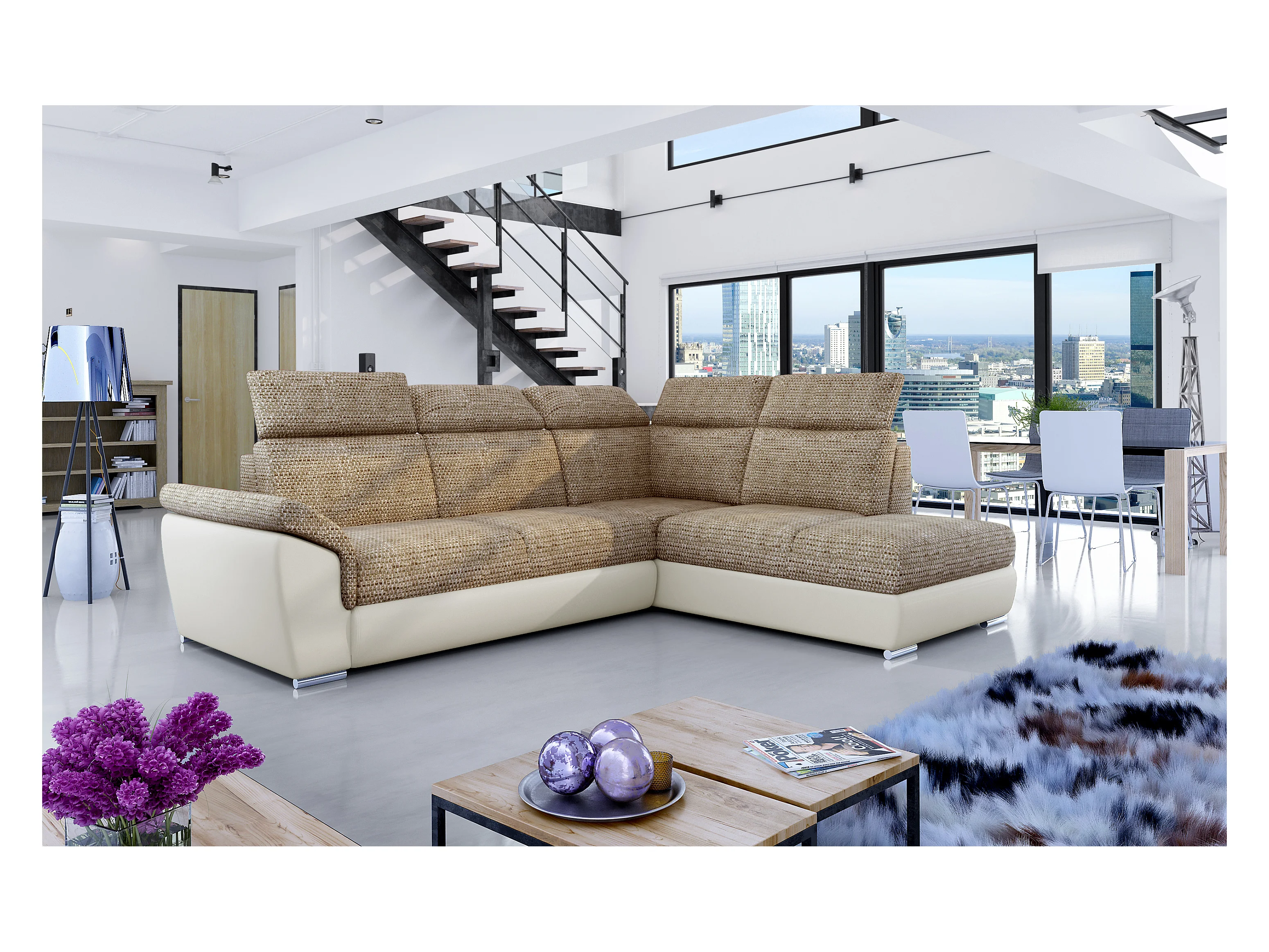 Canapé angle gauche convertible tissu beige chiné et simili beige avec appuis-tête réglables Kepita 260cm