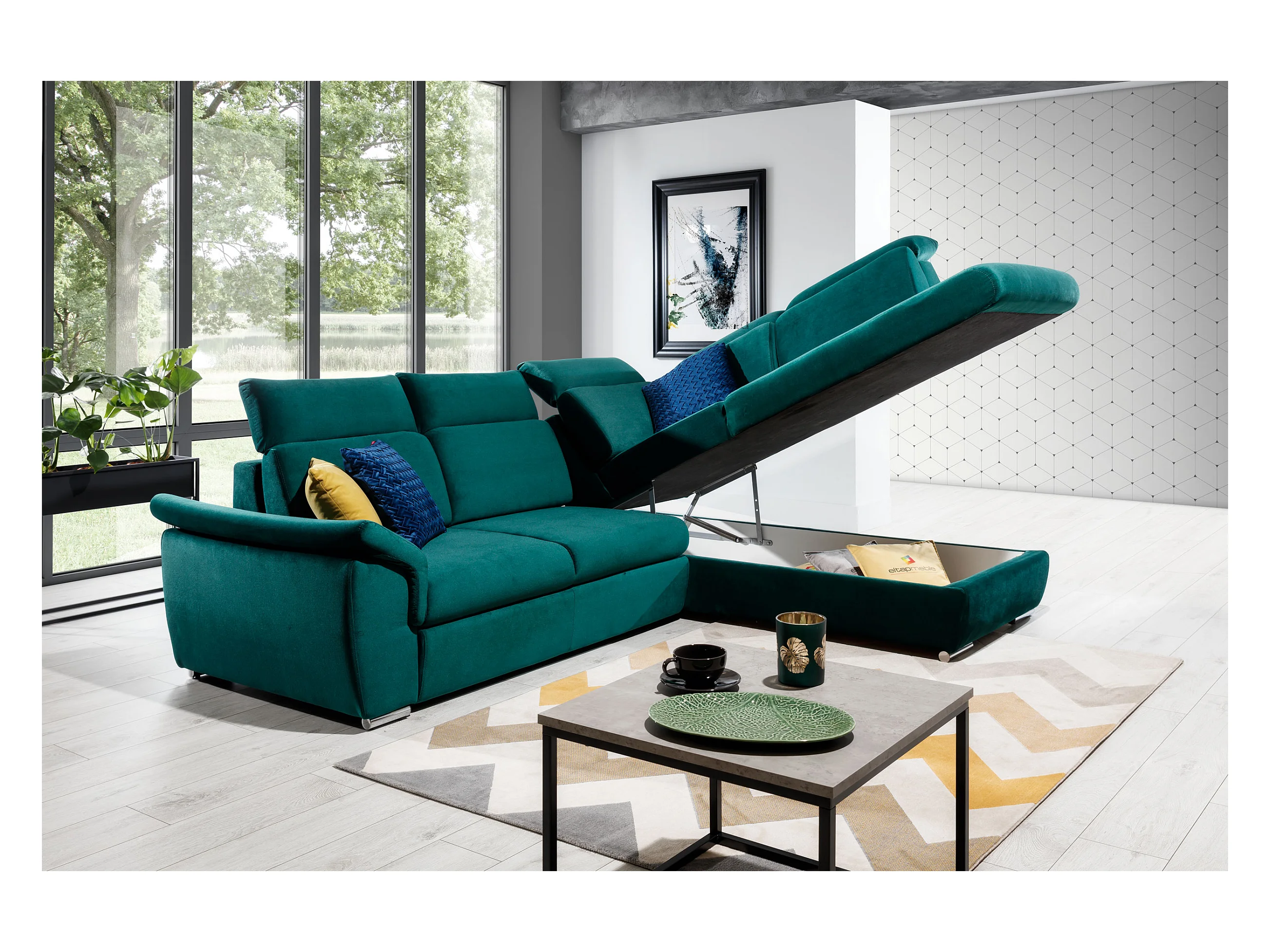 Canapé angle droit convertible tissu beige chiné et simili beige avec appuis-tête réglables Kepita 260cm