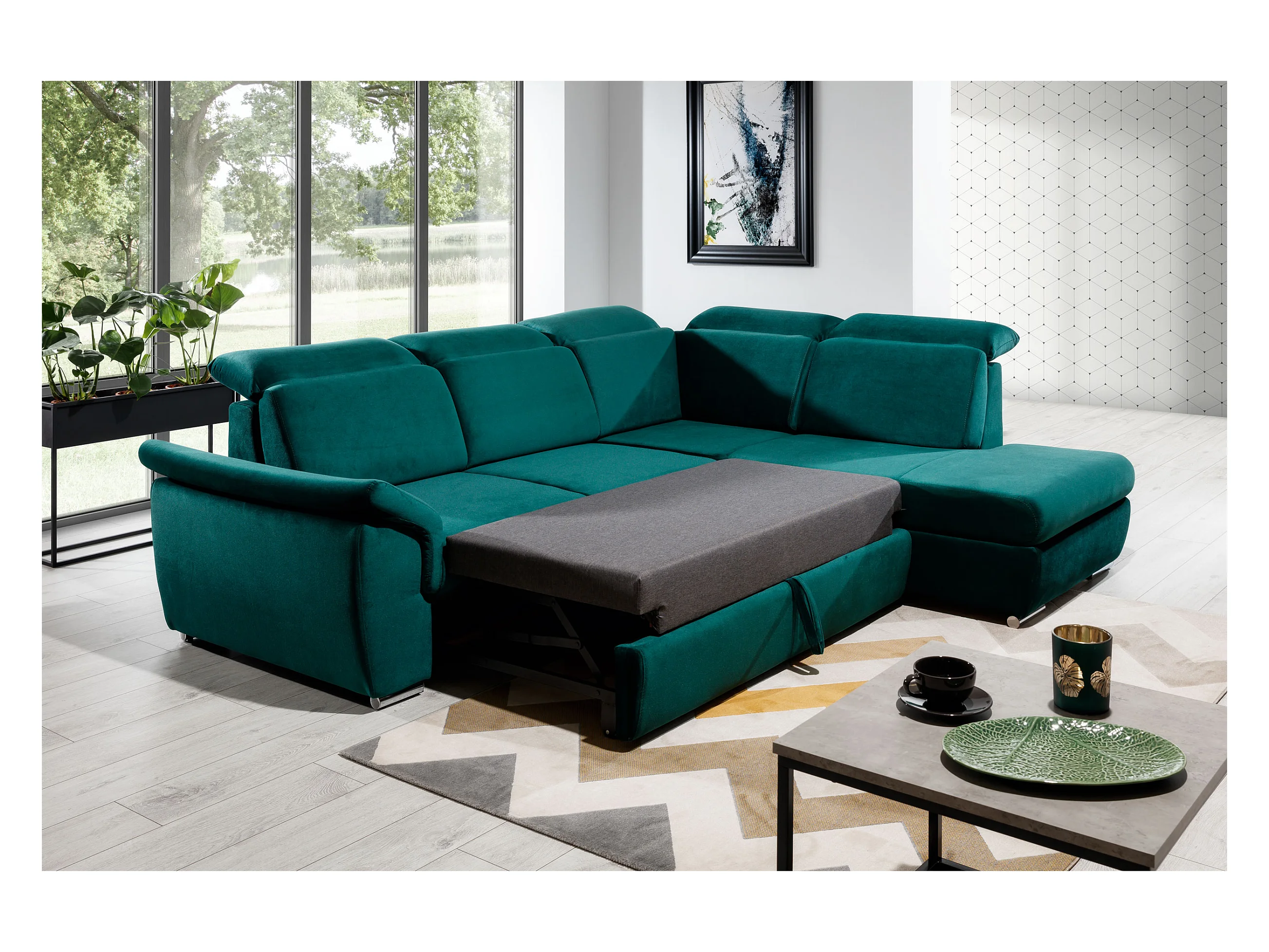 Canapé angle droit convertible tissu beige chiné et simili beige avec appuis-tête réglables Kepita 260cm