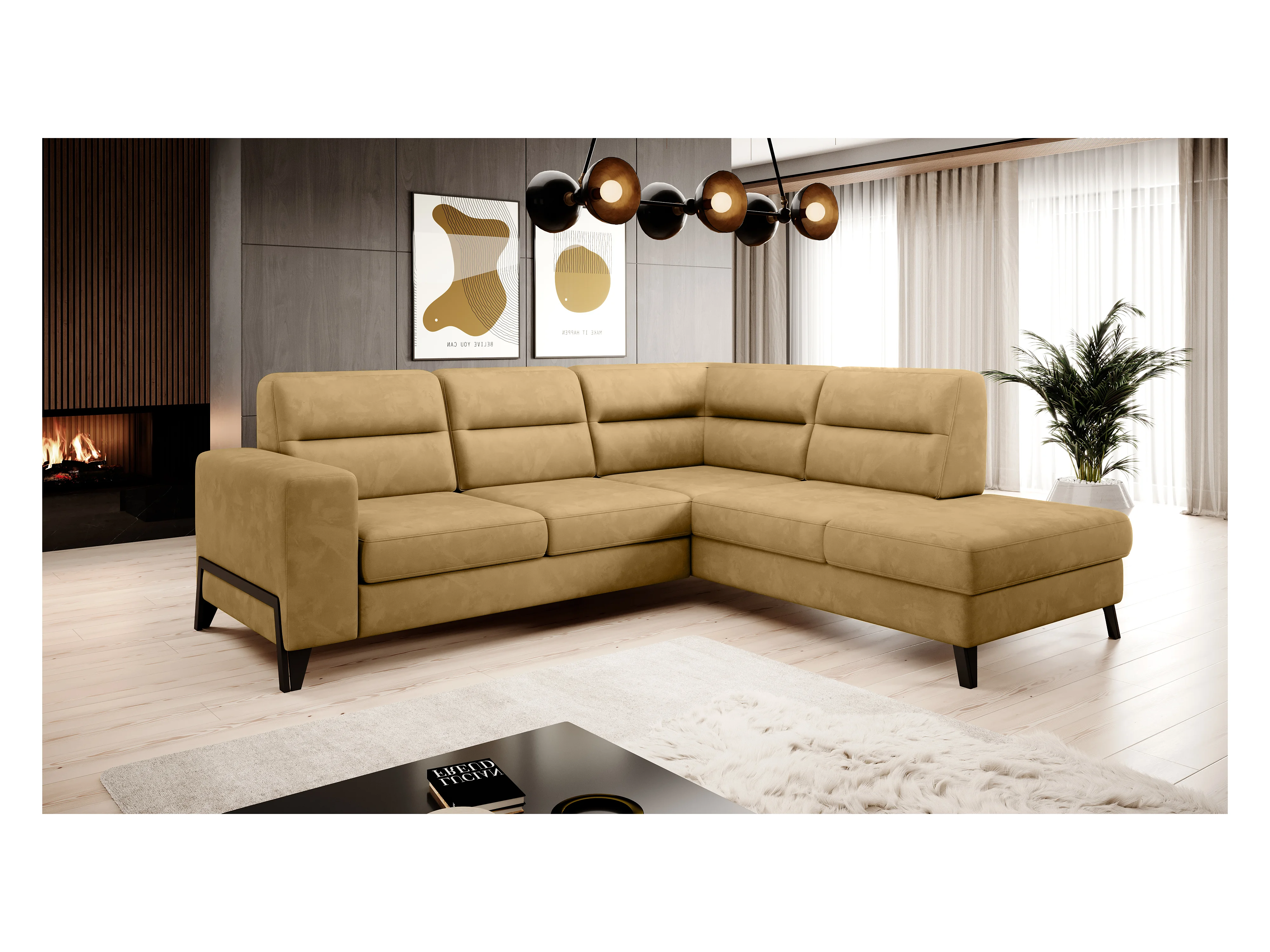 Canapé angle droit convertible tissu jaune et pieds acier noir Kassidi 277cm