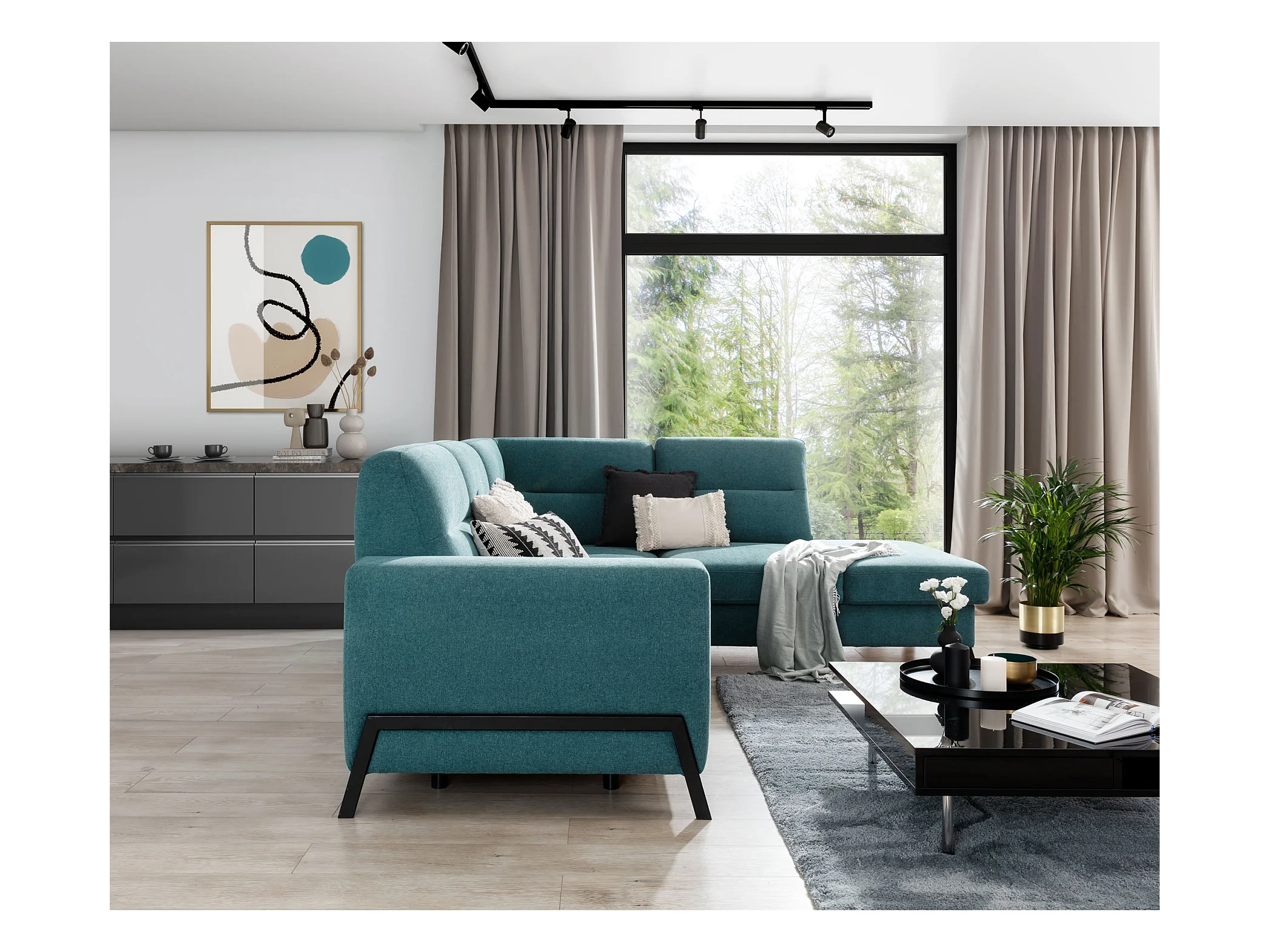 Canapé angle gauche convertible tissu jaune et pieds acier noir Kassidi 277cm