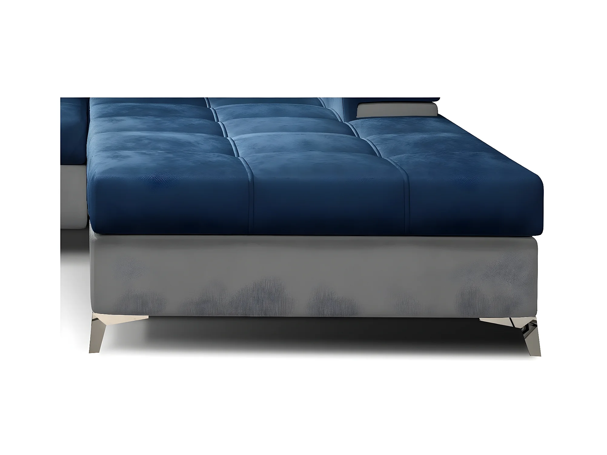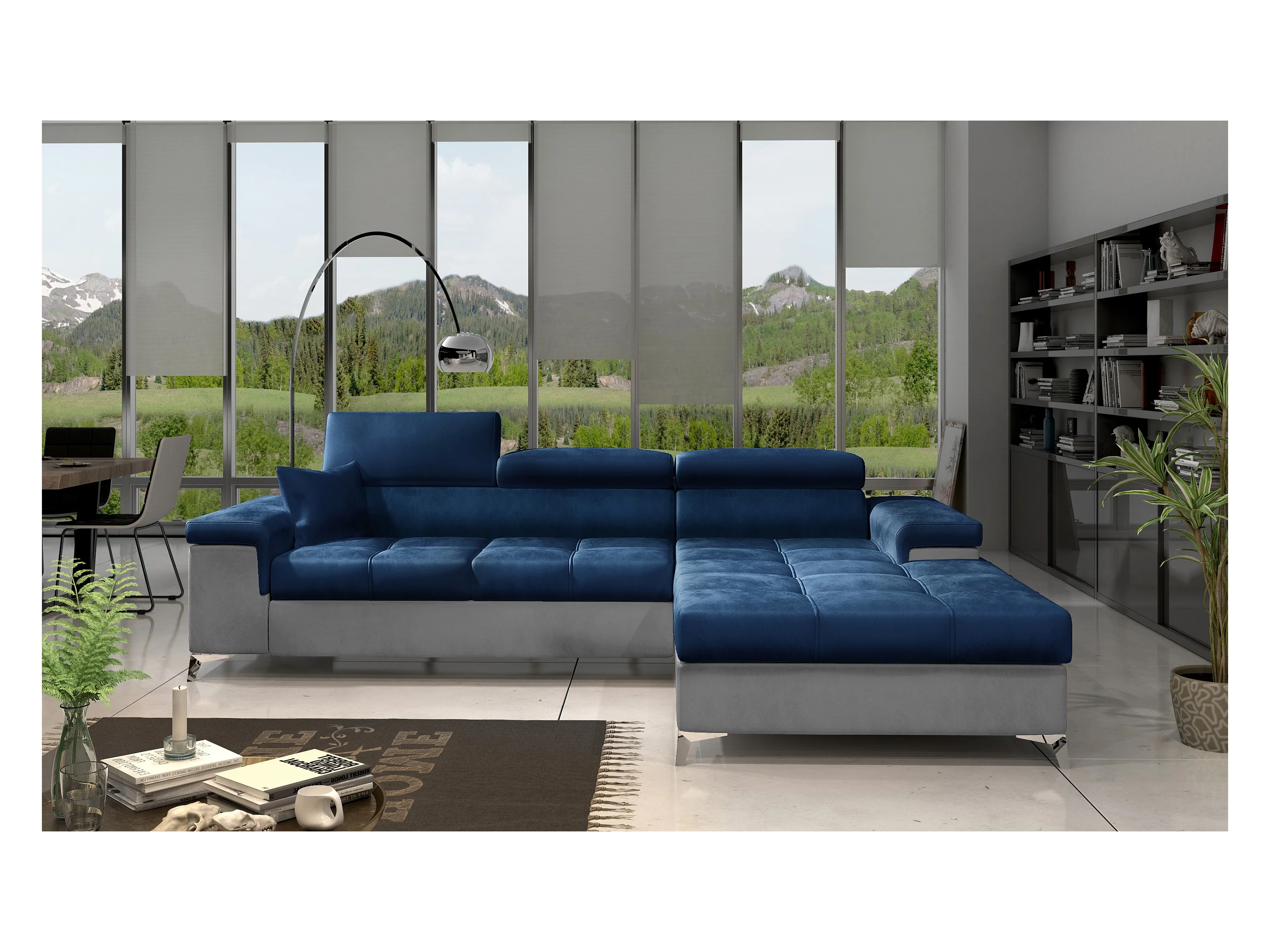 Canapé angle droit convertible velours bleu marine et gris clair avec appuis-tête réglables Rikaro 280cm