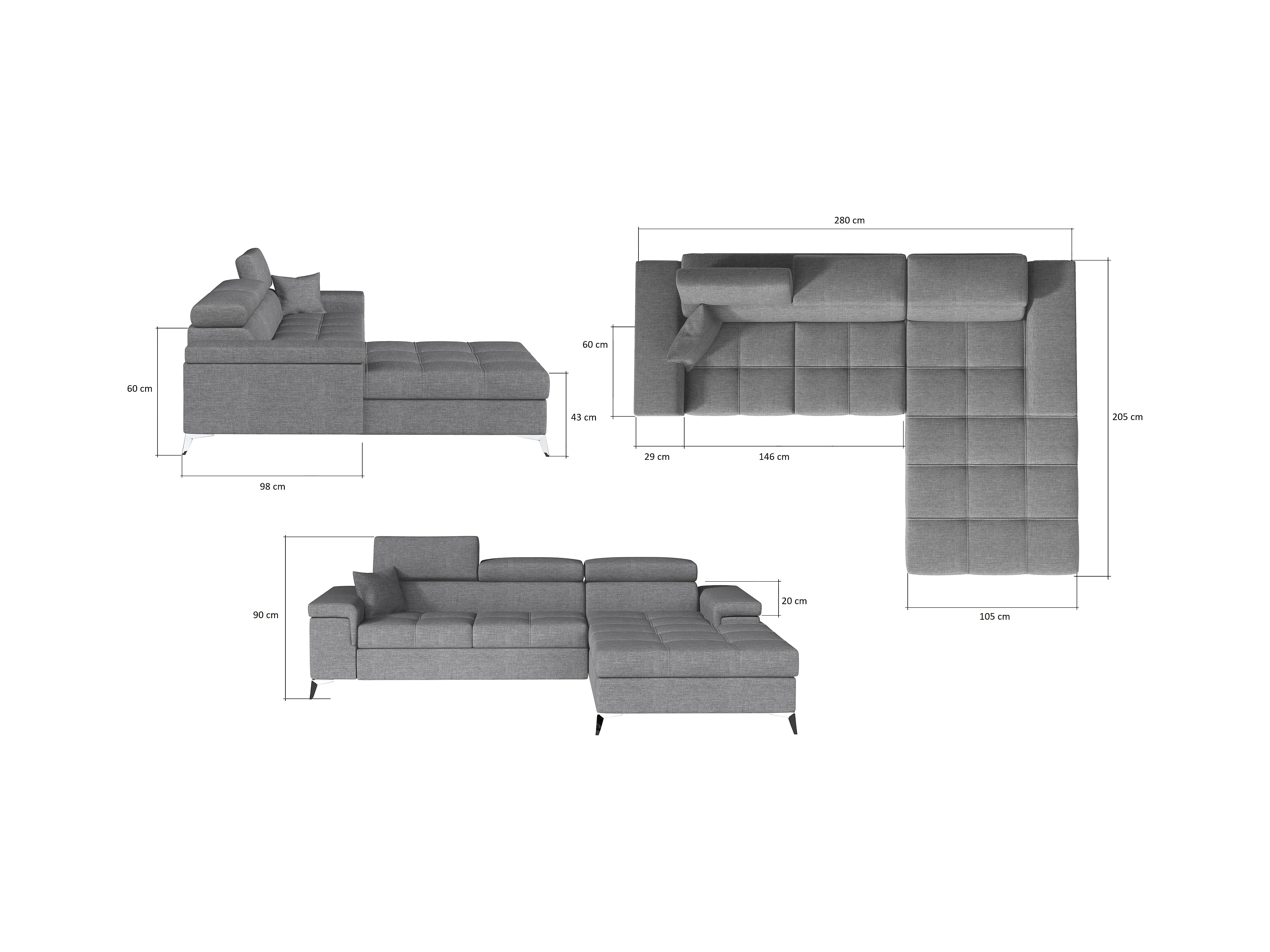 Canapé angle droit convertible tissu gris clair et simili noir avec appuis-tête réglables Rikaro 280cm