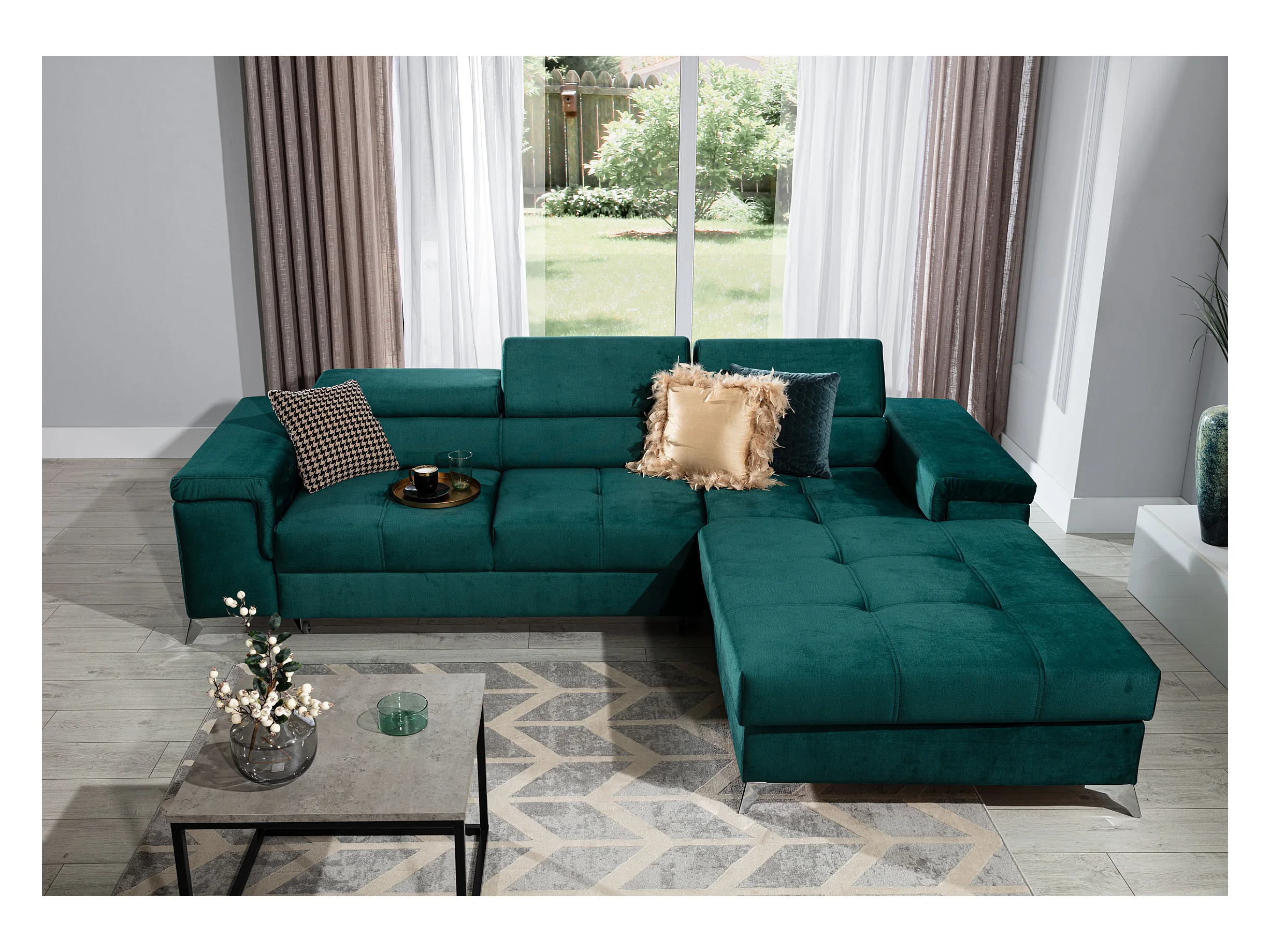 Canapé angle gauche convertible velours bleu marine et gris clair avec appuis-tête réglables Rikaro 280cm