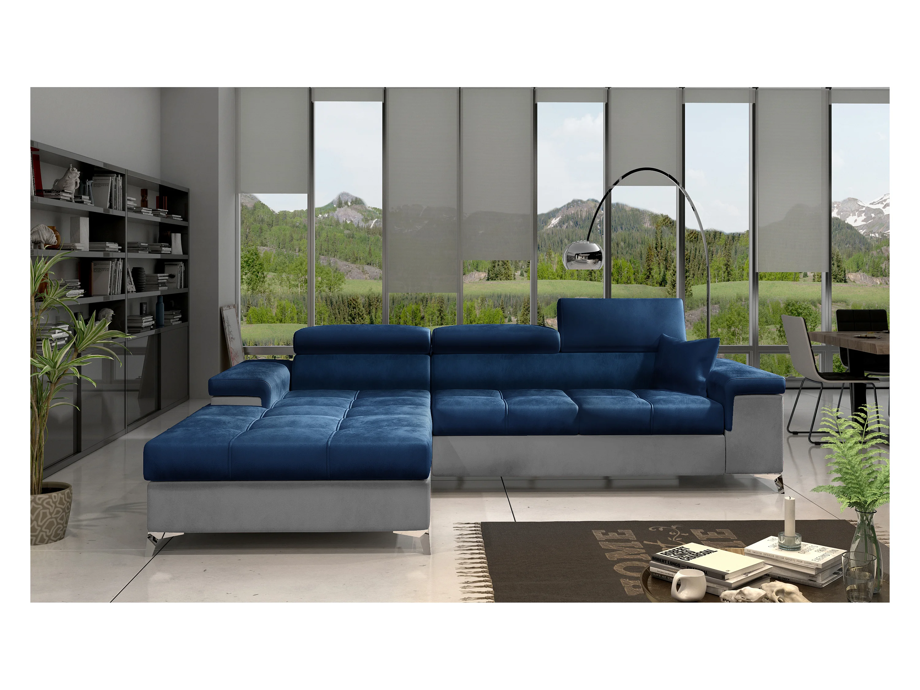 Canapé angle droit convertible velours bleu marine et gris clair avec appuis-tête réglables Rikaro 280cm