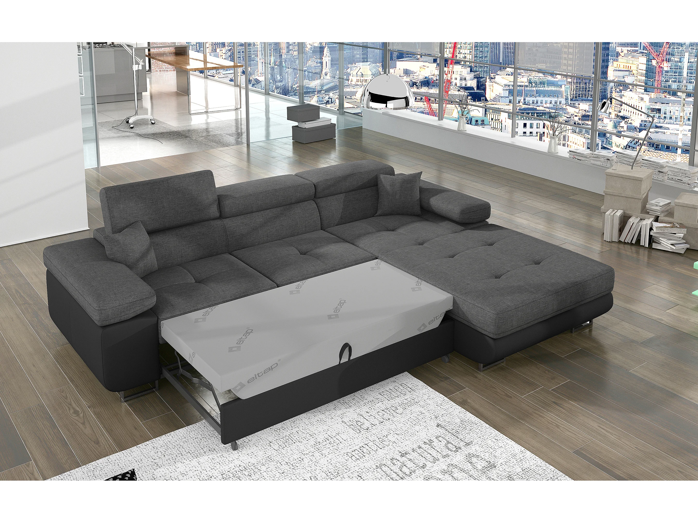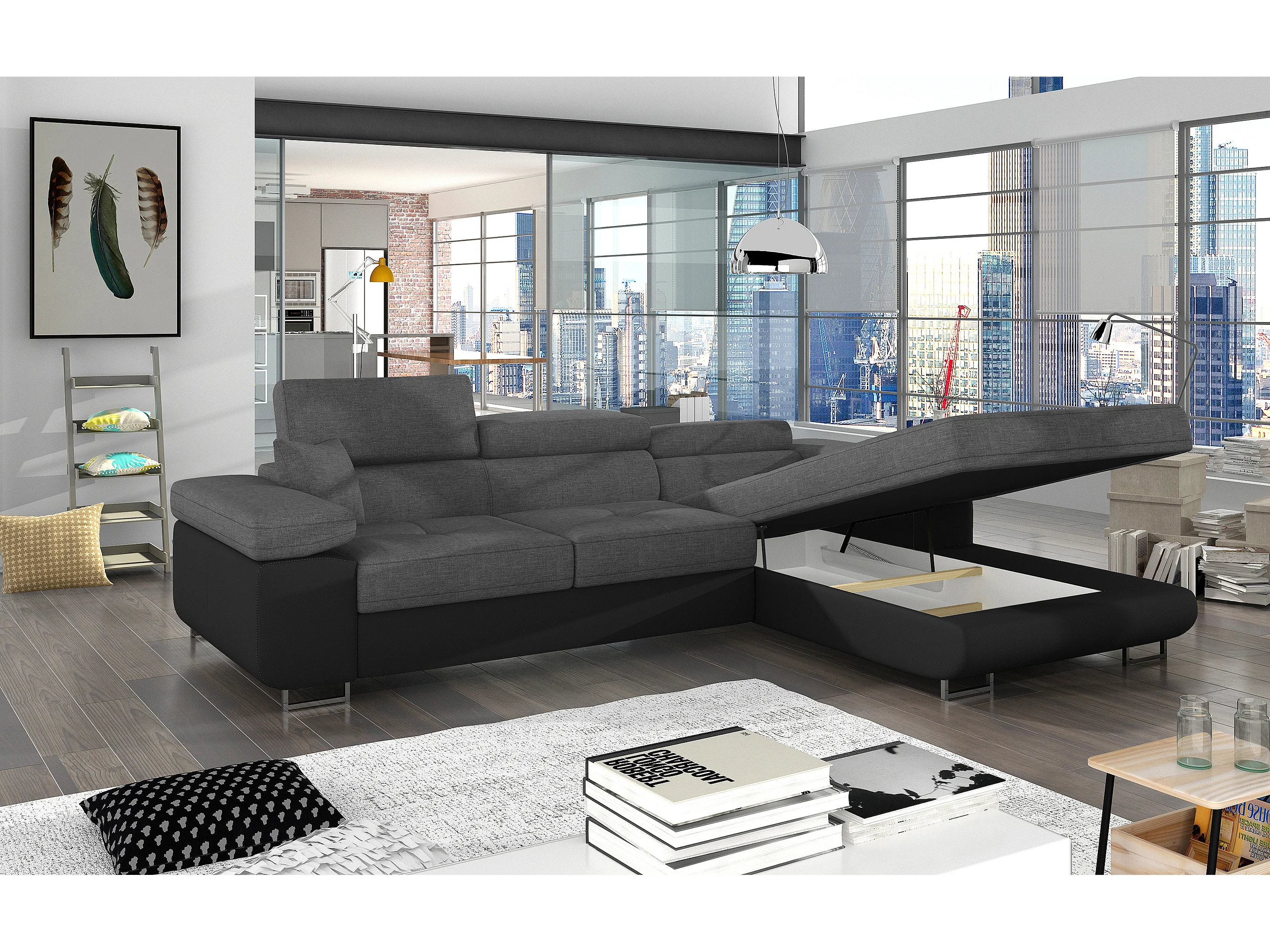 Canapé d'angle convertible appuis-tête réglables KALIZO - Coffre et pieds acier chromé-Gris/Gris clair-angle gauche