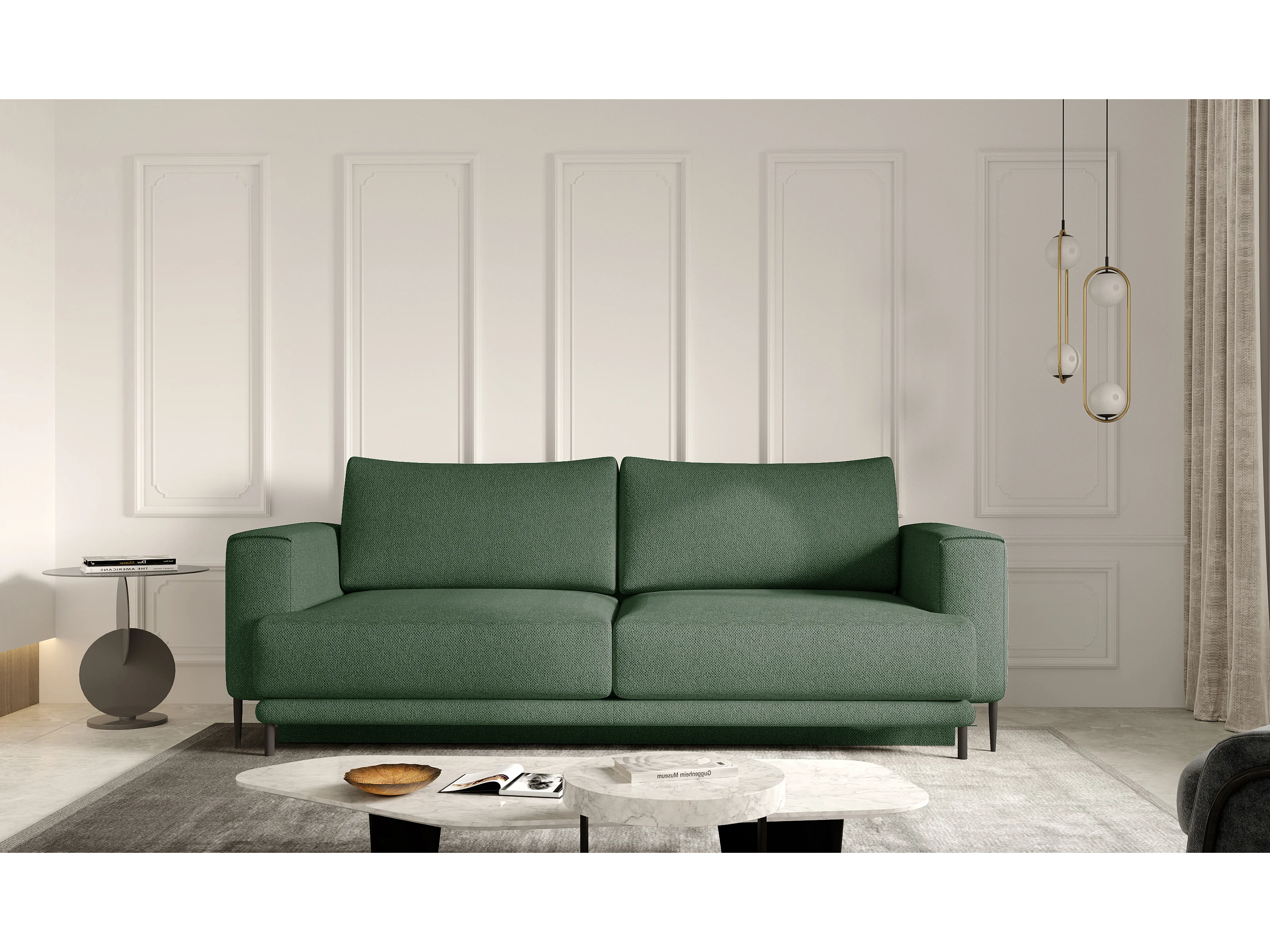 Canapé droit convertible 3 places tissu DAVINA 246cm - Coffre & pieds métal noir-Vert céladon