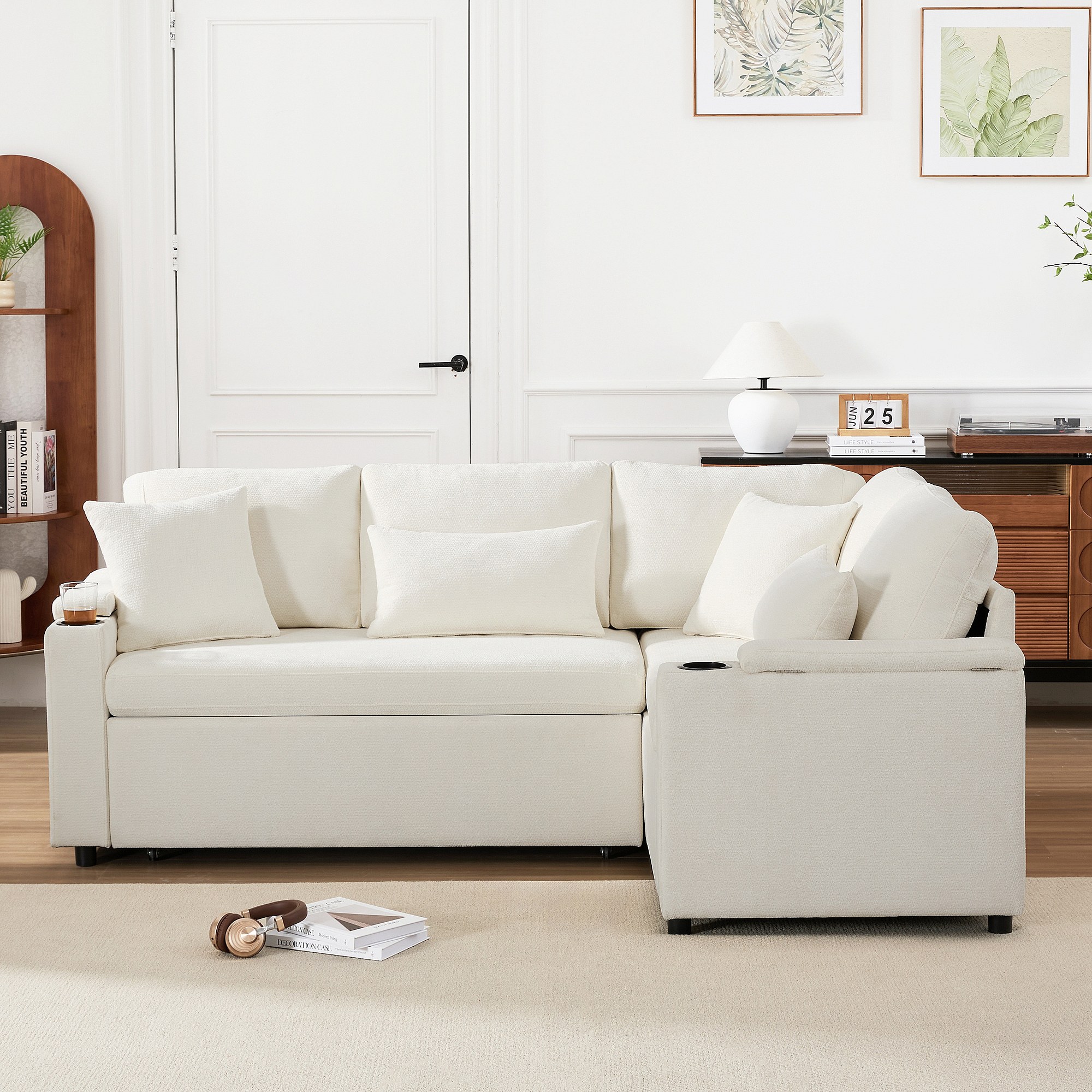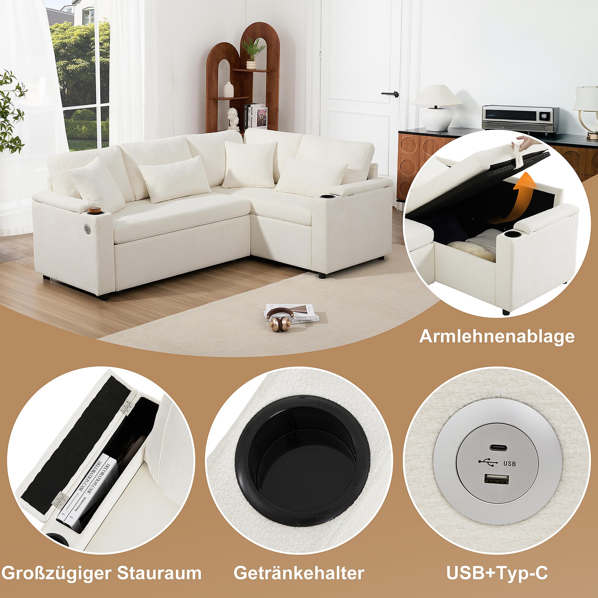 Canapé convertible extensible avec rangement - 206.5 x 141 x 86 cm - avec USB + 2 coussins - velours - beige