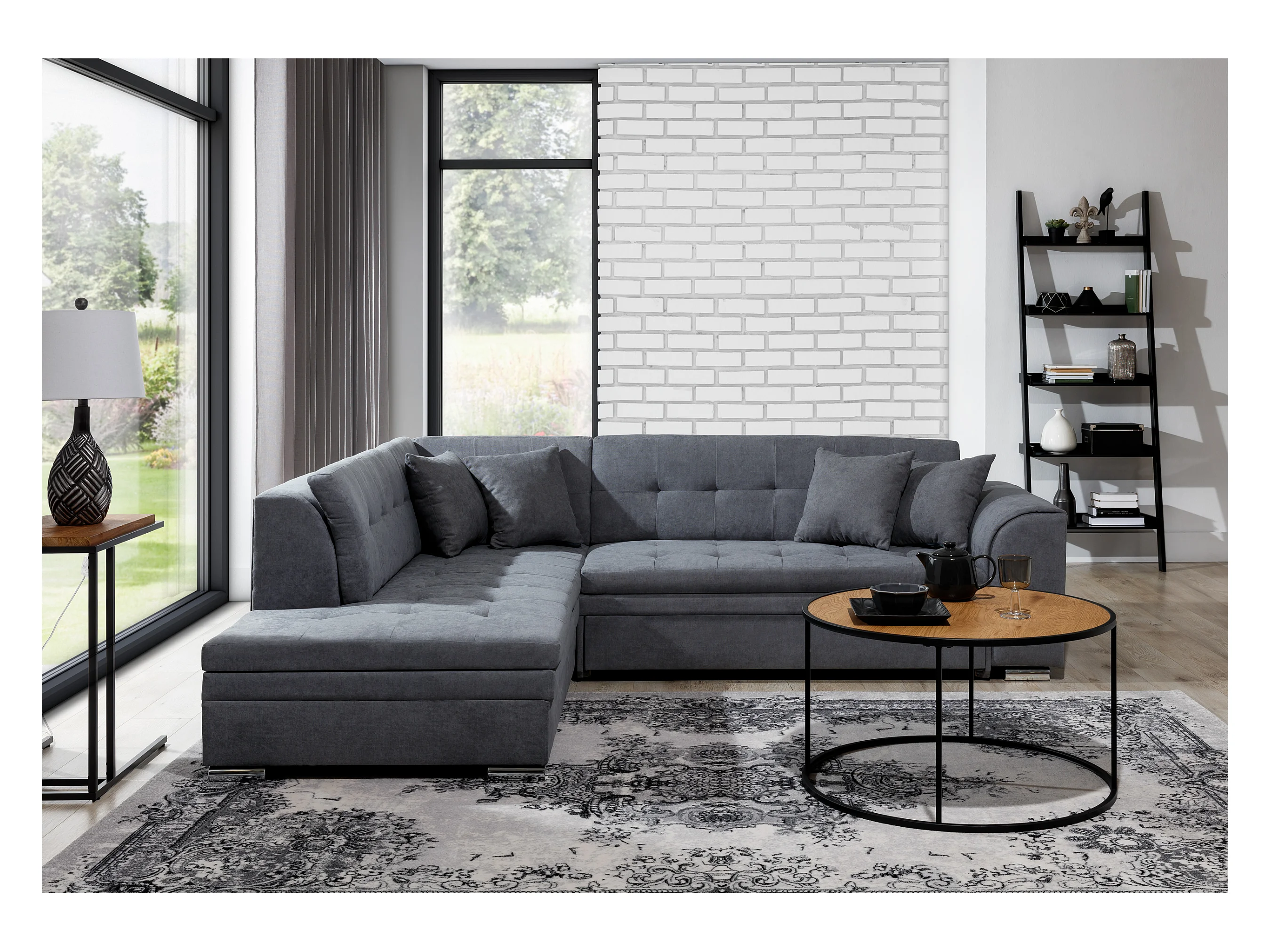Canapé convertible gauche droit tissu gris clair et simili noir Pika 260cm