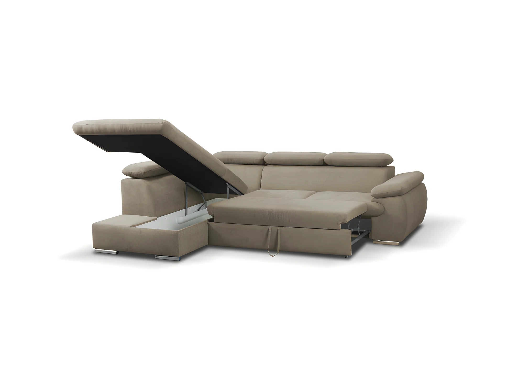 Canapé d'angle gauche convertible en tissu beige avec coffre de rangement FABIEN