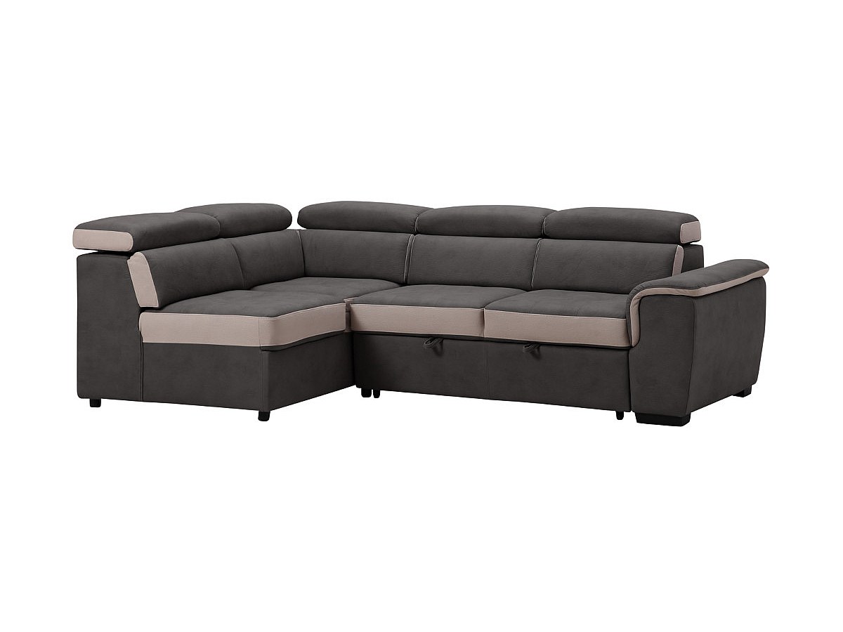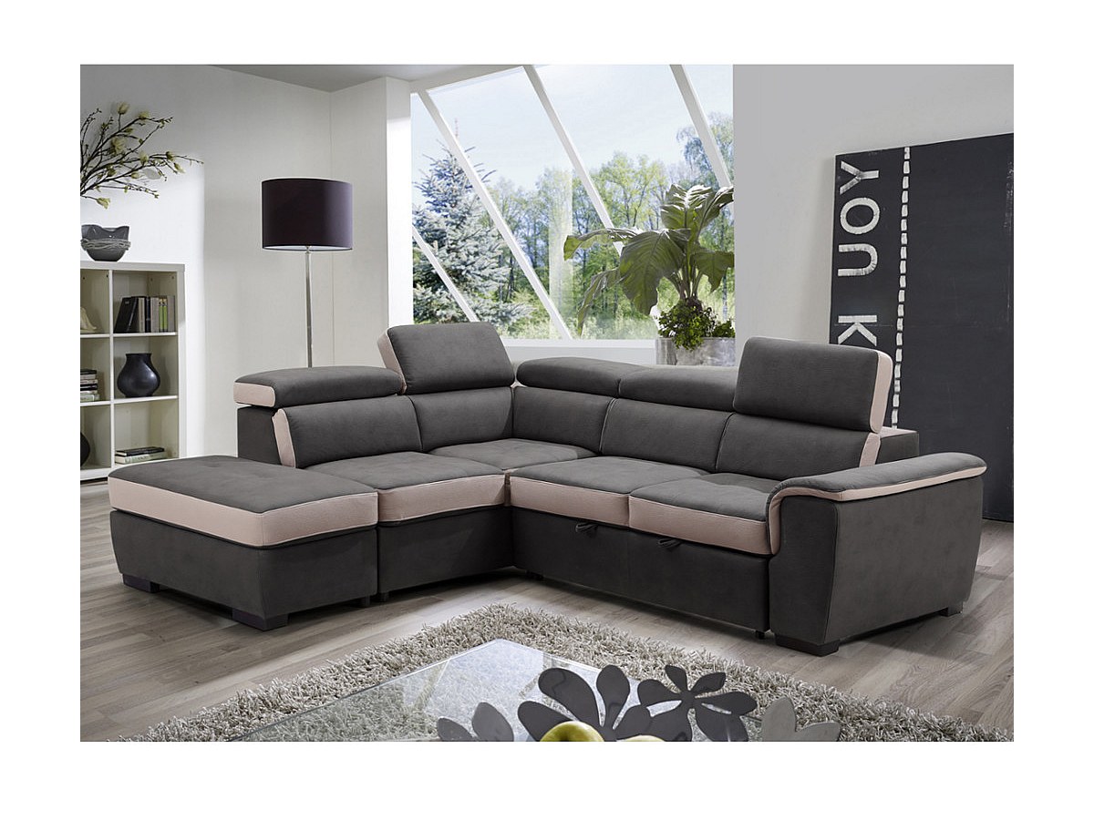 Canapé d'angle convertible en tissu avec pouf DAYO - Angle gauche - Anthracite et bandes beige