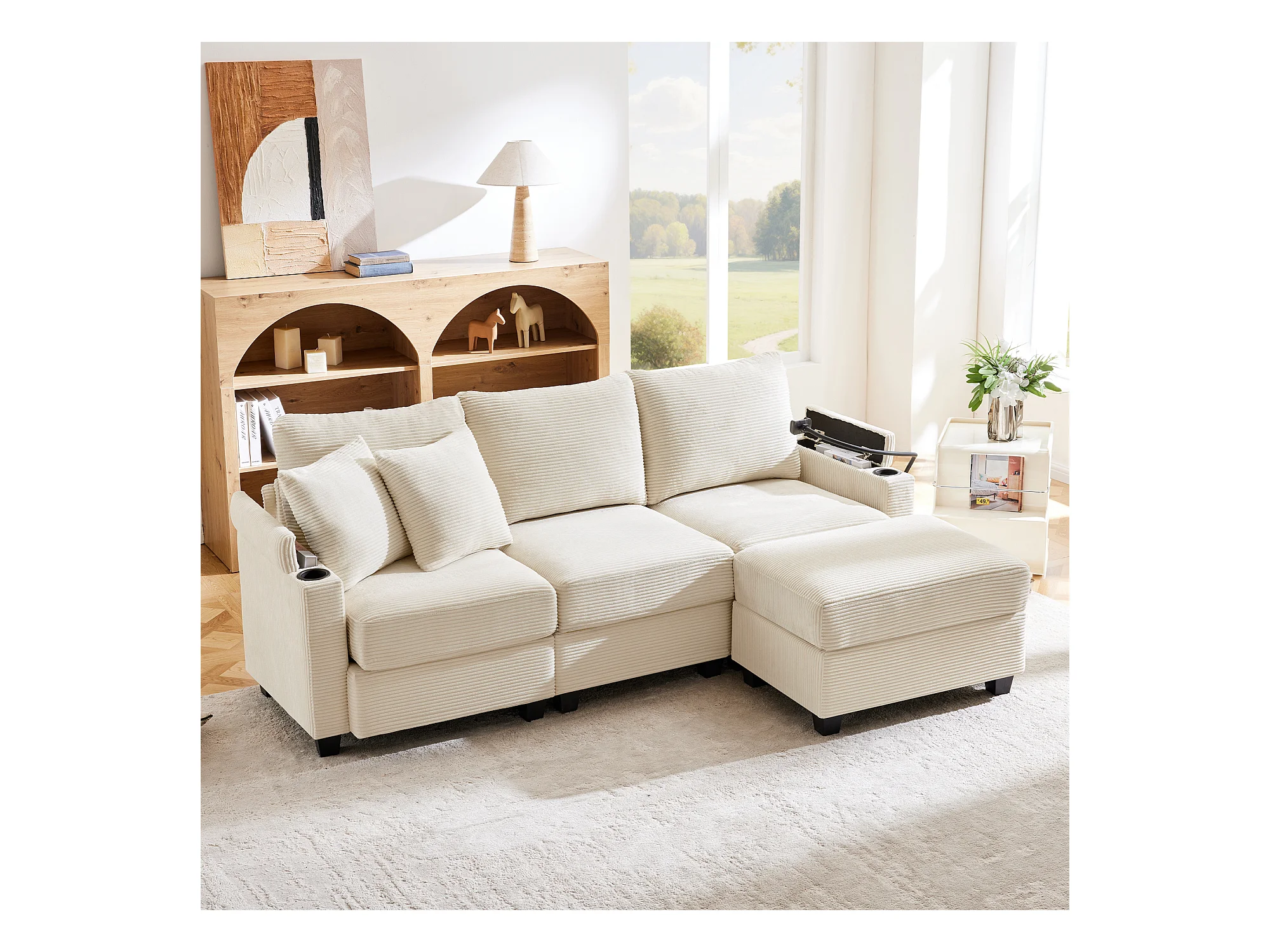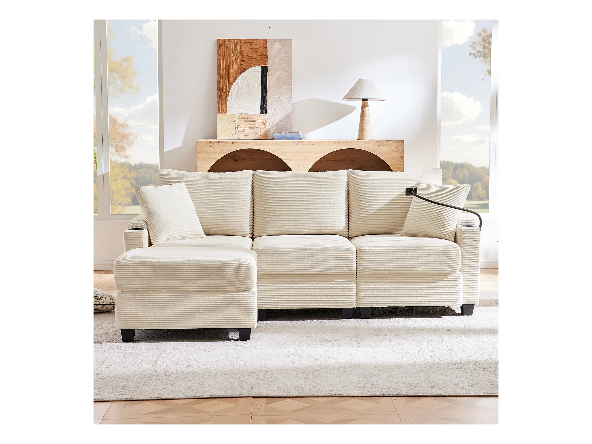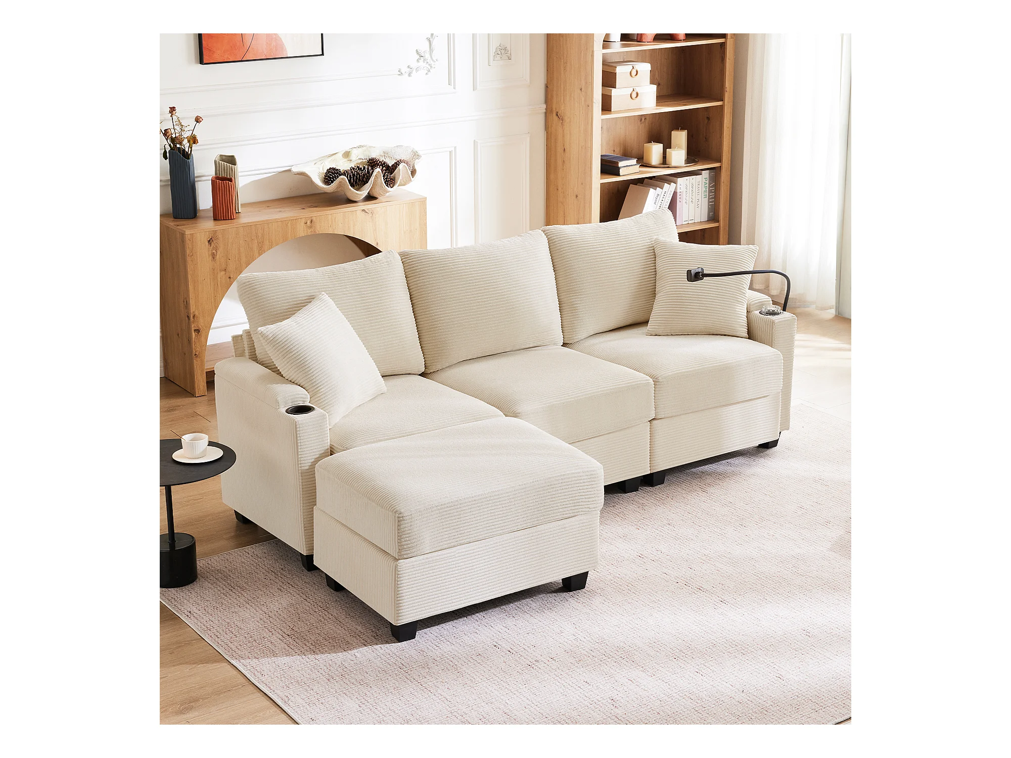 Canapé d'angle en L - 3 places - Avec repose-pieds + porte-gobelet - Chargeur USB - 2 coussins - Beige