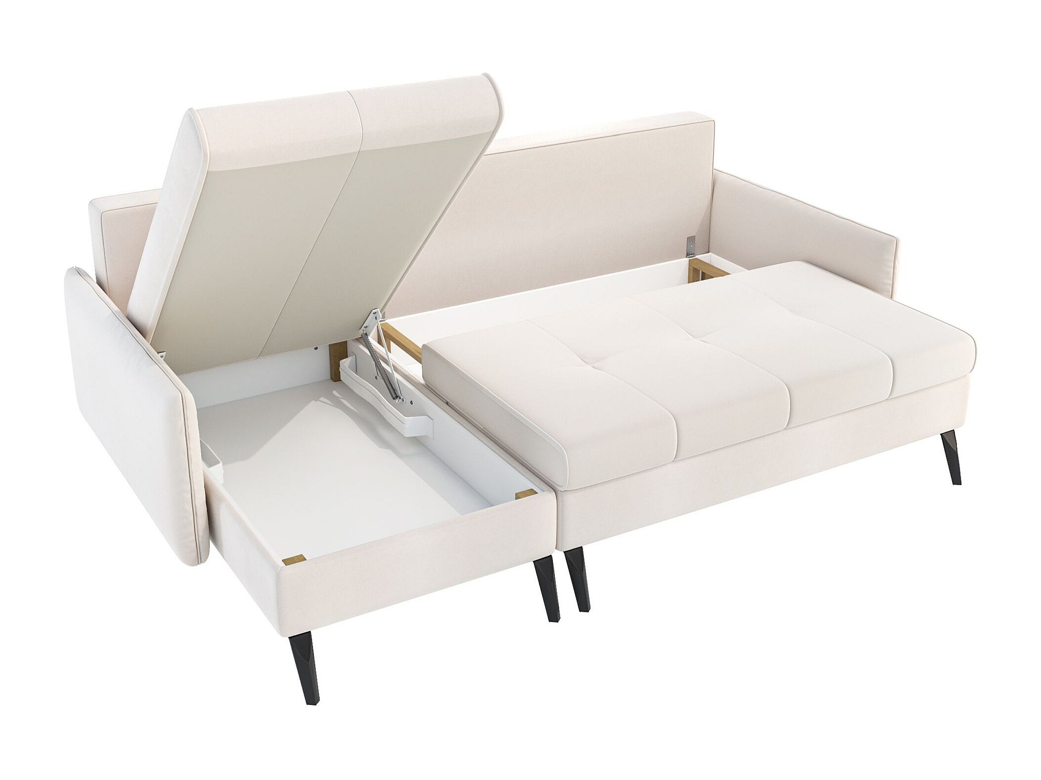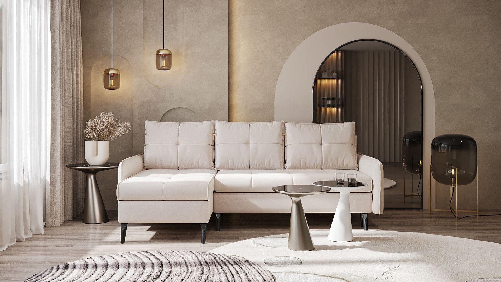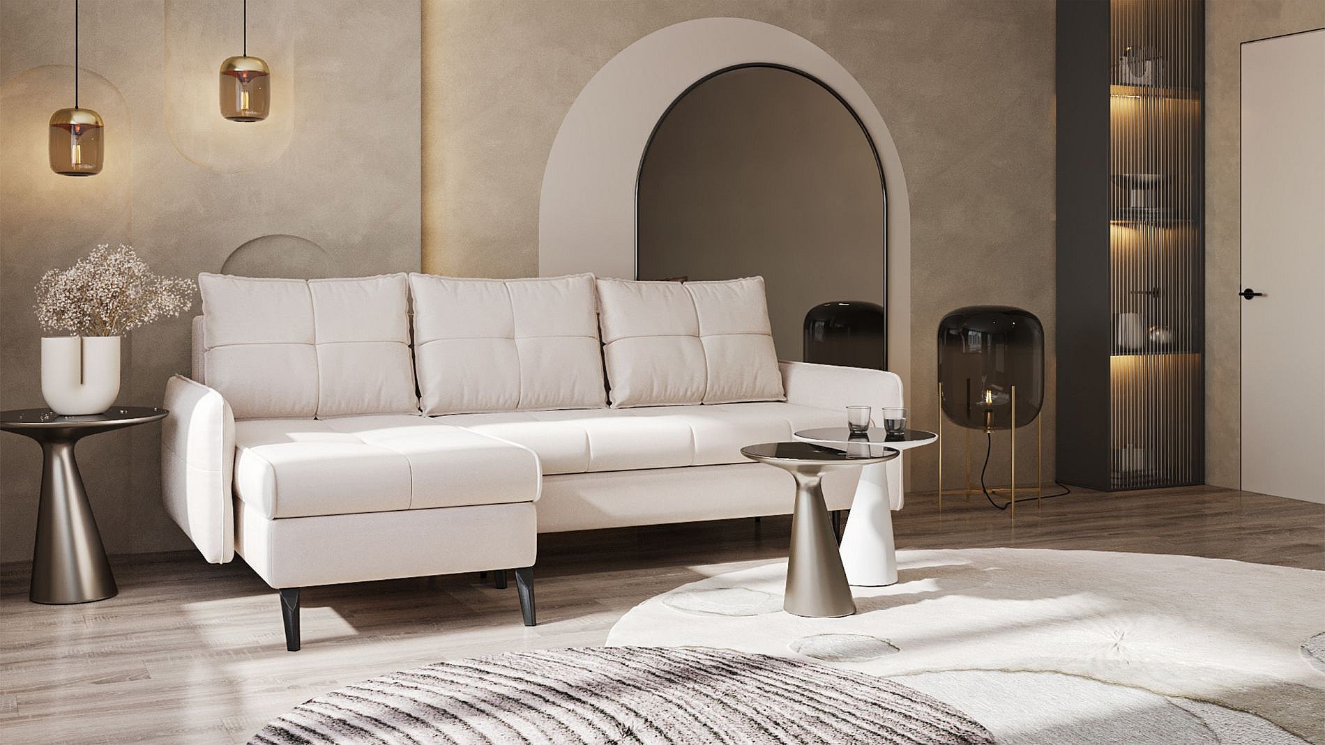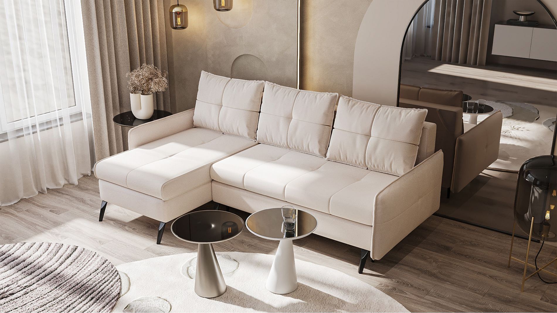 Canapé d’angle en velours – convertible avec 2 coffres – beige-gris – réversible – COLLIN