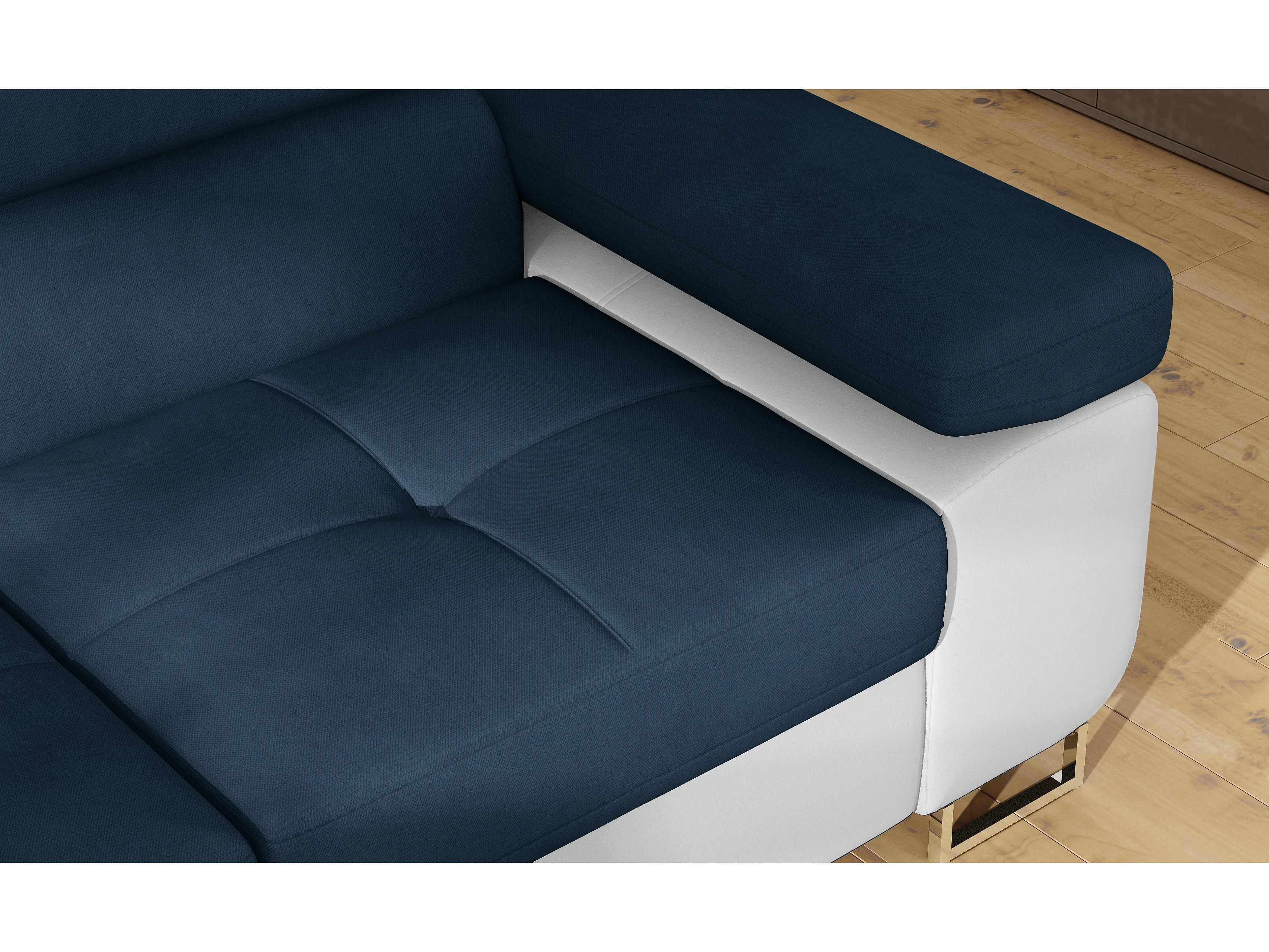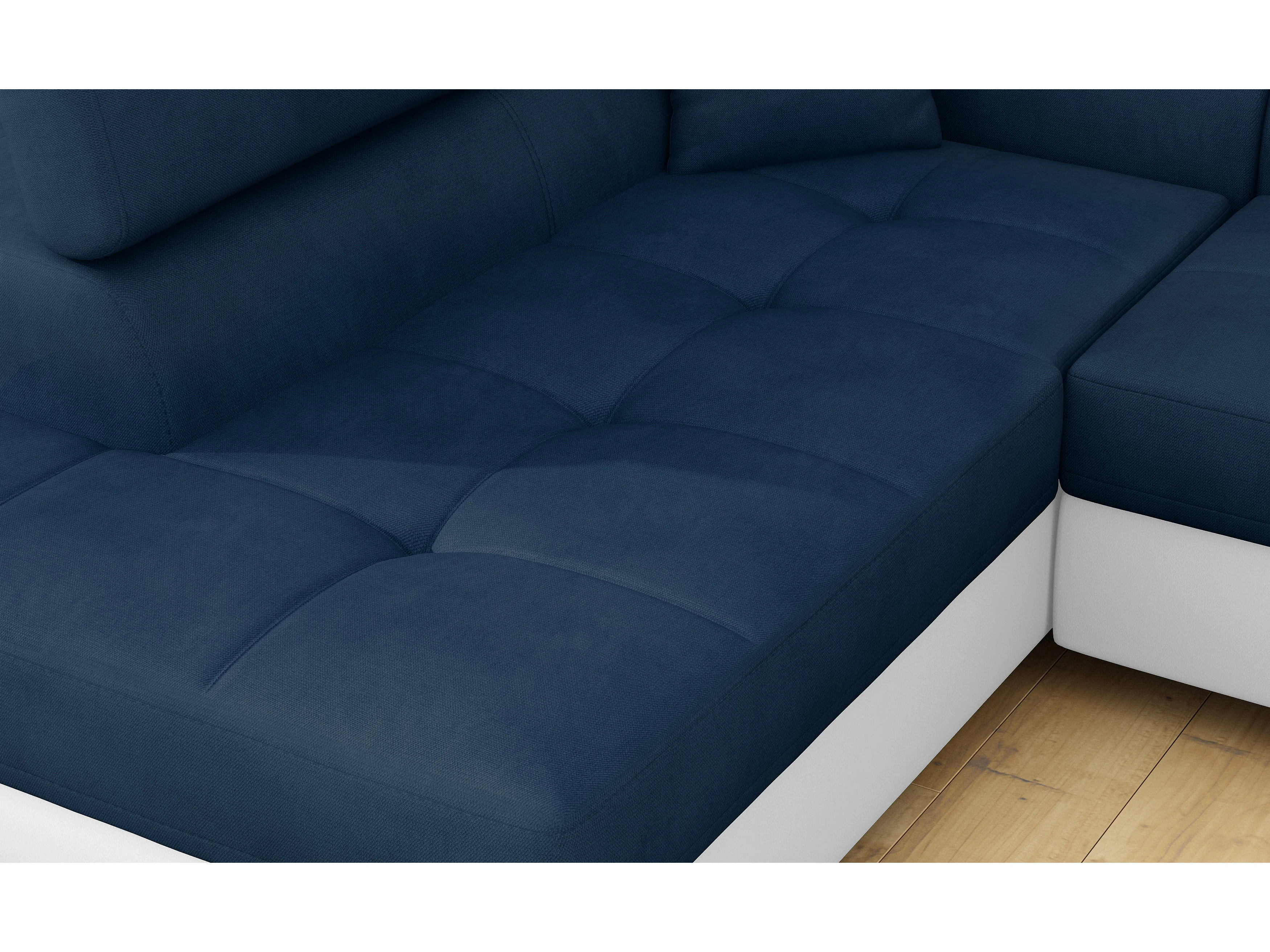 Canapé d'angle convertible simili cuir et tissu MARKA - Coffre et appuis-tête réglables-Blanc/Bleu foncé-angle gauche