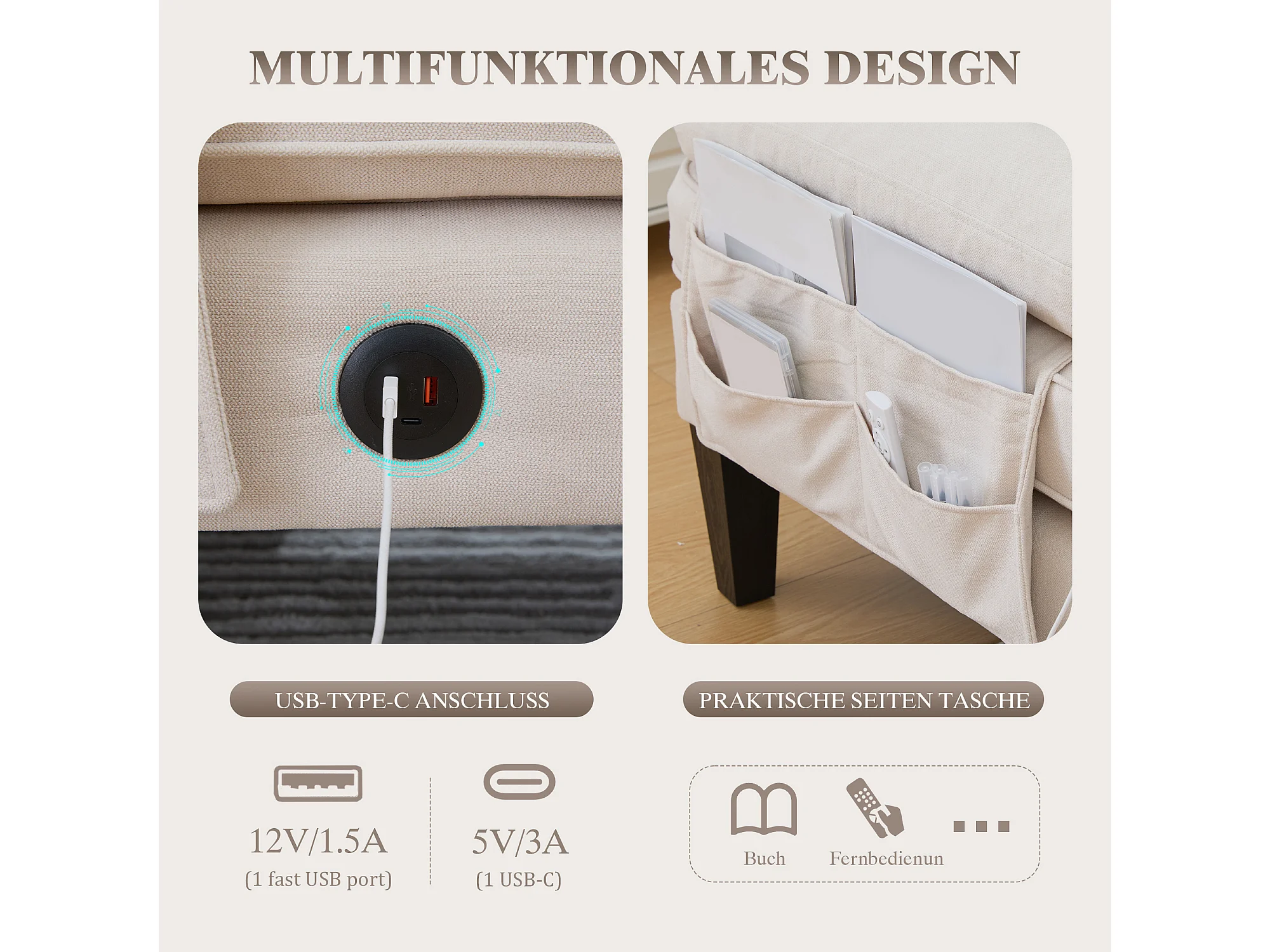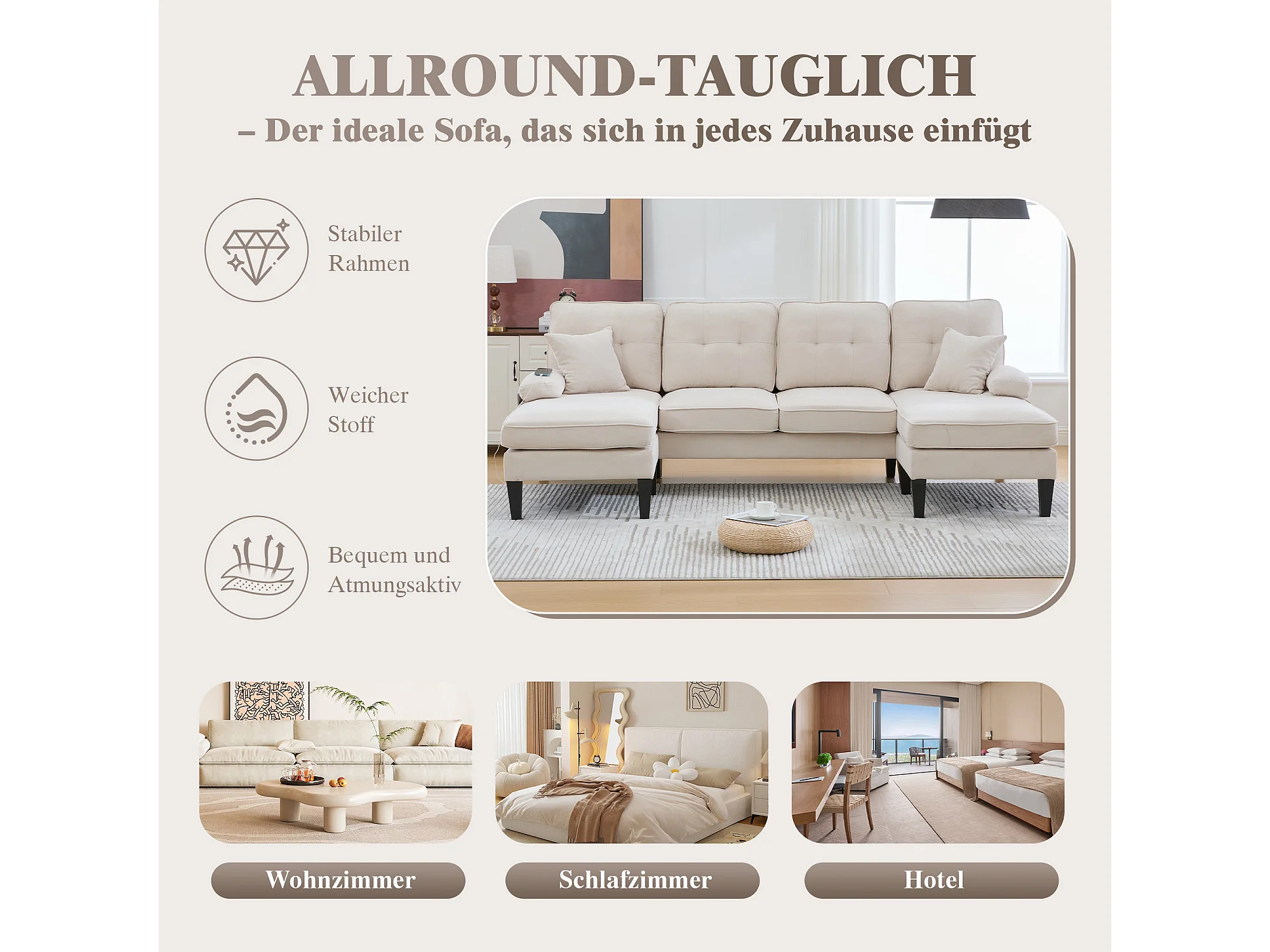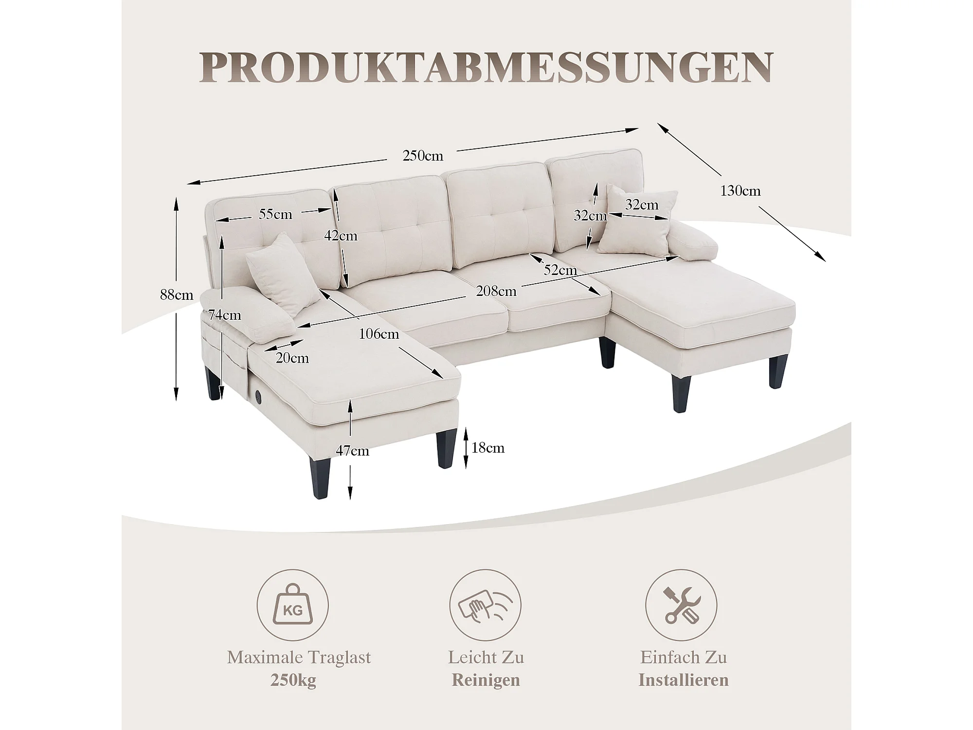 Canapé d'angle moderne 4 places en forme de U avec 2 méridienne - 250 x 130 x 88 cm - avec rembourrage + dossier - lin - beige