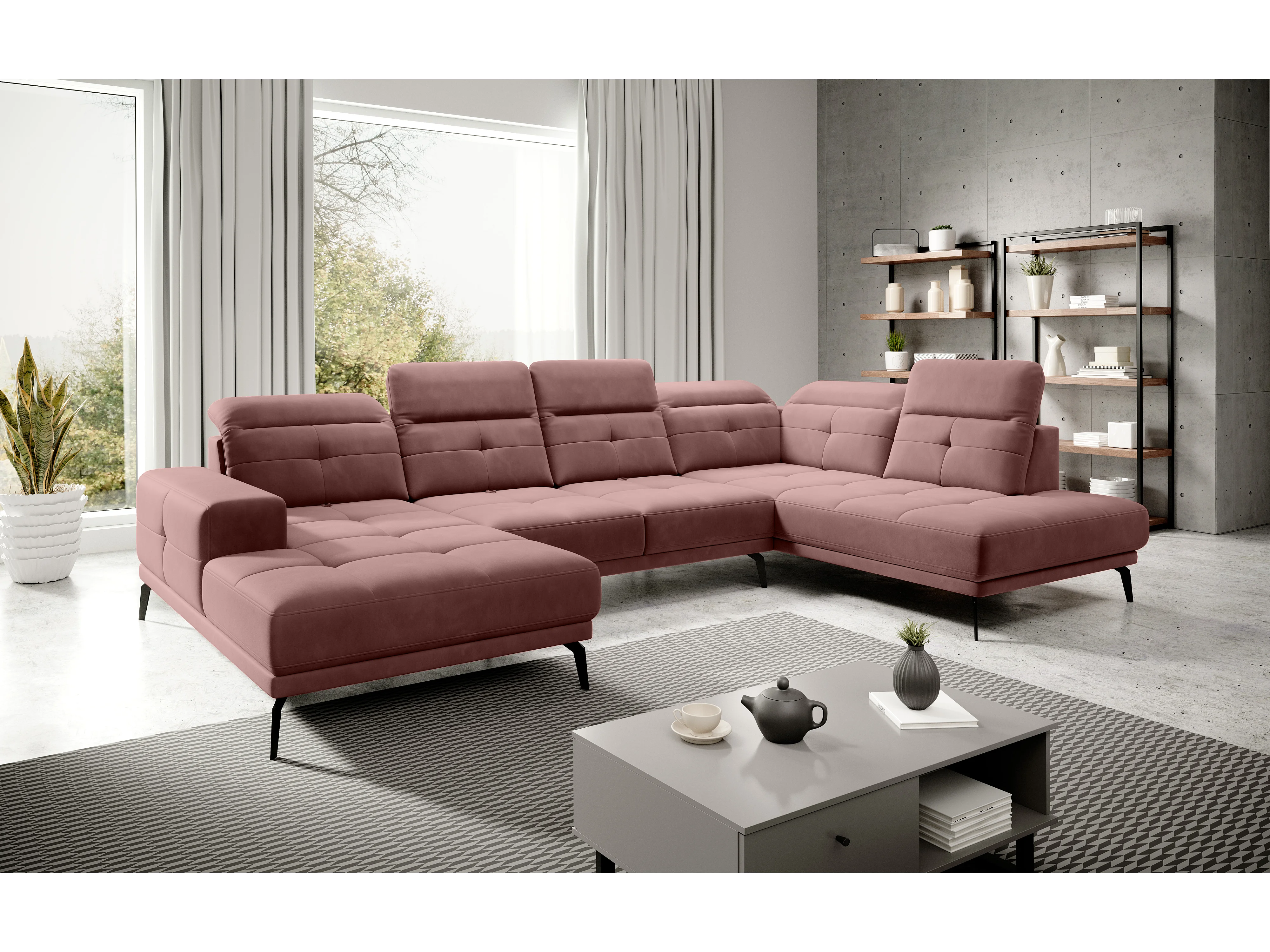 Canapé d’angle panoramique VERSUS tissu – Appuie-têtes réglables-Rose poudré-angle droit