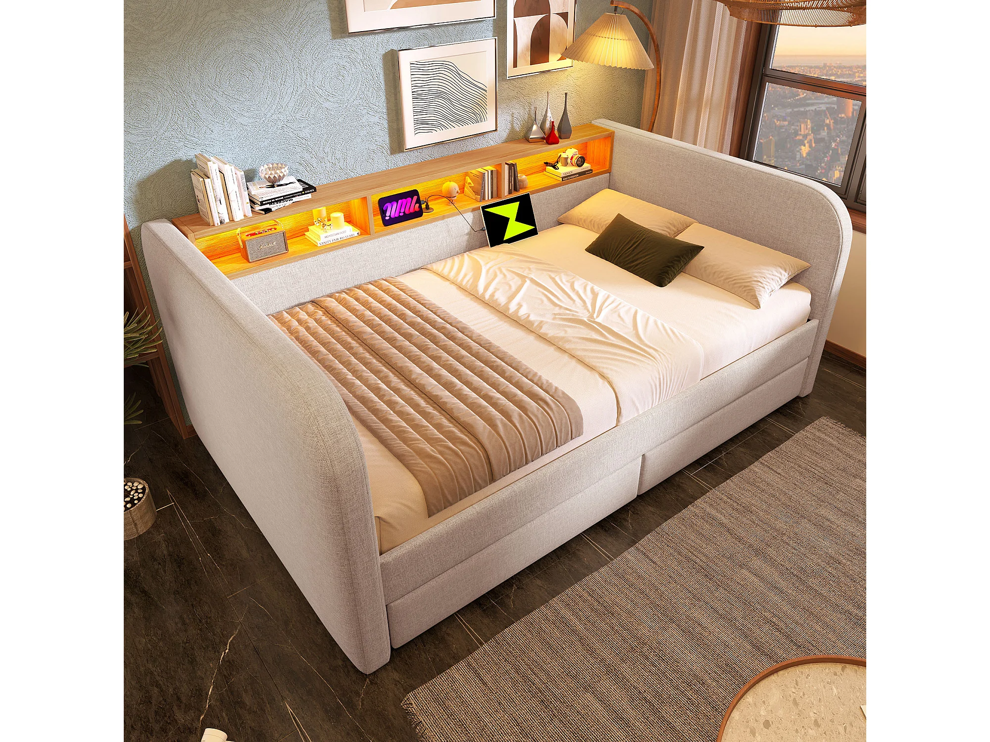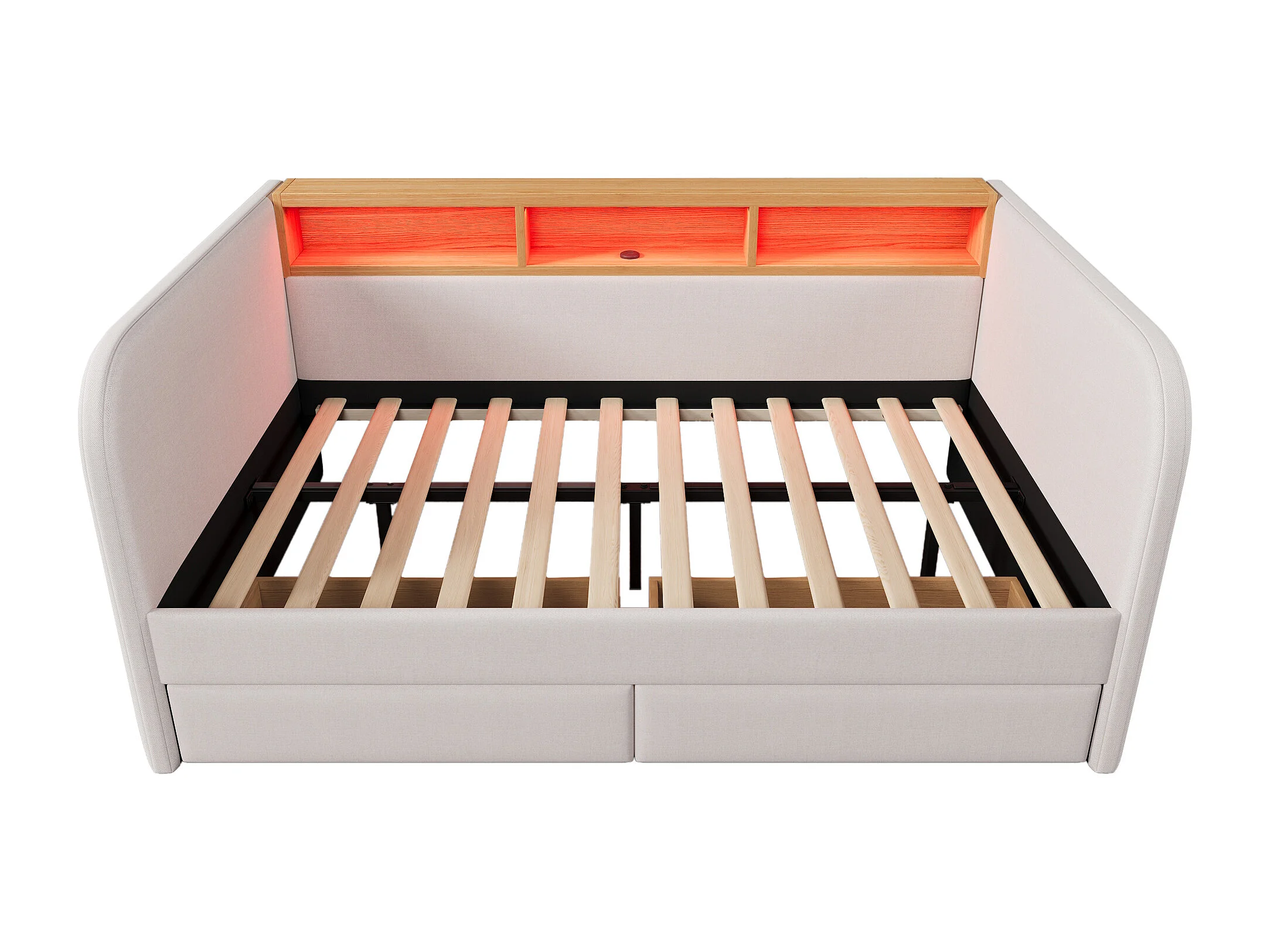Canapé-lit 140x190 cm avec sommier - tête de lit capitonnée avec USB et LED 2 tiroirs - lin beige (sans matelas )