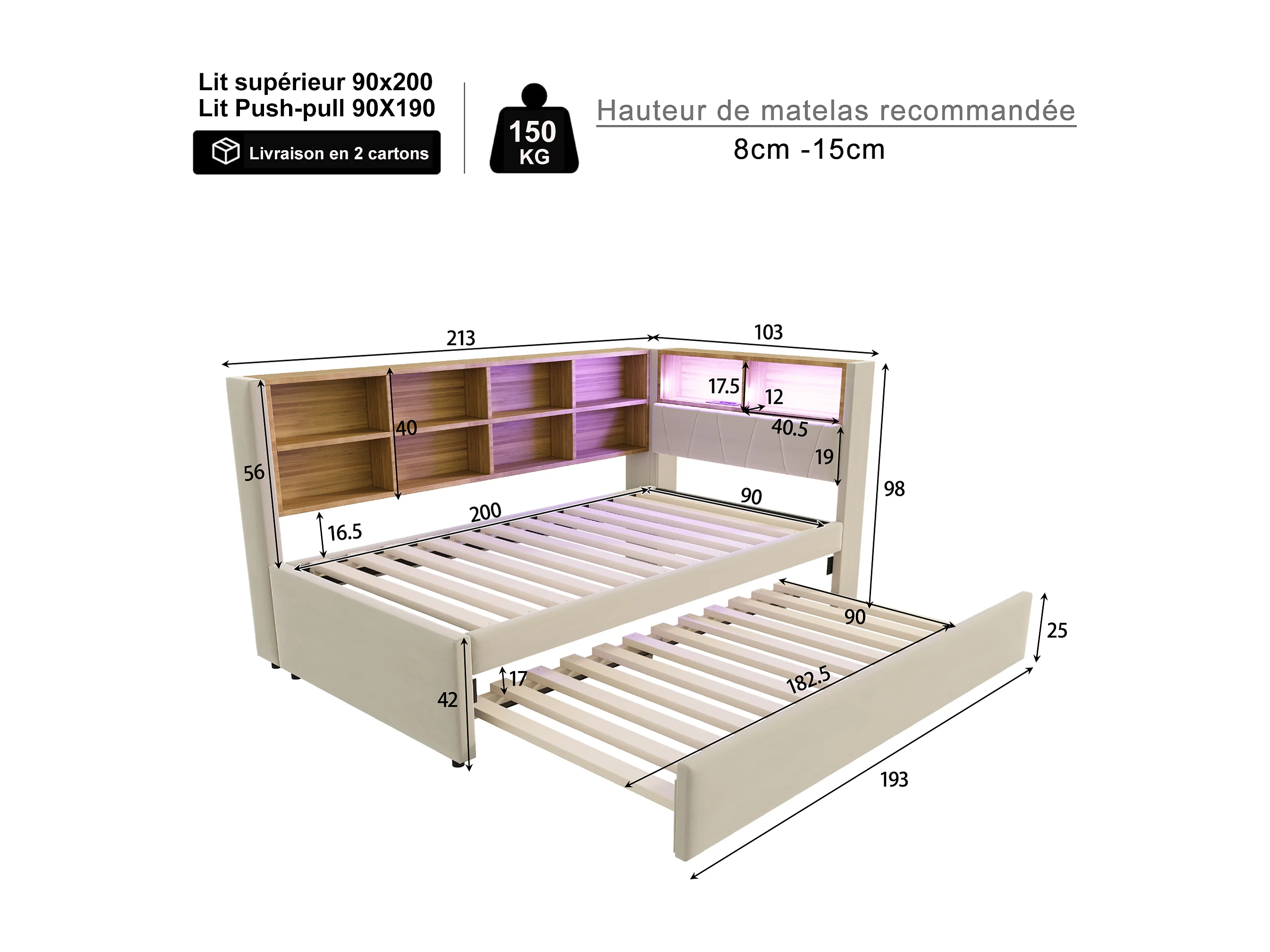 Canapé-lit 90*200CM - avec ports USB,LED et de nombreux compartiments de rangement - lit gigogne 90*190CM - flanelle - gris foncé