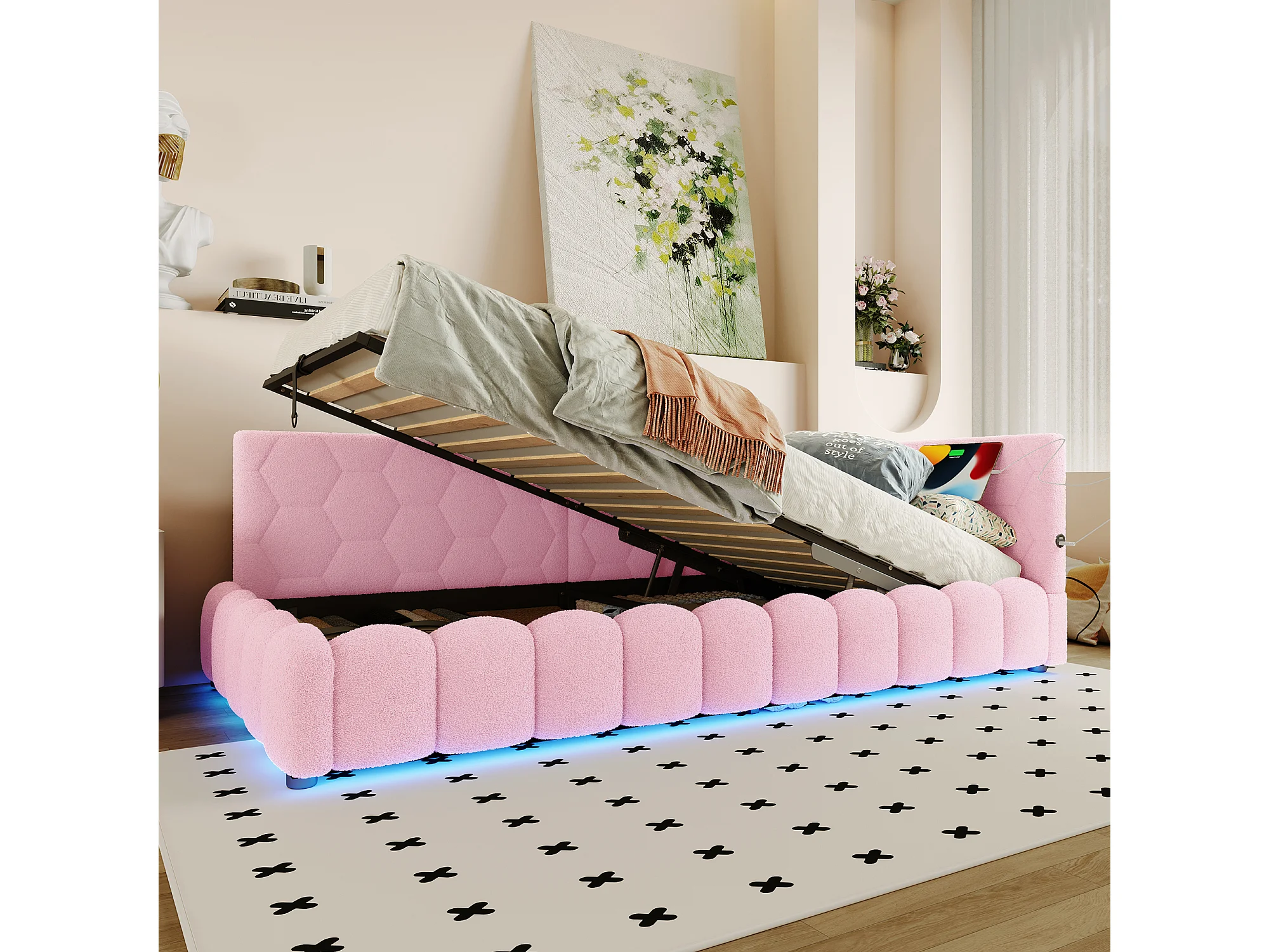 Canapé-lit 90x200 cm avec sommier, bande LED, levage hydraulique, ports USB et Type-C, tissu doux, ros