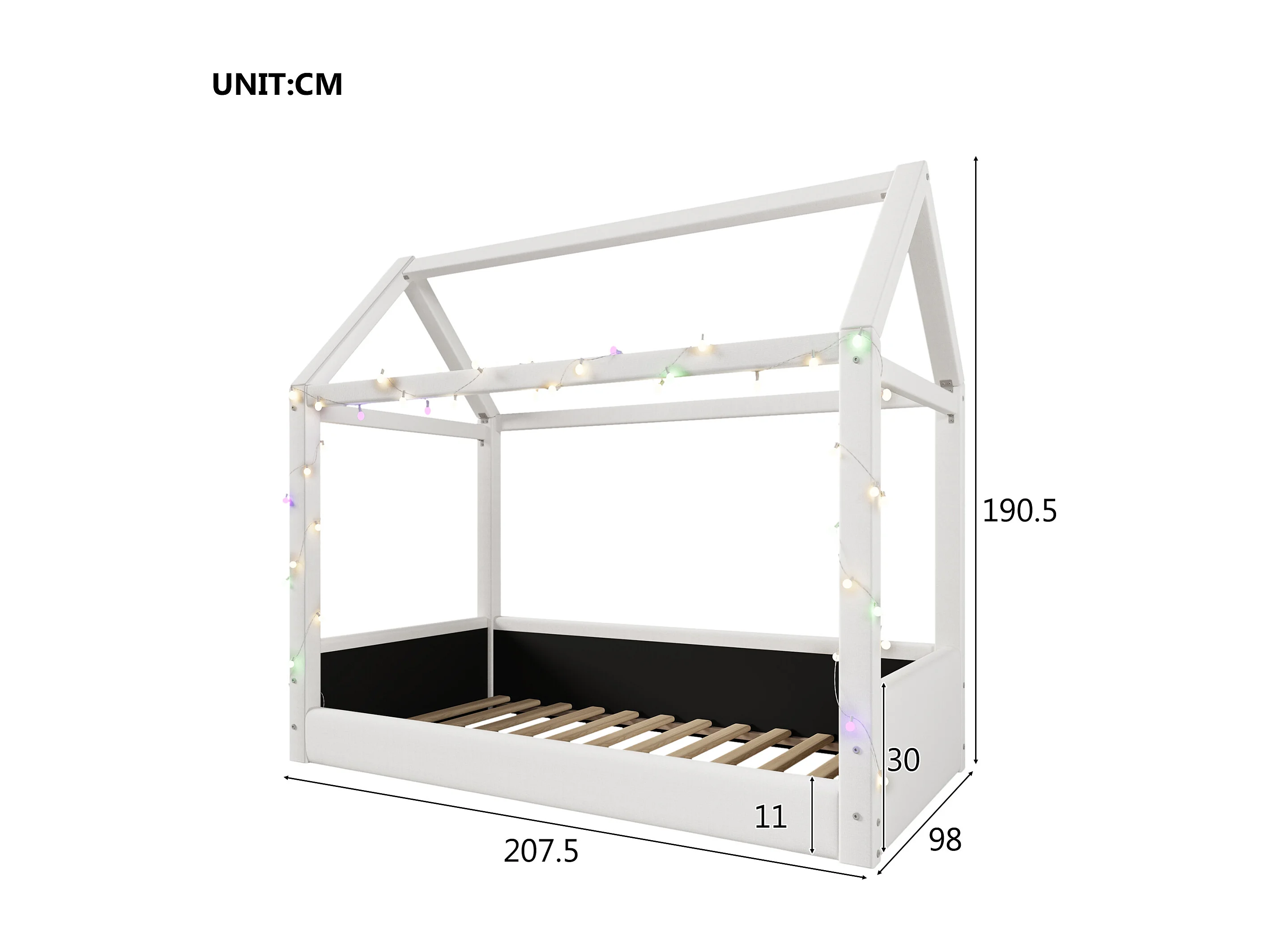 Lit cabane 90x200cm - avec bande lumineuse LED - Design toit - MDF - Beige (matelas non inclus)