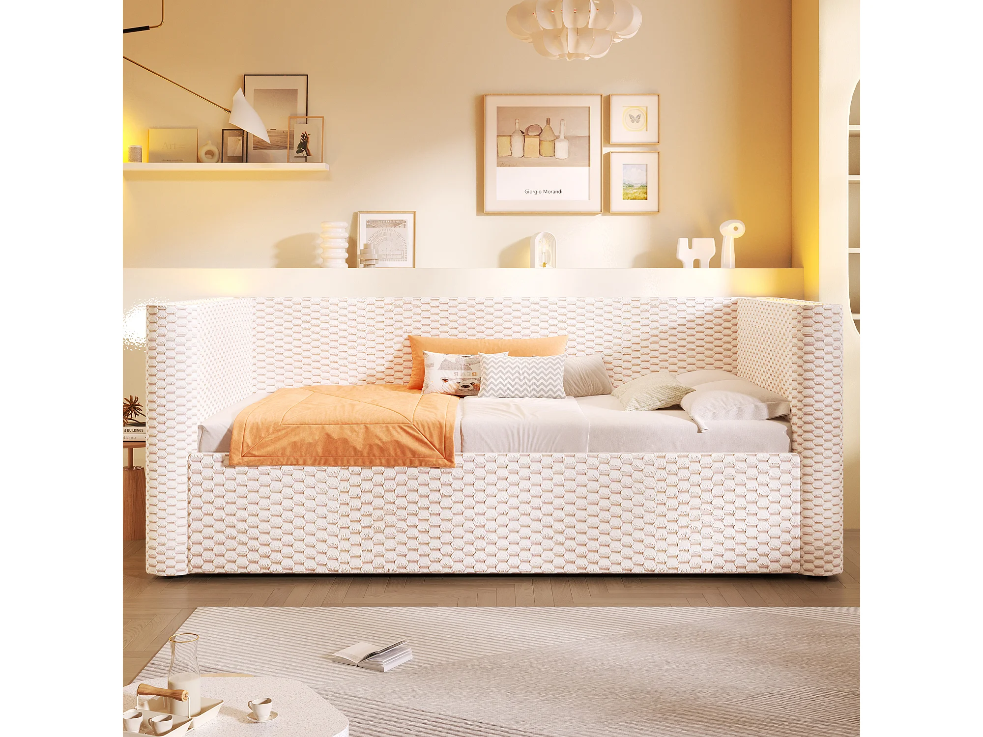 Lit banquette enfant 90x200 cm avec 2 tiroirs, lumière de lecture et USB-Type-C, velours beige, sans matelas