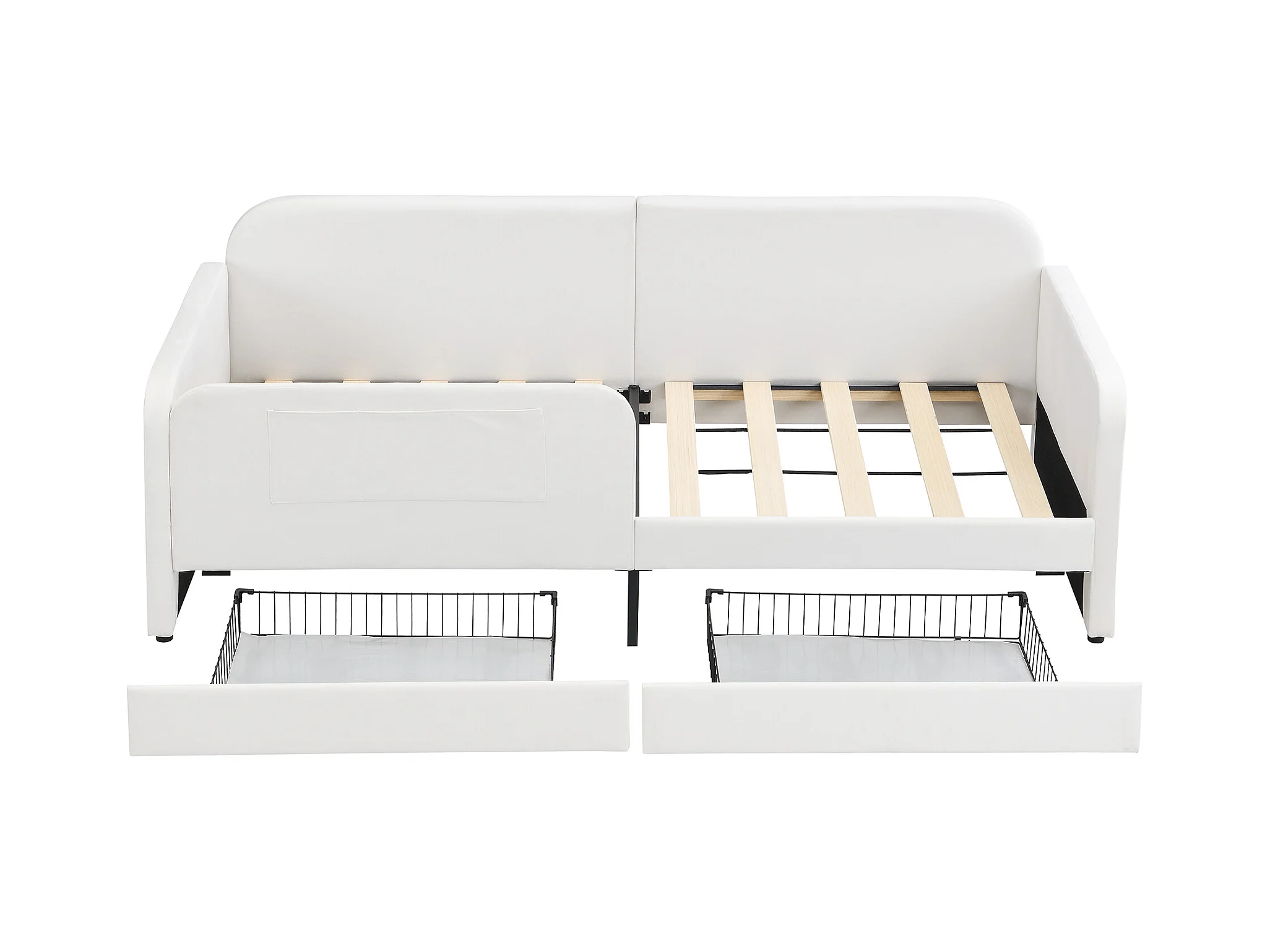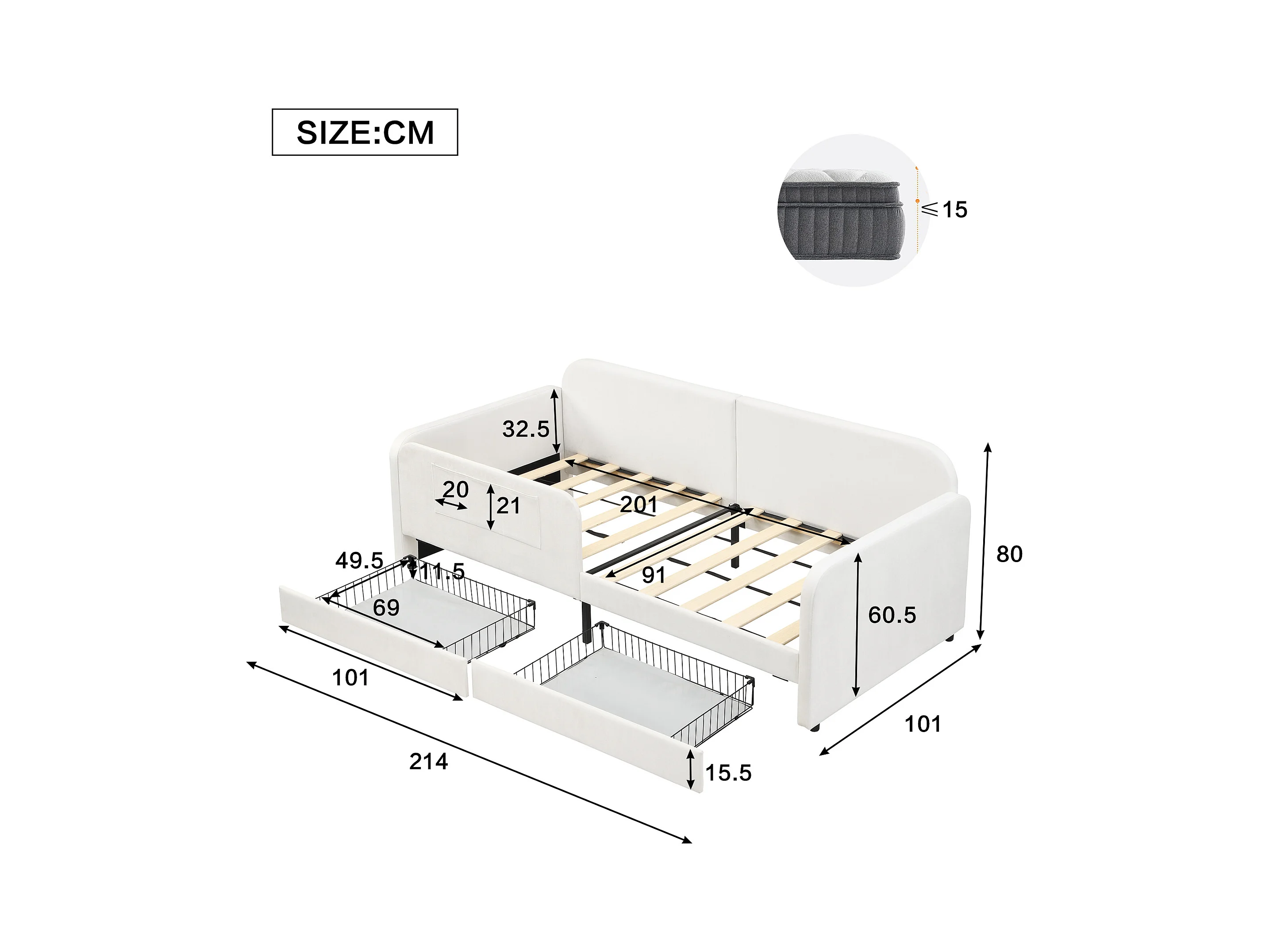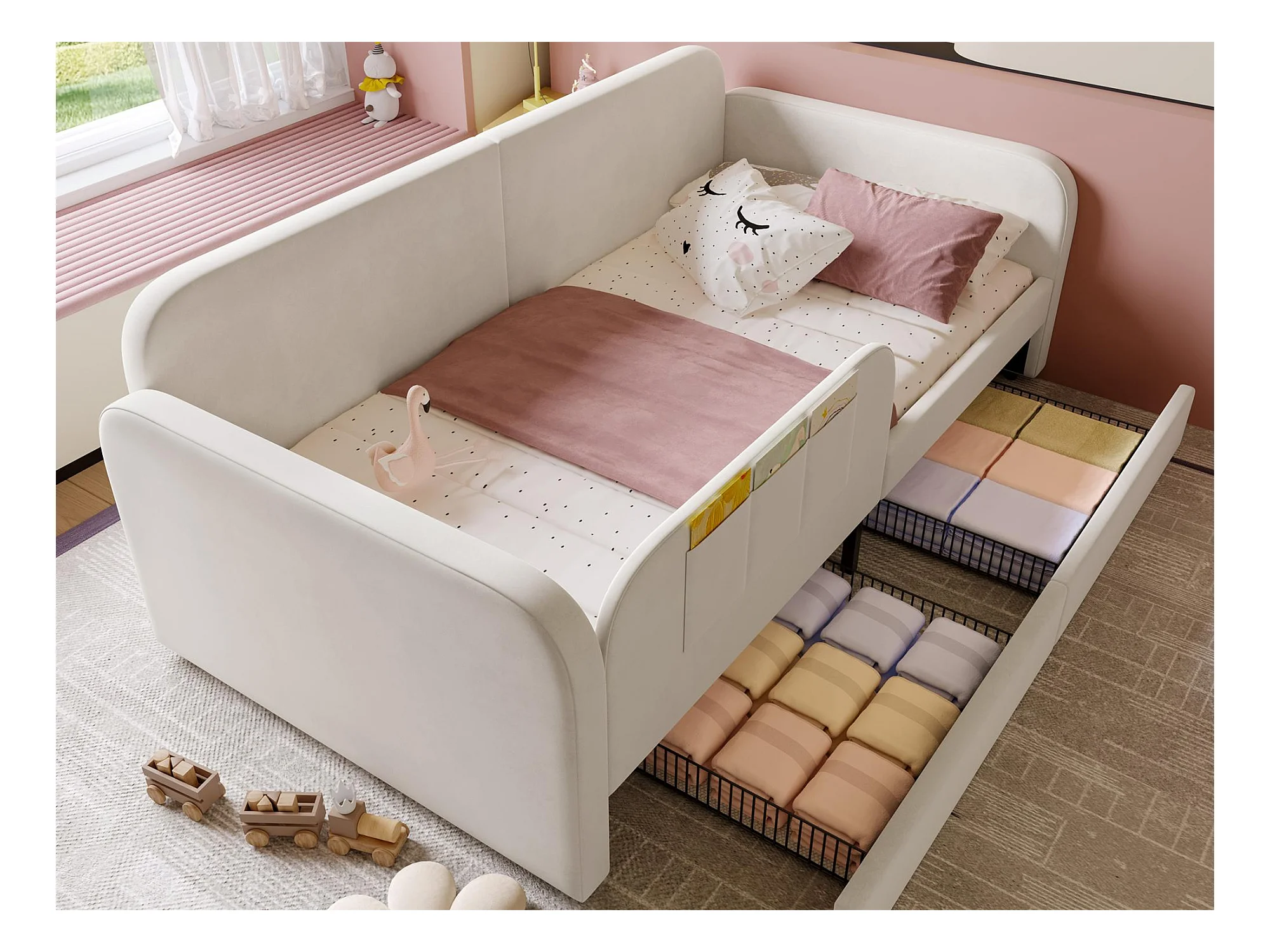 Canapé-lit enfants 90x200cm en velours - avec 2 tiroirs - 3 petites poches de rangement - Blanc(sans matelas)