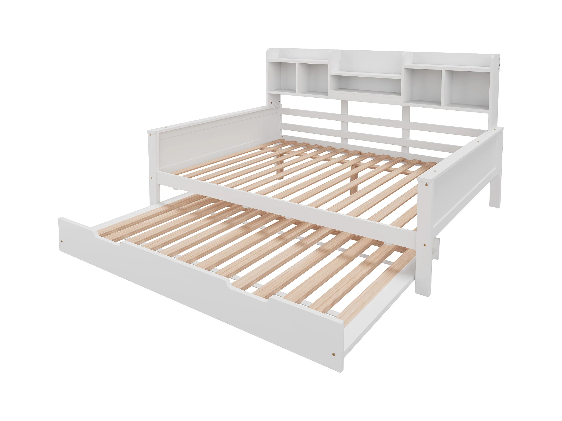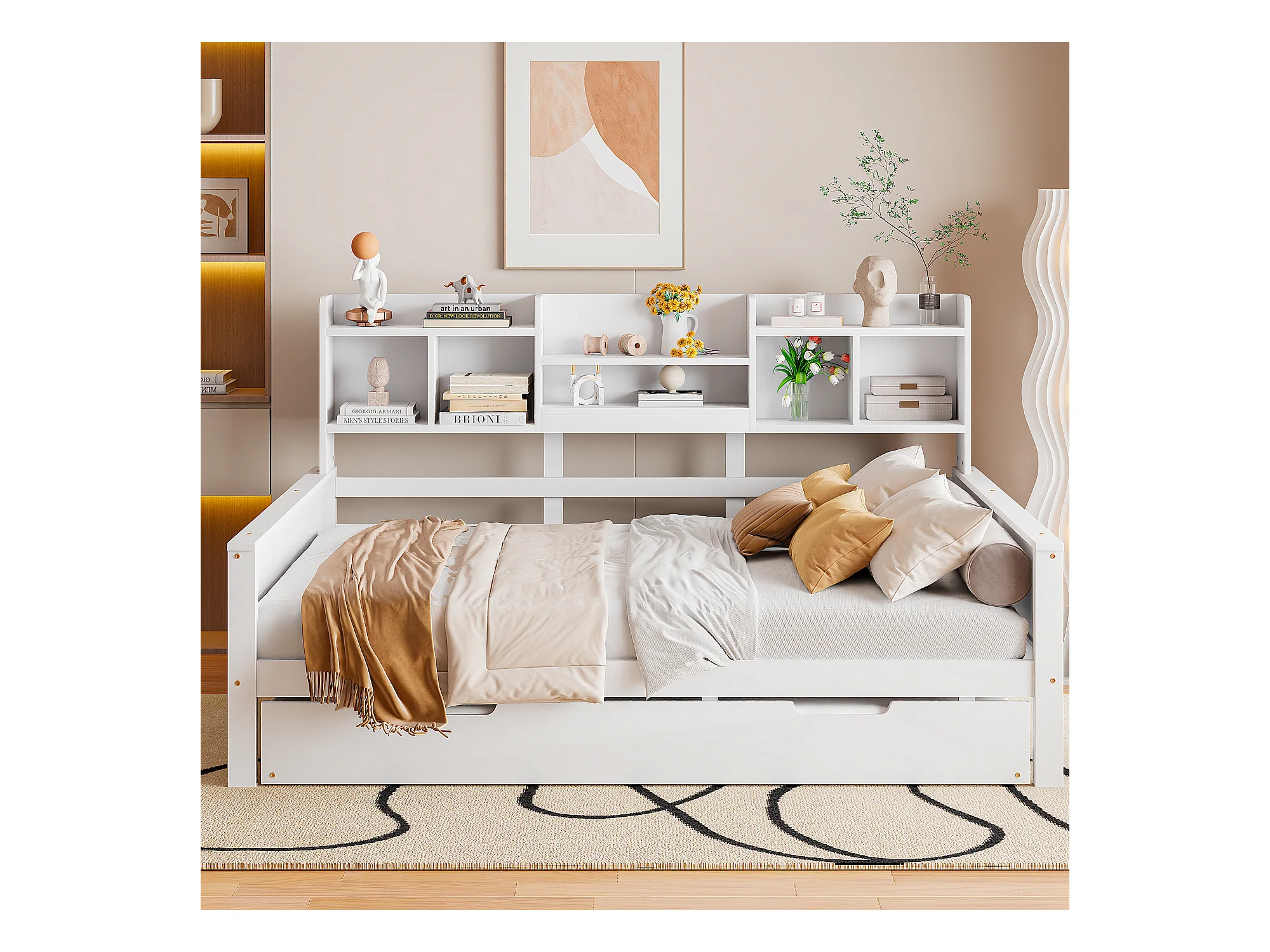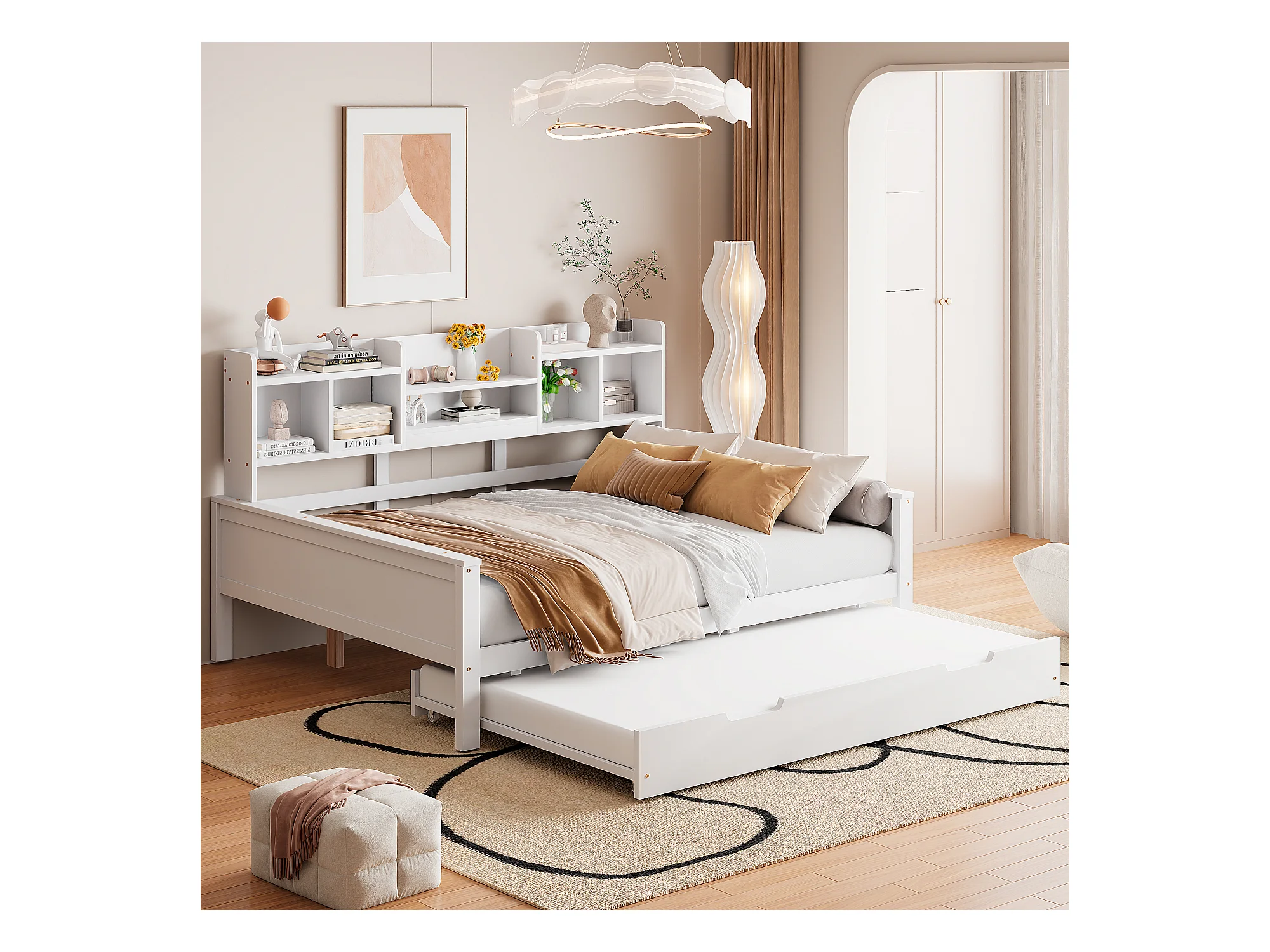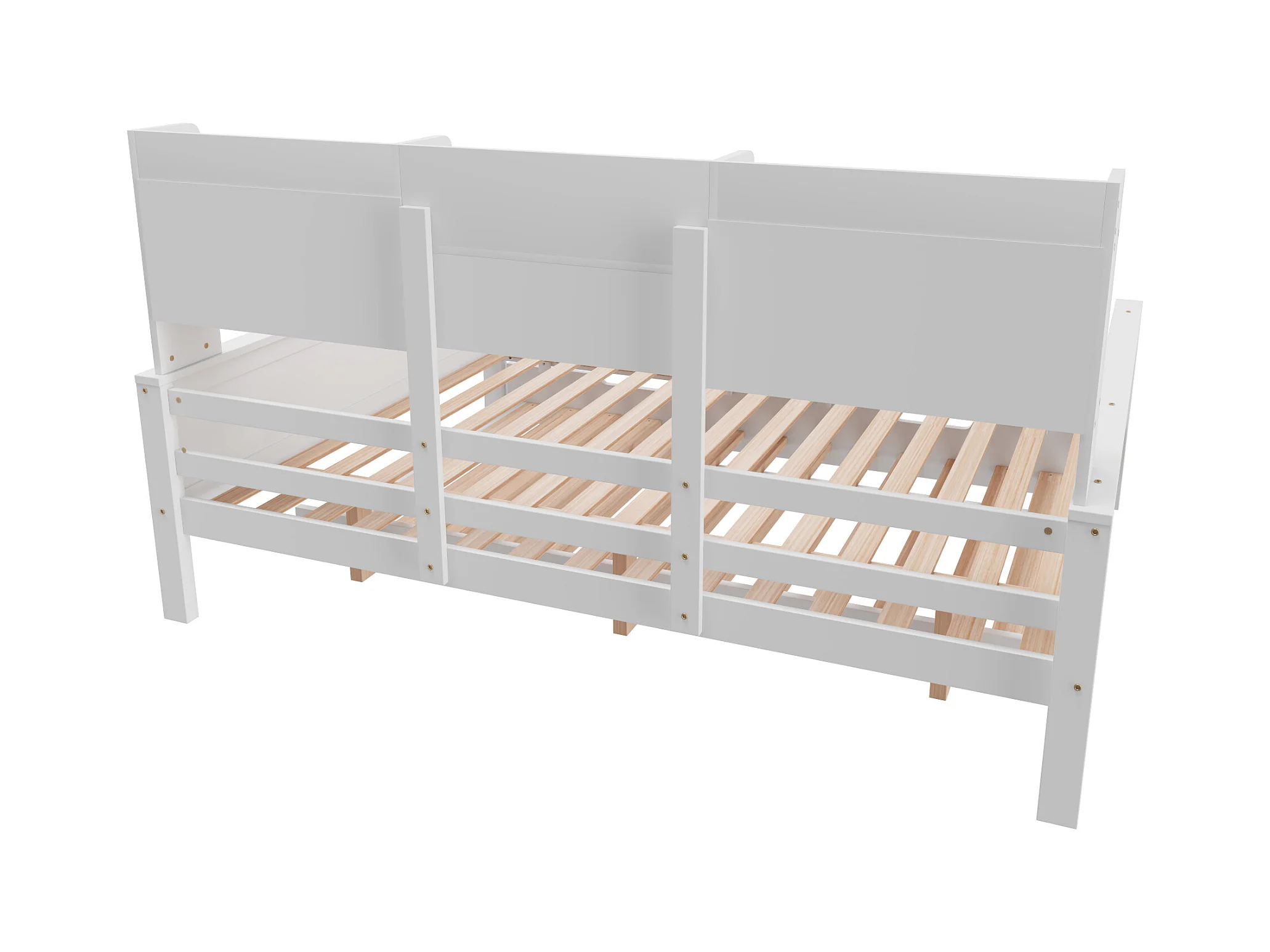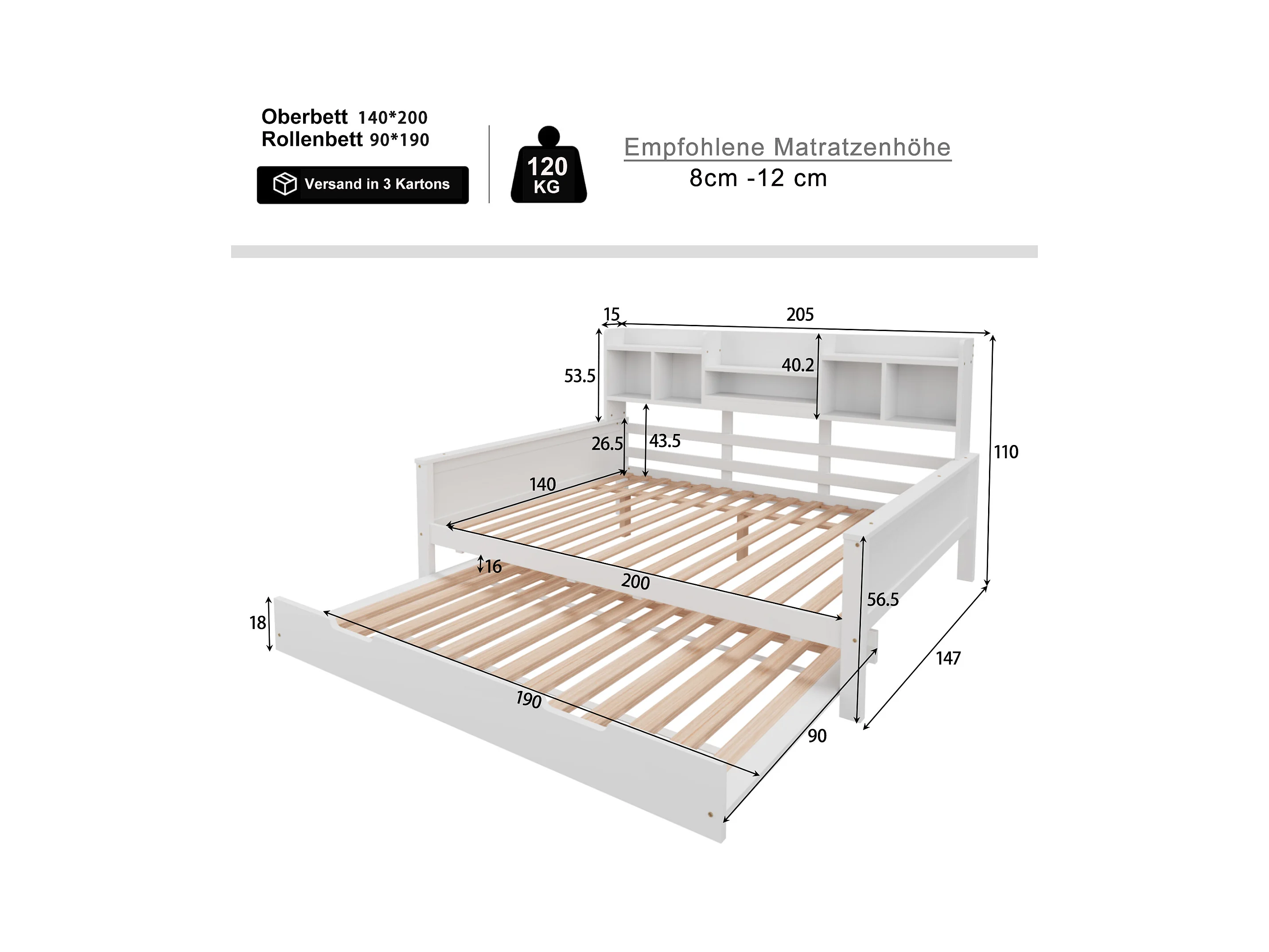 Lit banquette enfant extensible 140x200 cm avec lit gigogne 90x190 cm – bois de pin, sommier et coffre de rangement – lit multifonction blanc (sans matelas)