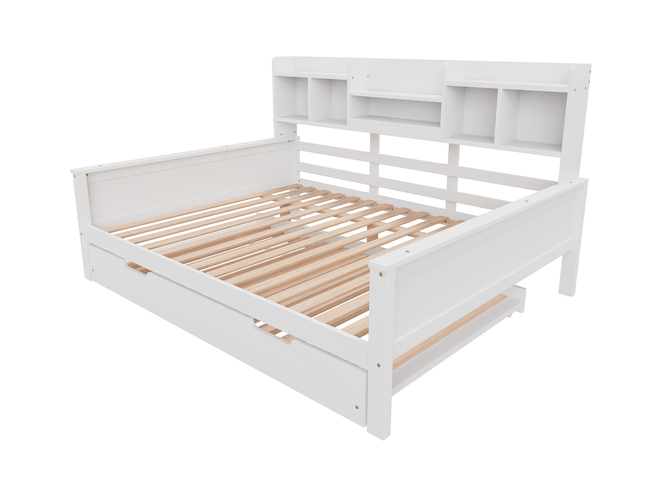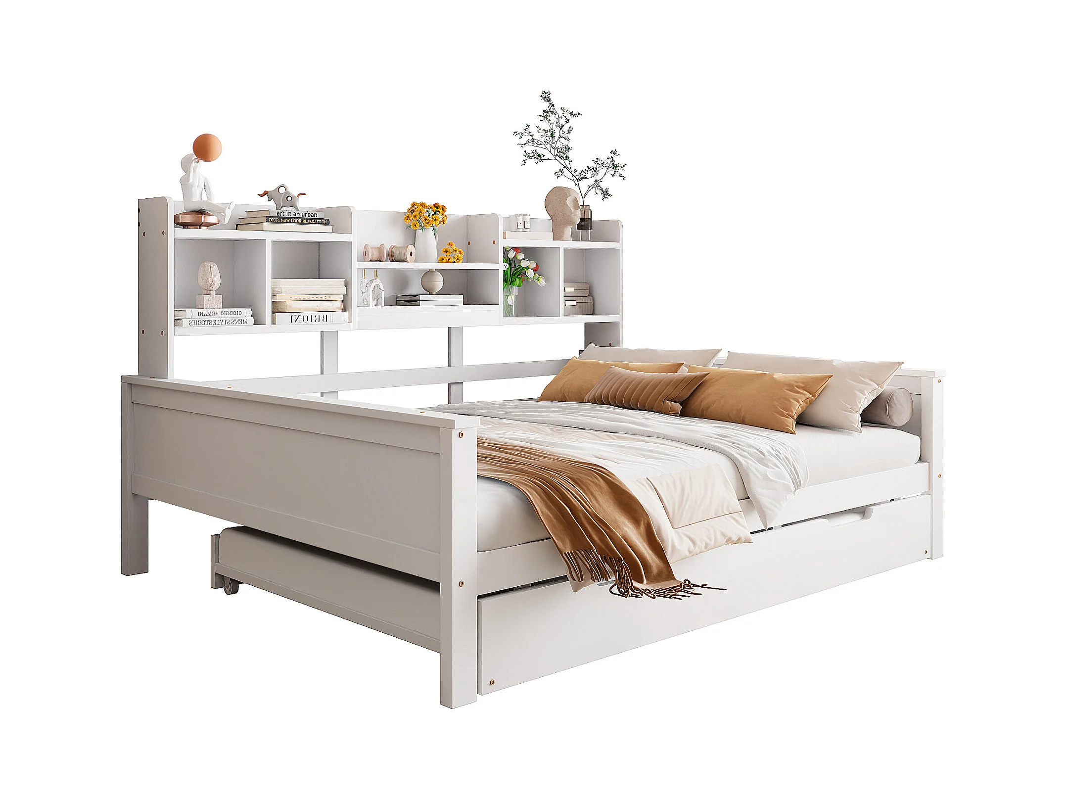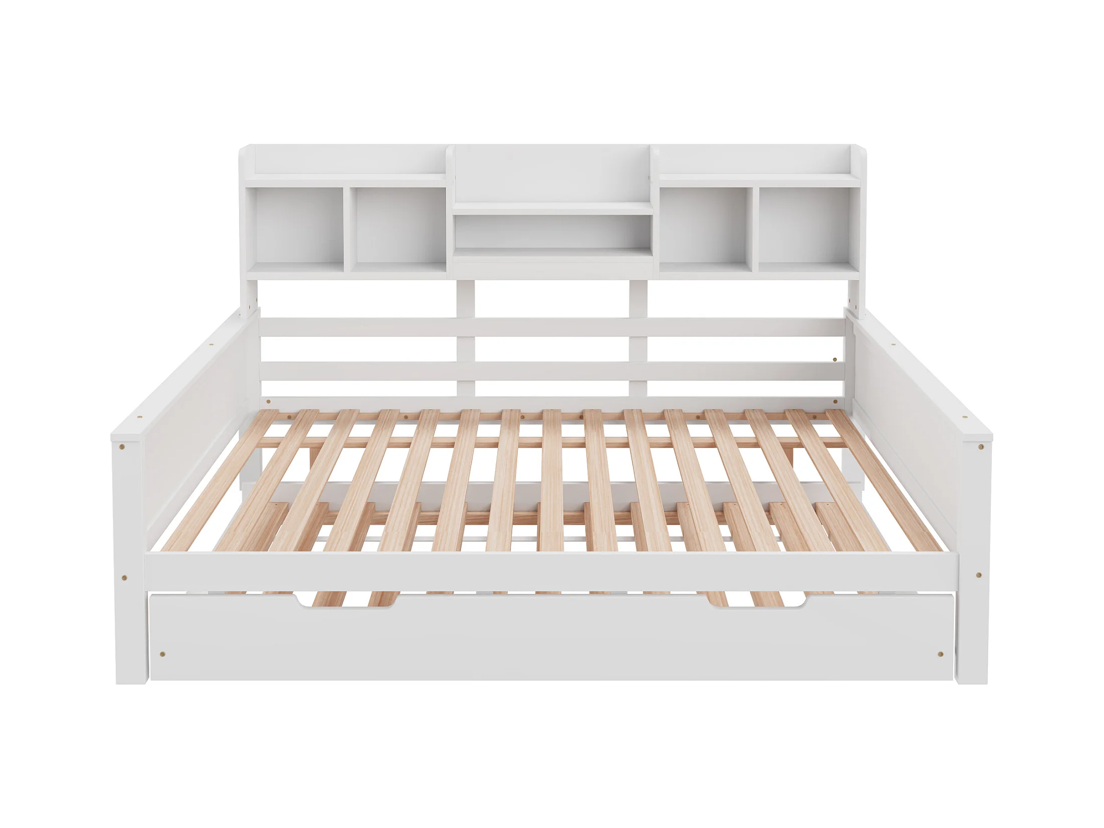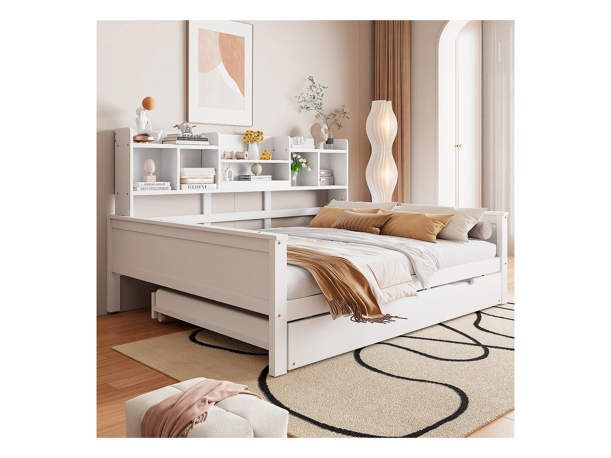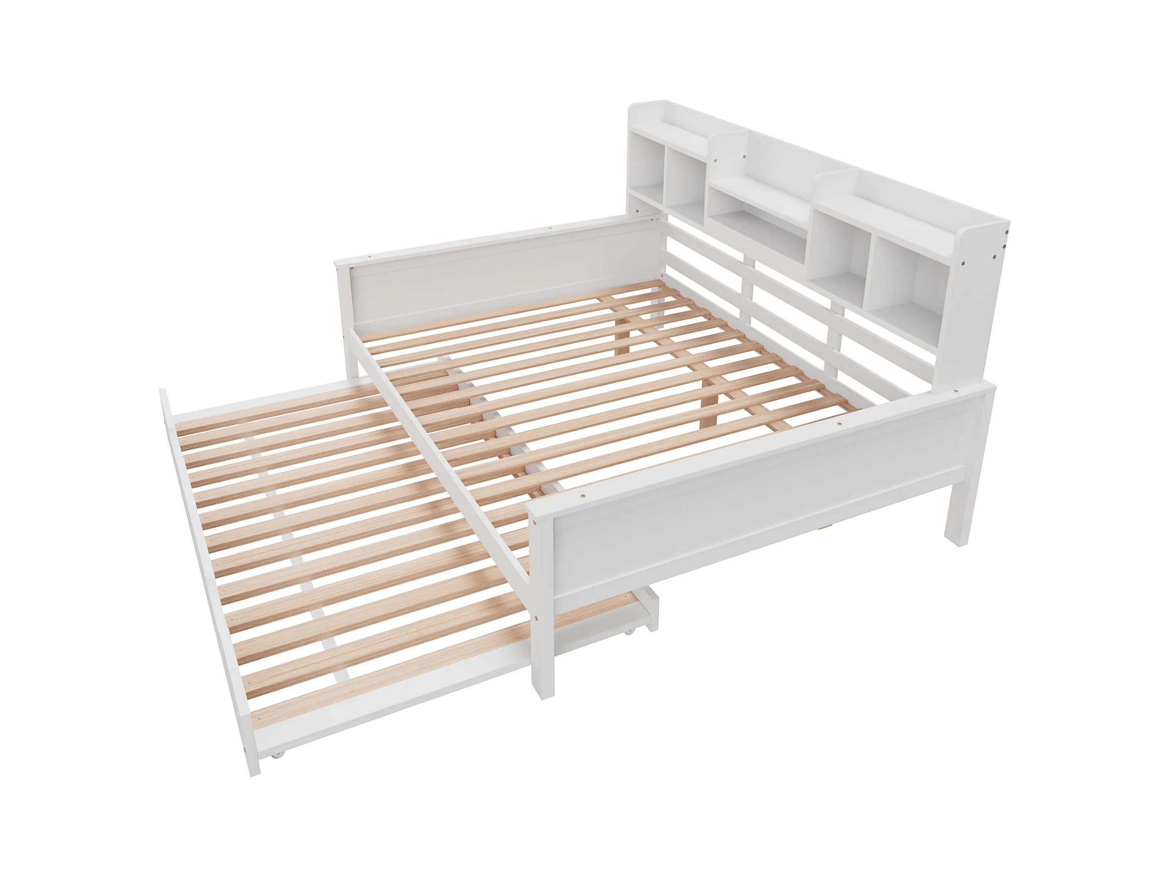 Lit banquette enfant extensible 140x200 cm avec lit gigogne 90x190 cm – bois de pin, sommier et coffre de rangement – lit multifonction blanc (sans matelas)