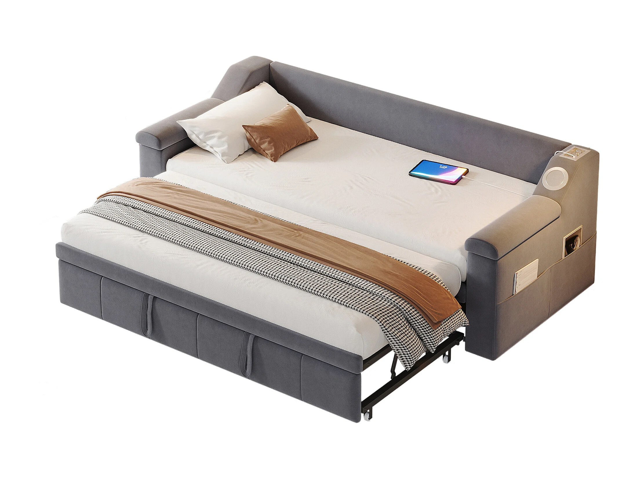 Canapé-lit rembourré 90/180x190 cm, accoudoirs épais avec stéréo Bluetooth, ports USB et rangements, velours gris