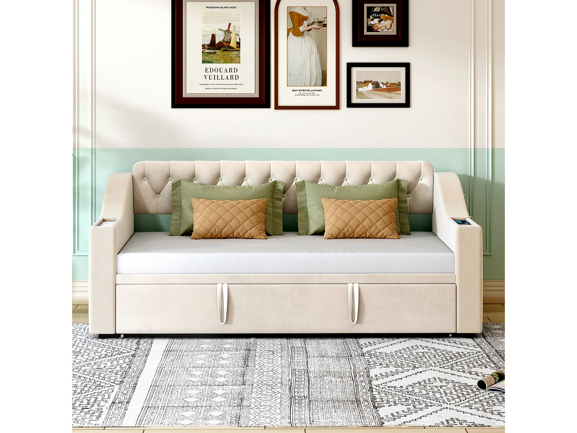 Canapé-lit rembourré 90/180x190 cm, accoudoirs larges avec port USB et rangements intégrés, velours beige