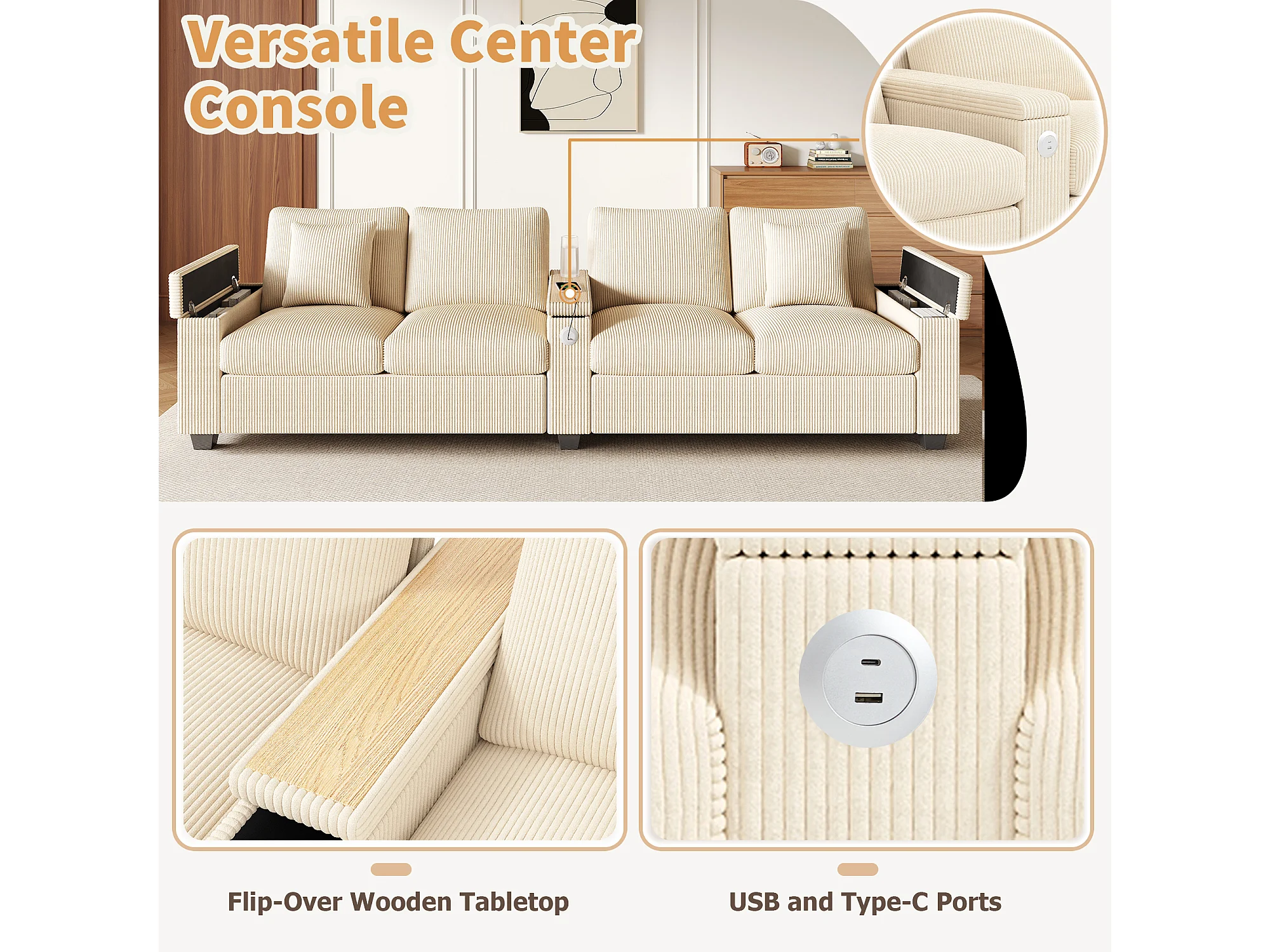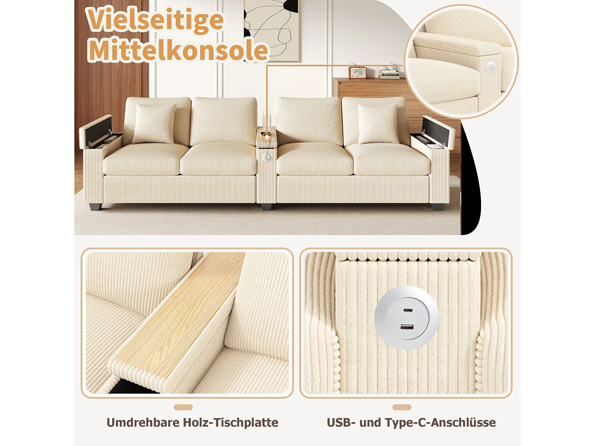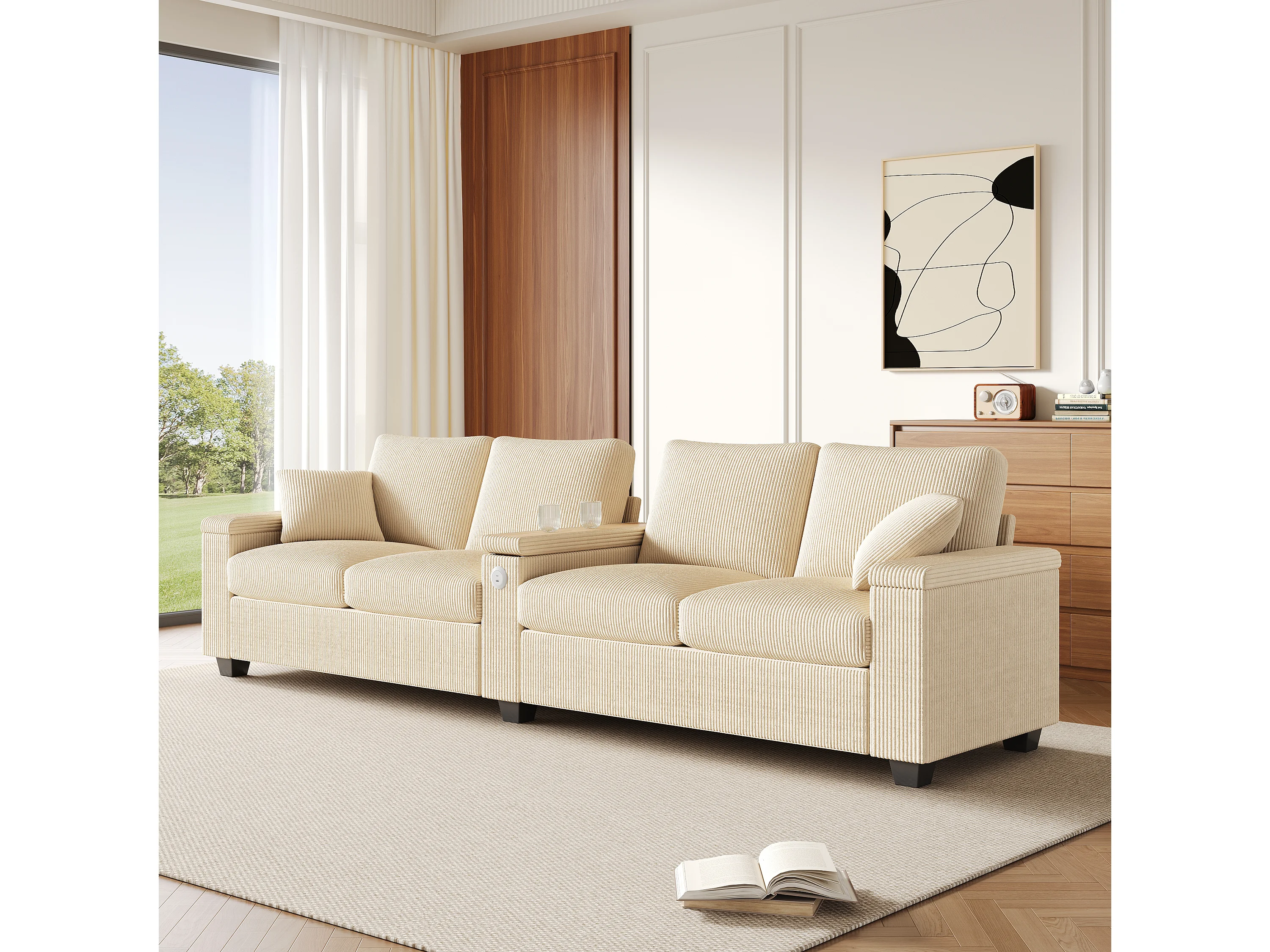 Canapé moderne 4 places - 299 x 80 x 82.7 cm - avec USB + accoudoir rabattable + rangement dissimulé - velours - beige
