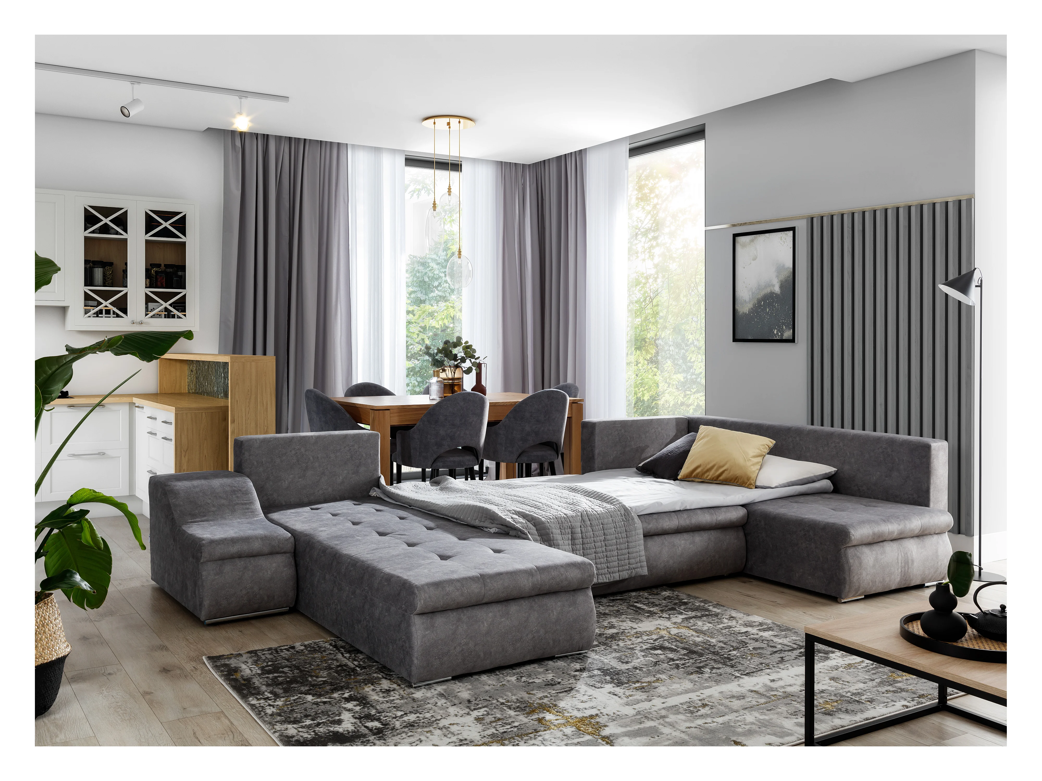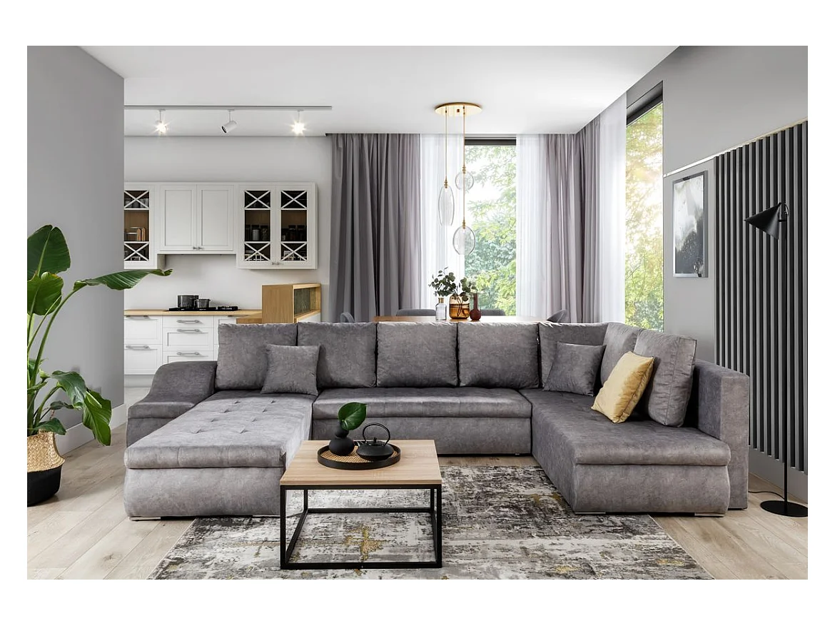 Canapé panoramique convertible JONAZ simili cuir, tissu - Rangement integré-Mauve/Rose clair-Méridienne A gauche