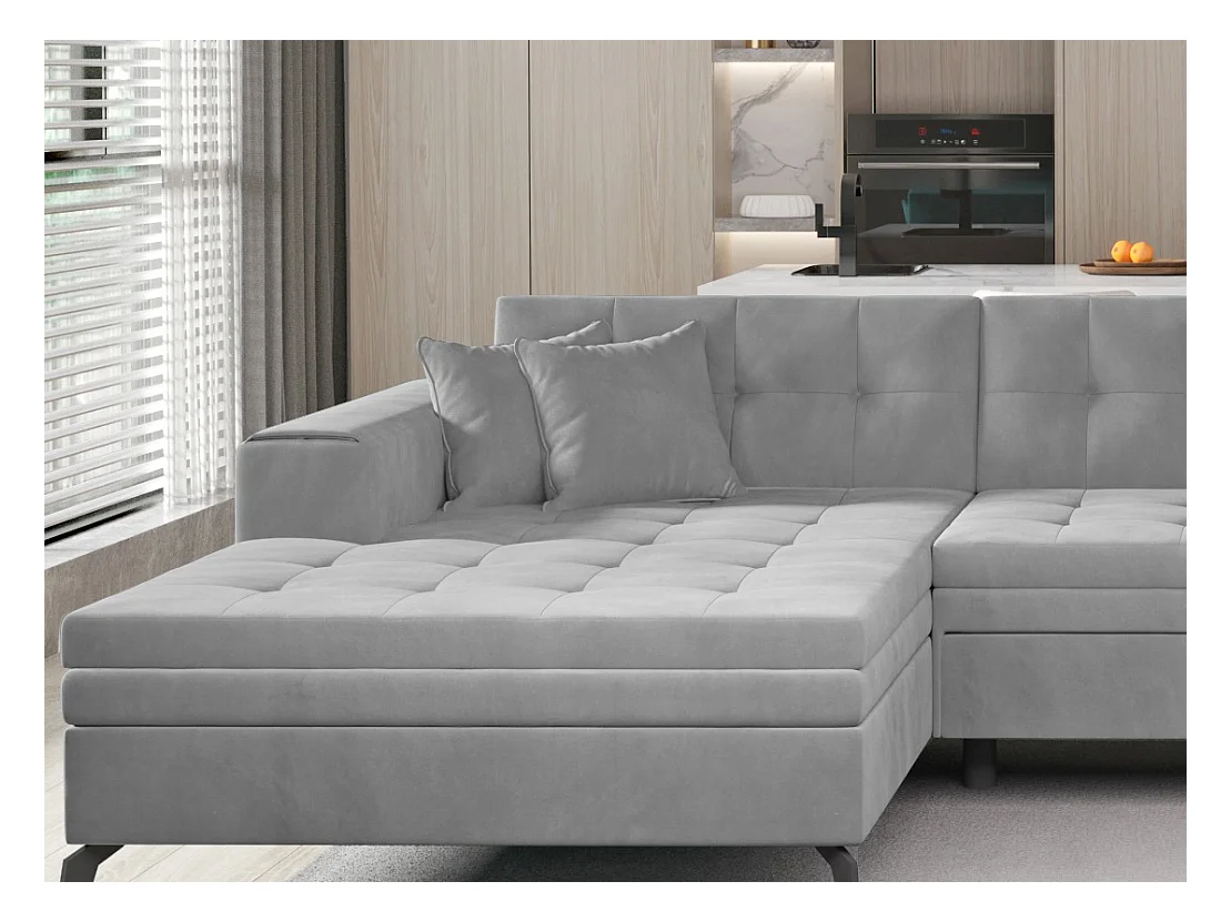 Canapé convertible capitonné angle droit tissu doux brillant gris clair Larry 260cm