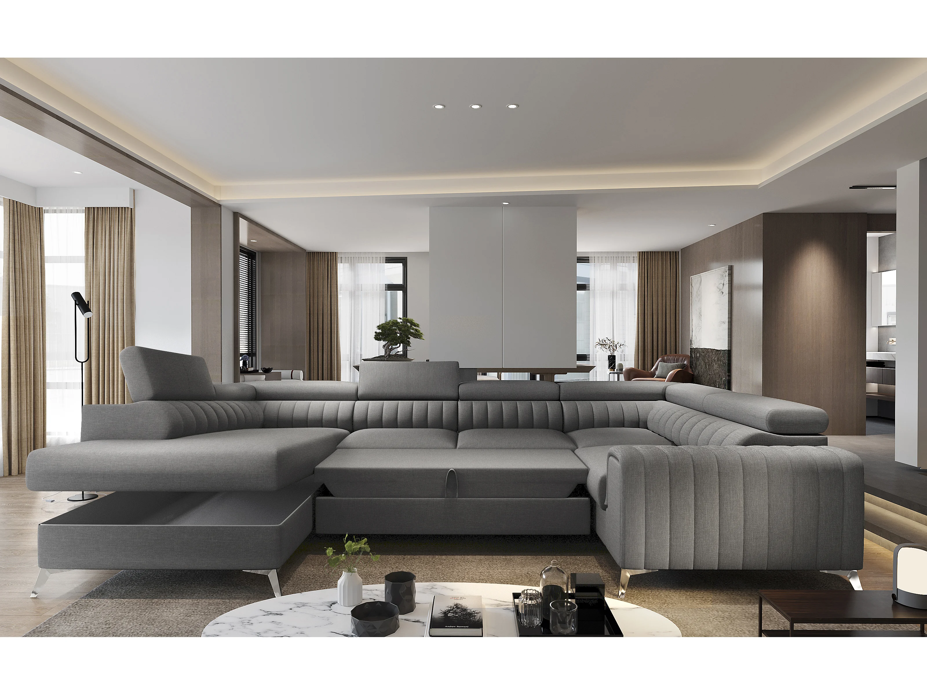 Canapé panoramique convertible LOUVE tissu - Rangement et têtières réglables-Gris clair chiné-Coffre à gauche