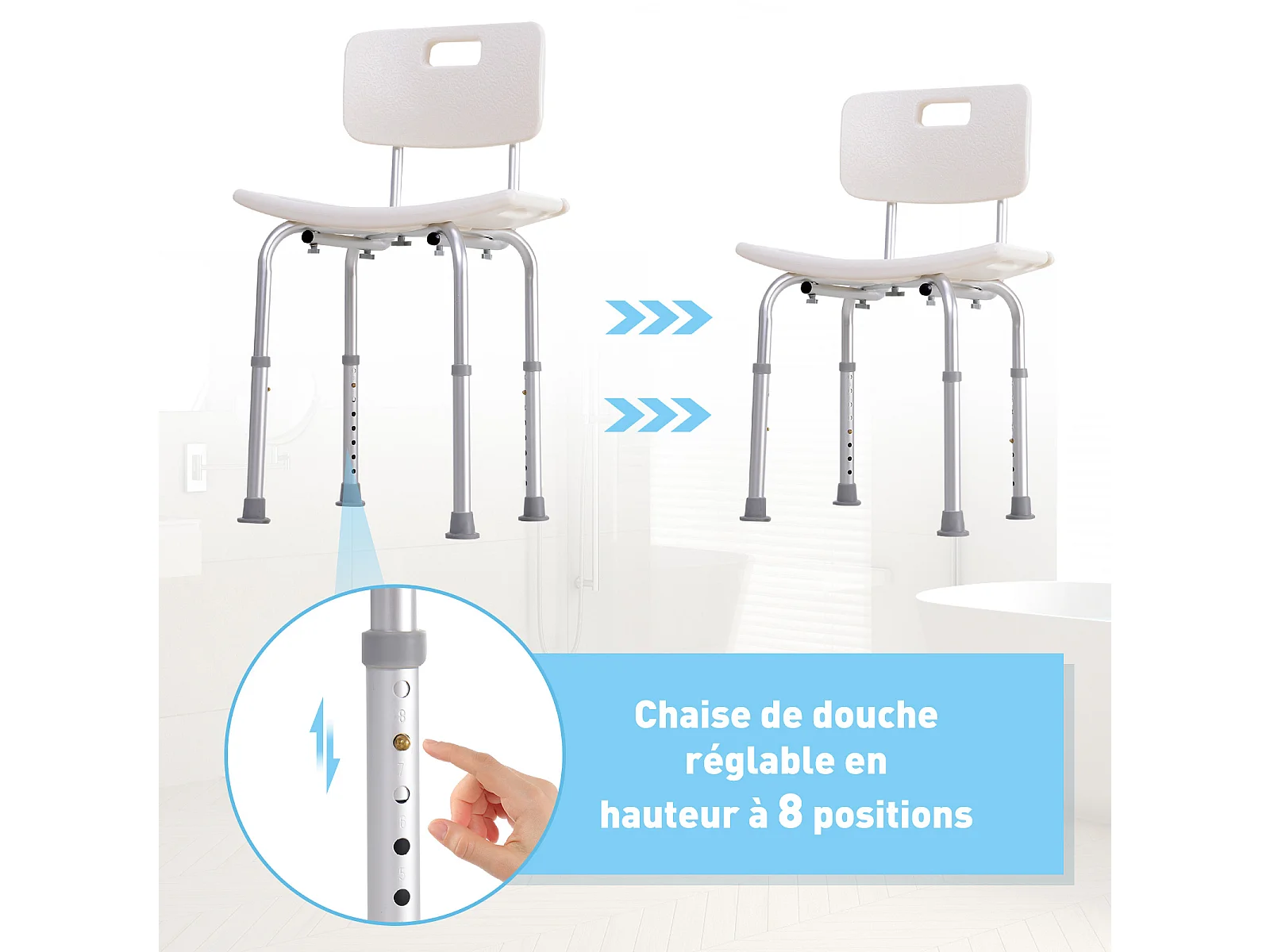 Chaise de douche siège de douche ergonomique hauteur réglable pieds antidérapants charge max. 135 Kg alu HDPE blanc