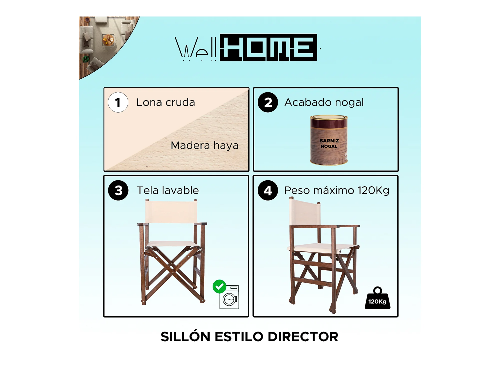 Chaise de réalisateur structure noyer et toile brute, 51x46x86 cm