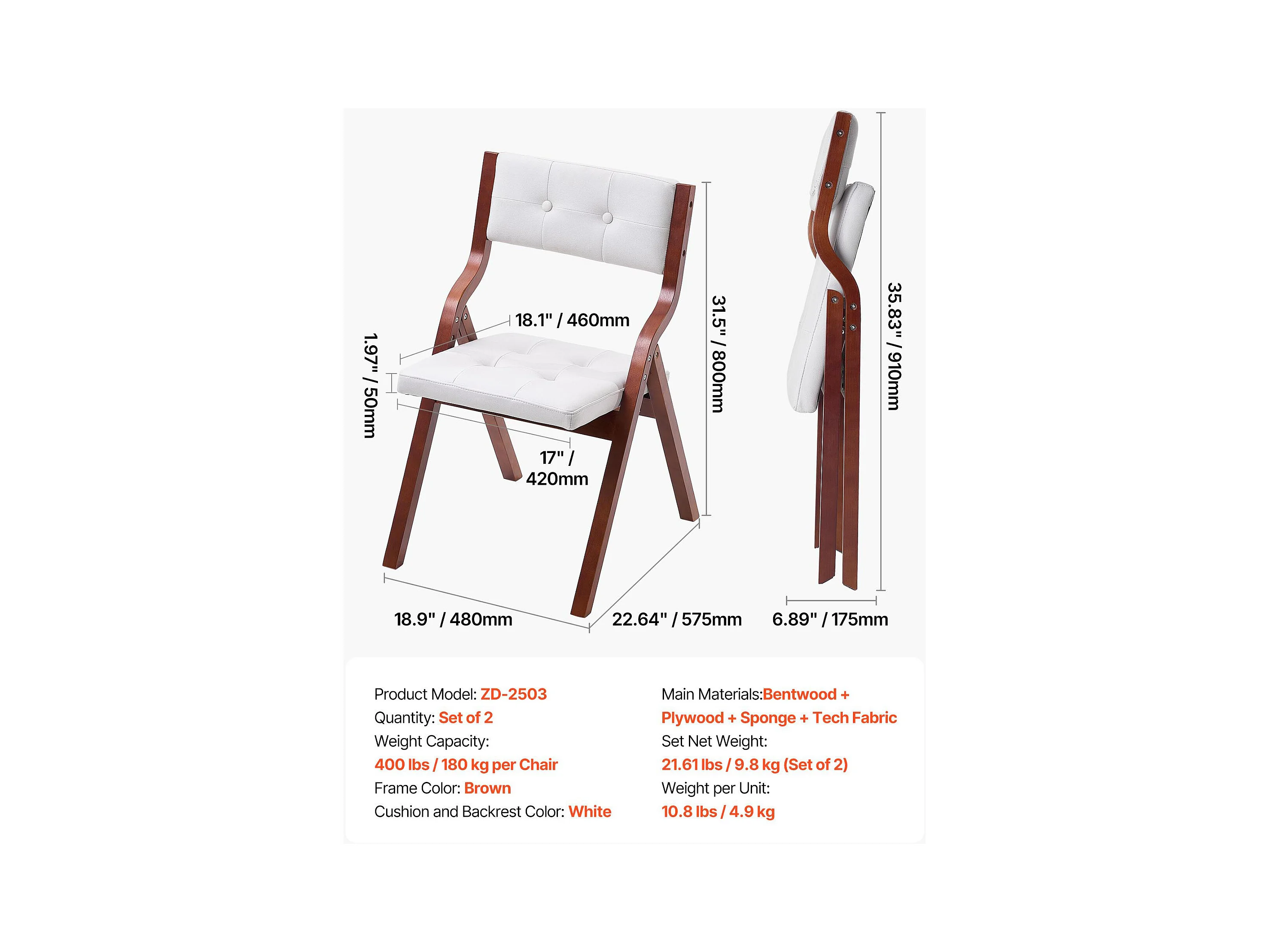 Chaise Pliante SucceBuy en Bois avec Coussin, Lot de 2, Chaise de Salle à Manger Portable Rembourrée Moderne avec Coussin d'Assise Pliable, Blanc