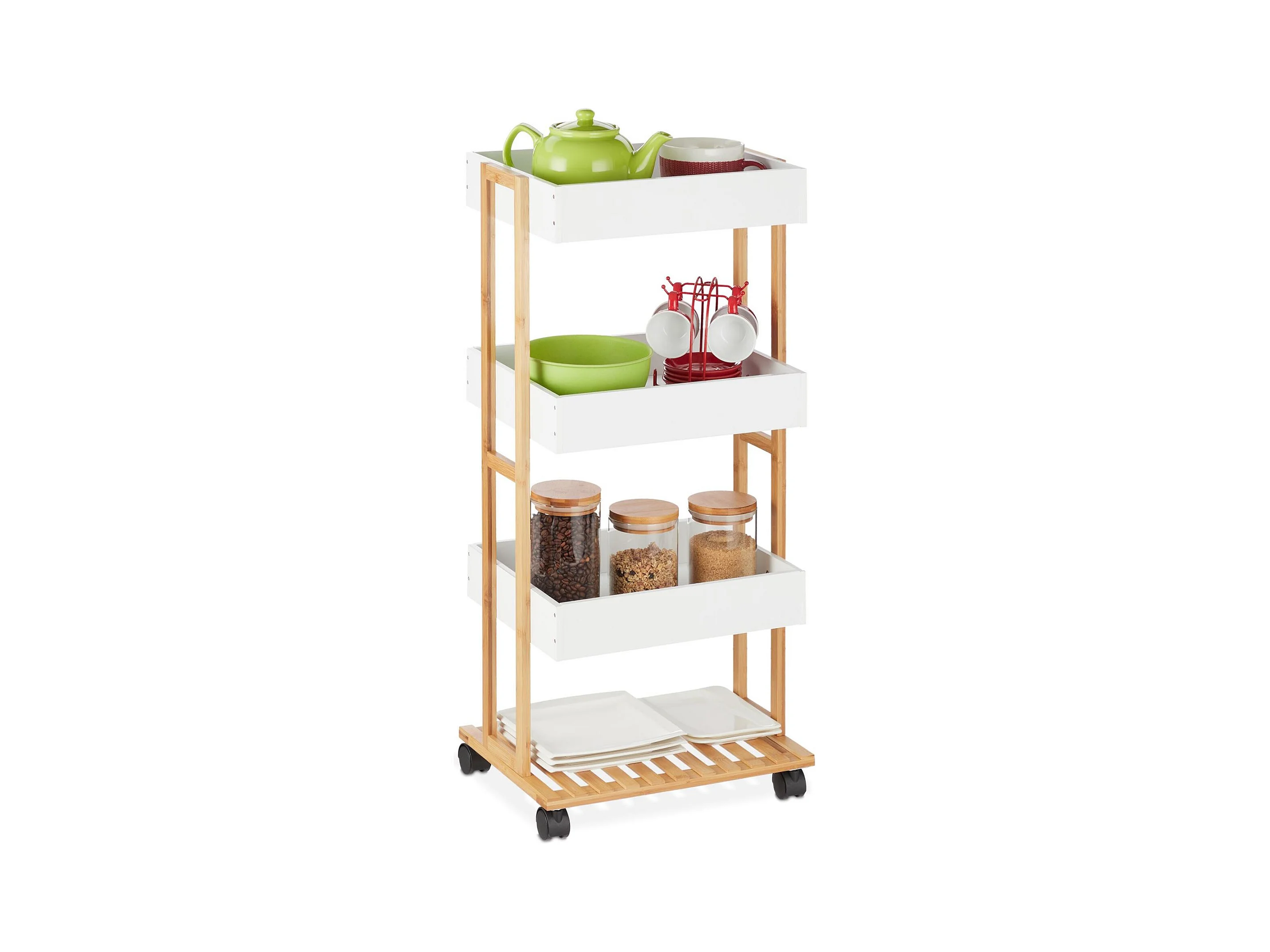 Chariot de rangement en bambou Well Home avec 1 étagère et 3 plateaux en blanc 40x30x87,5 cm