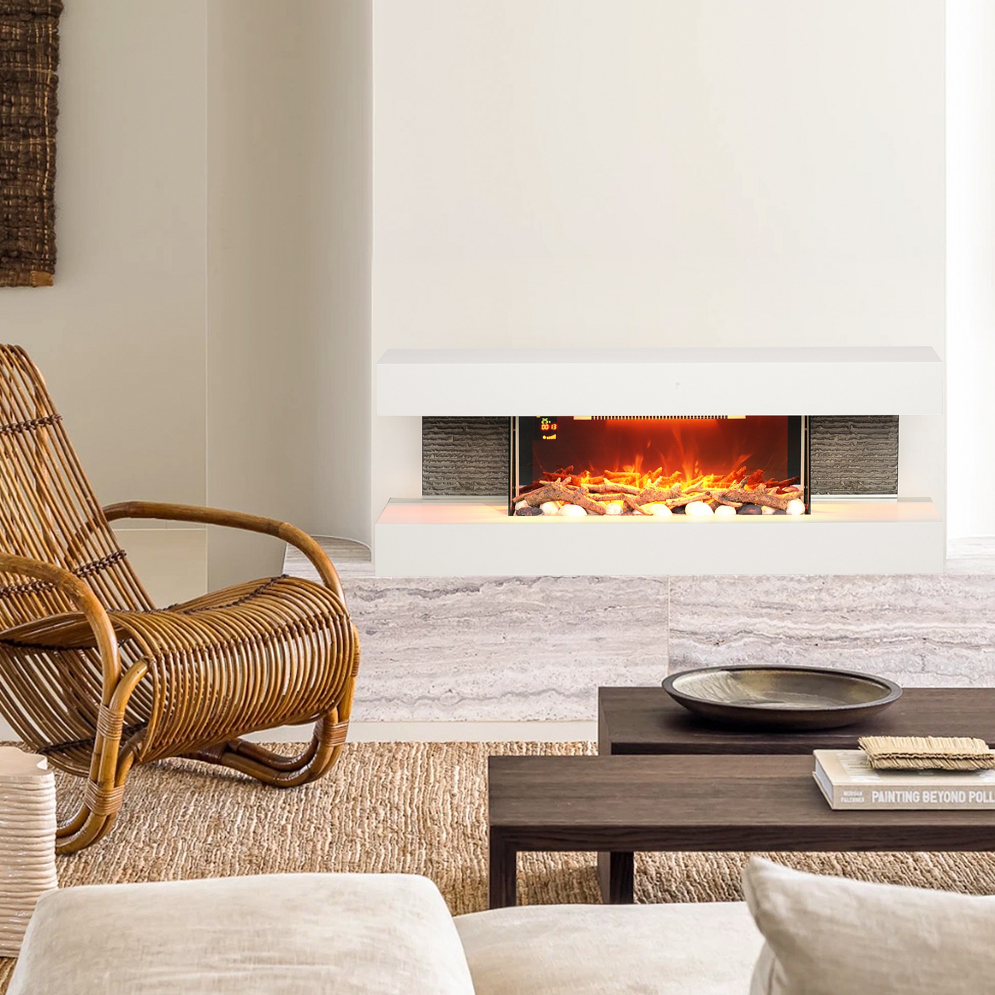 Cheminée électrique design contemporain 2000W effets flammes LED 3D dim. 119L x 30l x 45H cm éléments décoratifs télécommande inclus blanc