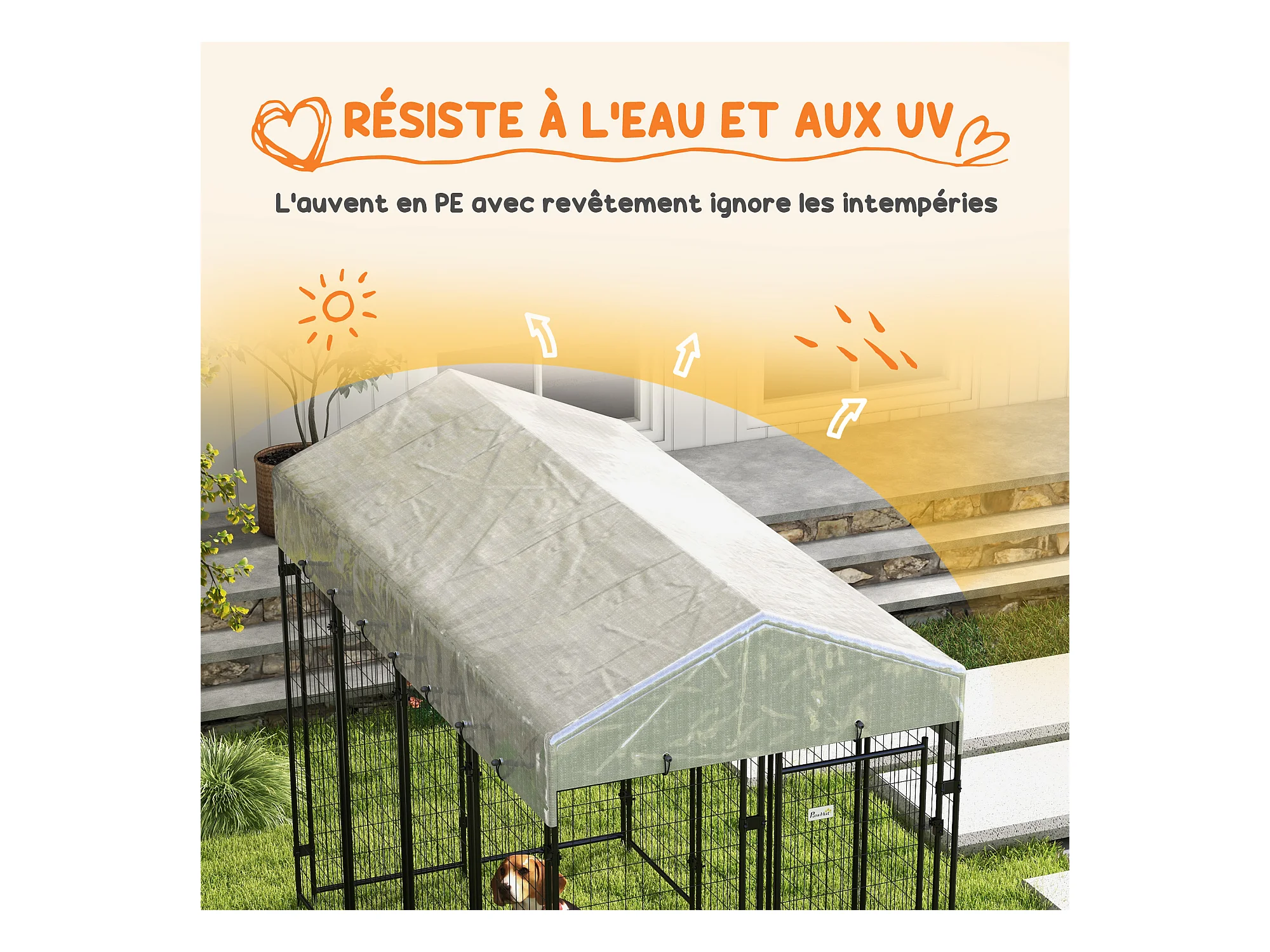 Chenil extérieur pour chiens en métal et tissu oxford avec support gamelle et toit résistant aux intempéries espace spacieux 141L x 141l x 151H cm noir
