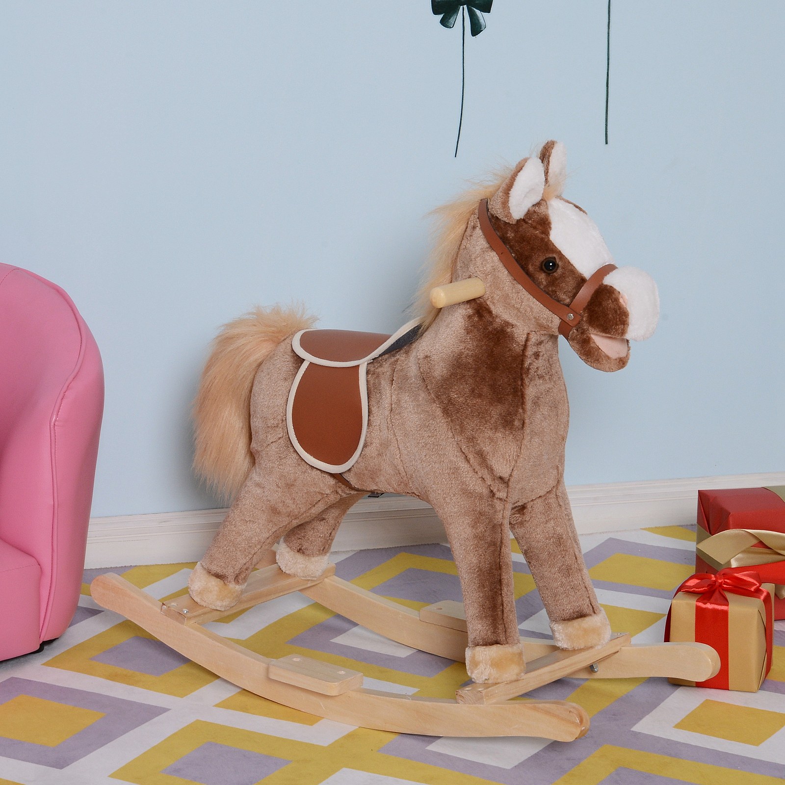 Cheval à bascule cheval de cowboy selle grand confort peluche courte douce bois peuplier brun blanc