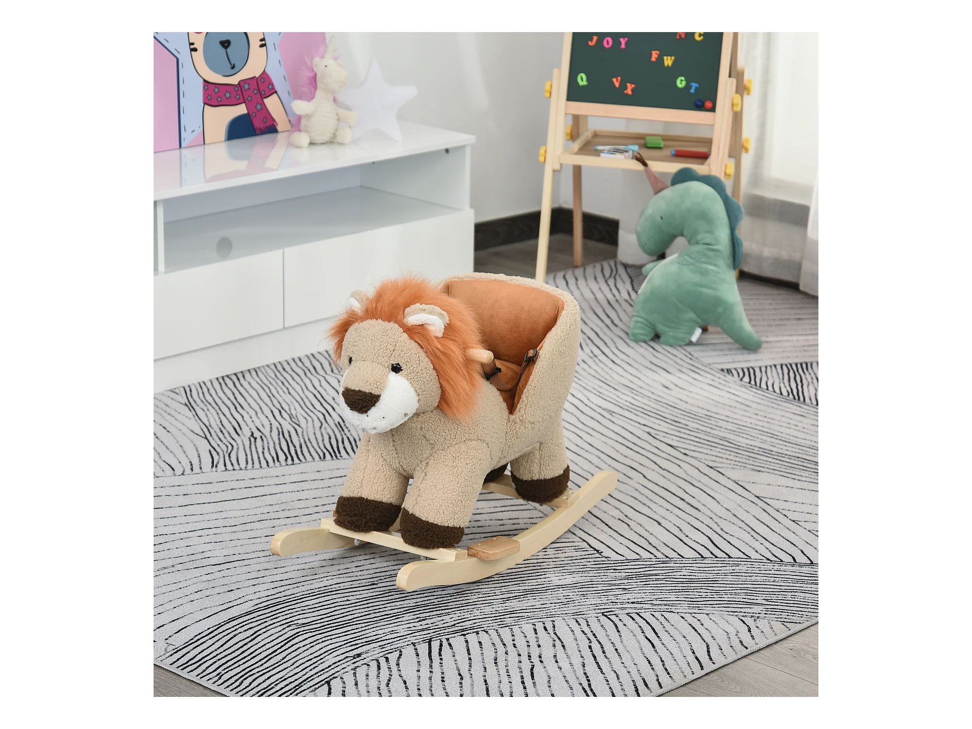Cheval à bascule modèle lion fonction musicale selle grand confort peluche courte douce bois peuplier marron dim. 68L x 35l x 50H cm