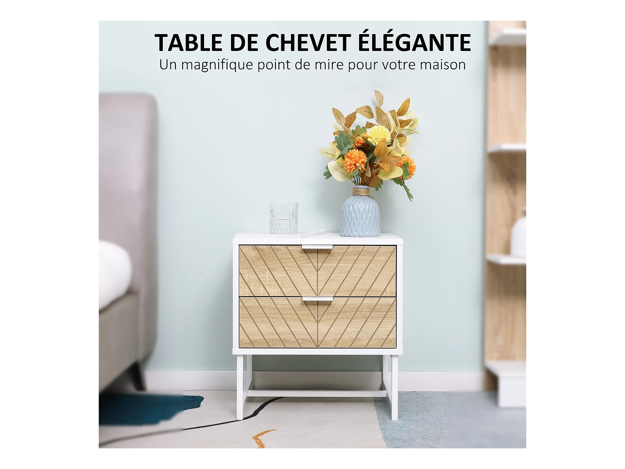 Chevet table de nuit style graphique - 2 tiroirs façades chevrons - acier blanc aspect bois clair