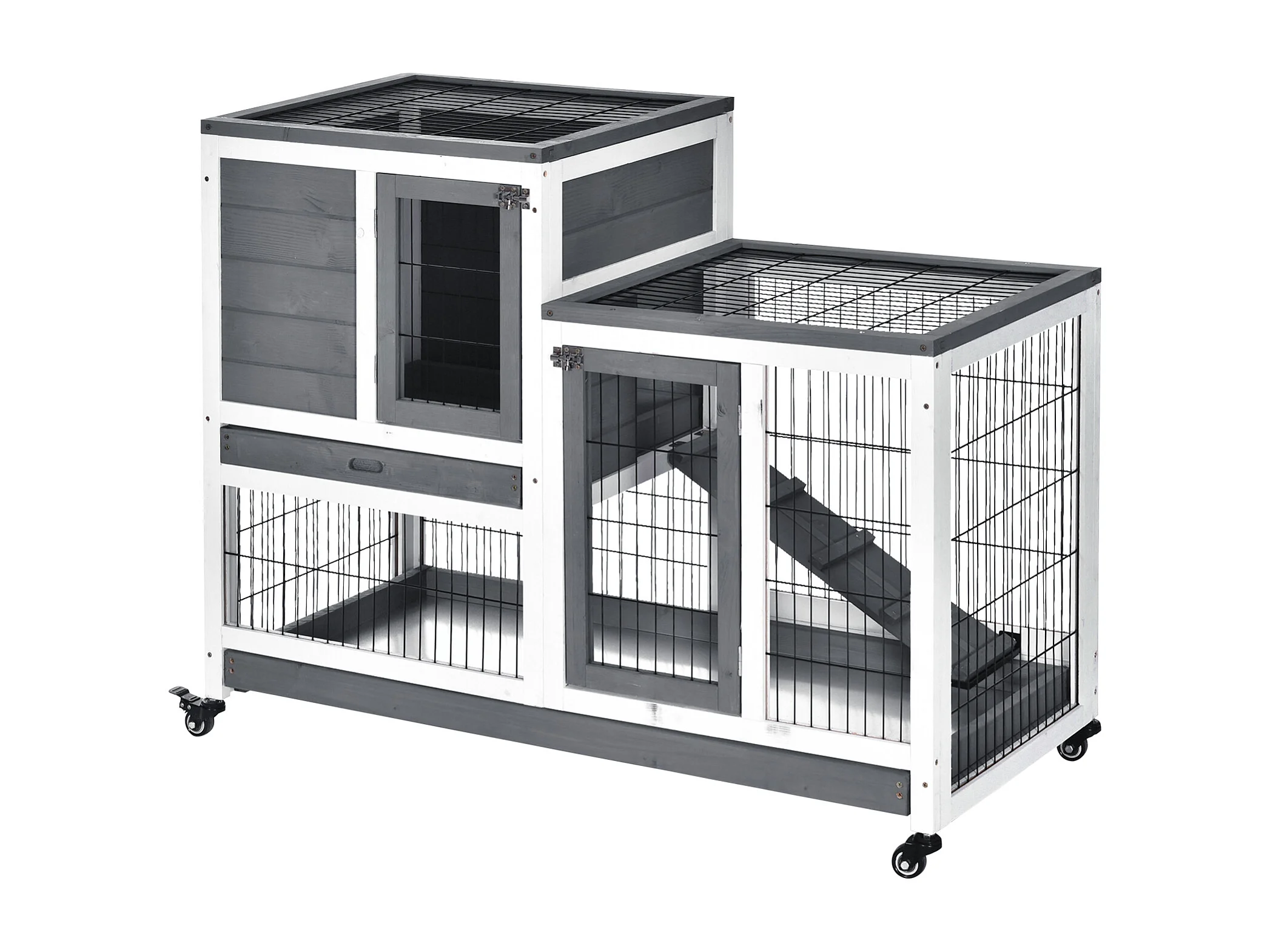 Clapier à lapin sur roulettes cage à lapin 2 étages 2 portes verrouillables 2 plateaux coulissants rampe bois de sapin gris blanc